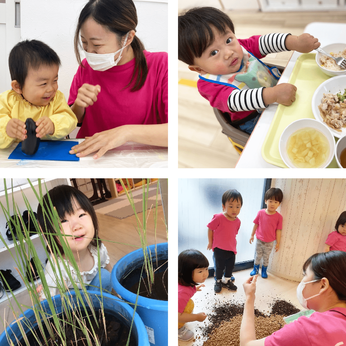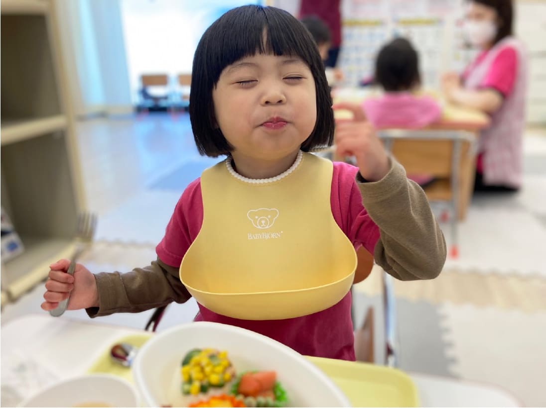 子ども達自身が食材を育てる体験、食事のマナーなど身につけます。園内のキッチンで愛情込めて作っています 昼食、おやつは全て園内調理し、出来立ての温かいお食事をご用意いたします。
