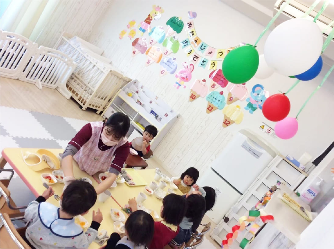 規定の保育士人数にプラスして保育補助を配置しております。掃除、洗濯、行事の準備等をはじめ、子どもと一緒に遊んだり、寝かしつけやおむつ替え、食事のサポート等担任と連携を取り、保育環境を整えてます。