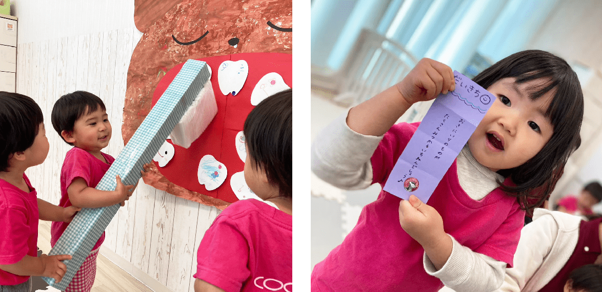 絵本やダンス、フラッシュカードなどを使い、遊びの中で学びを深めます。COCORO流 「英語で学ぶ」5ヶ条