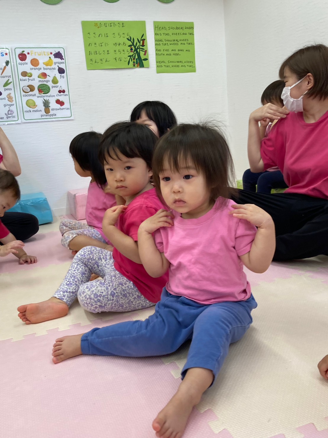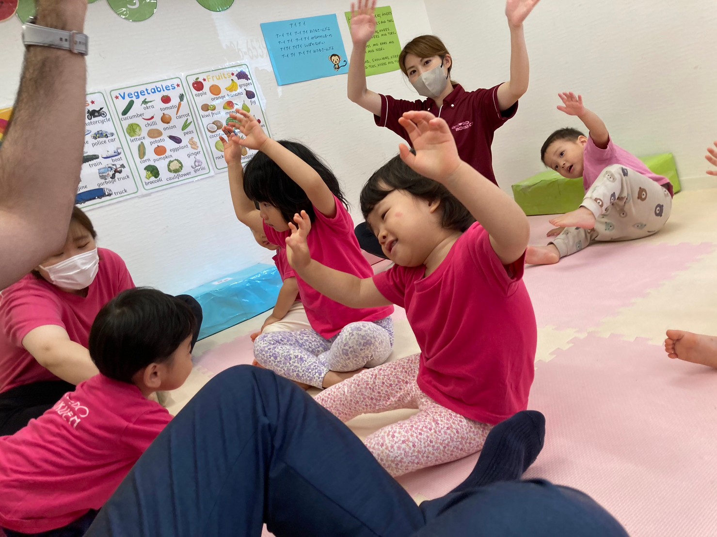 eyes(目)、nose(鼻)、mouth(口)、handss(手)、feets(足)、knees(膝)など、歌に合わせて触ったり、動かしたり、上手に真似して踊っていました。