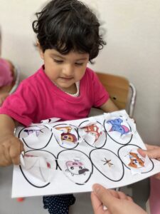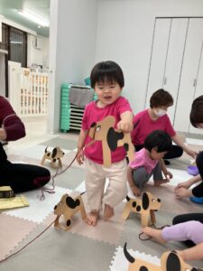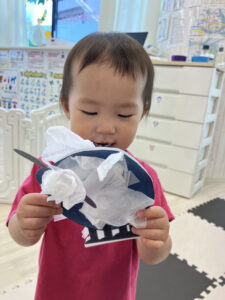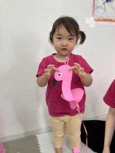 今月のテーマは動物、また母の日にちなんで家族の呼び方も紹介しました。指人形をつけて歌うFamily finger songは子どもたちのお気に入りで、進級した子どもたちが口ずさんだりして、楽しく手遊びができました。動物は「ペット」「牧場」「動物園」のグループに分けて、一週間に一つのグループずつテーマにしました。ペットの週に作った犬のクラフトが大人気で、ひも引いてお散歩ごっこを楽しんでいました。みんなとても可愛かったです。みんな動物を見るのも、真似するのも大好きなので、毎回楽しいレッスンになりました。