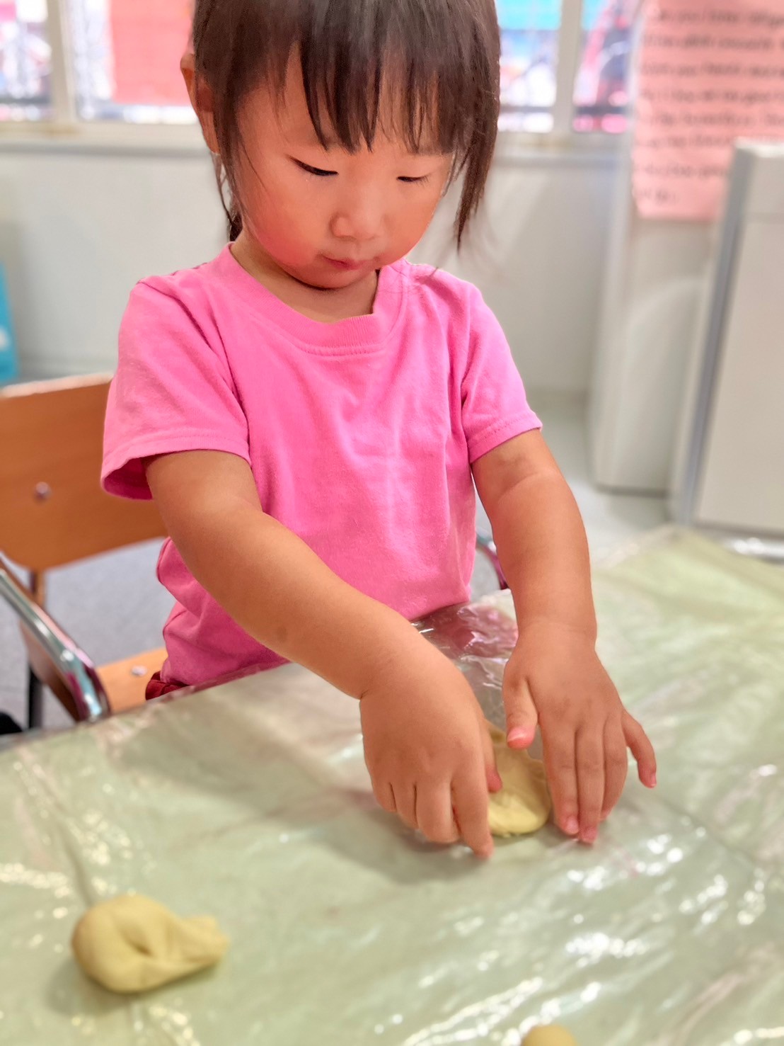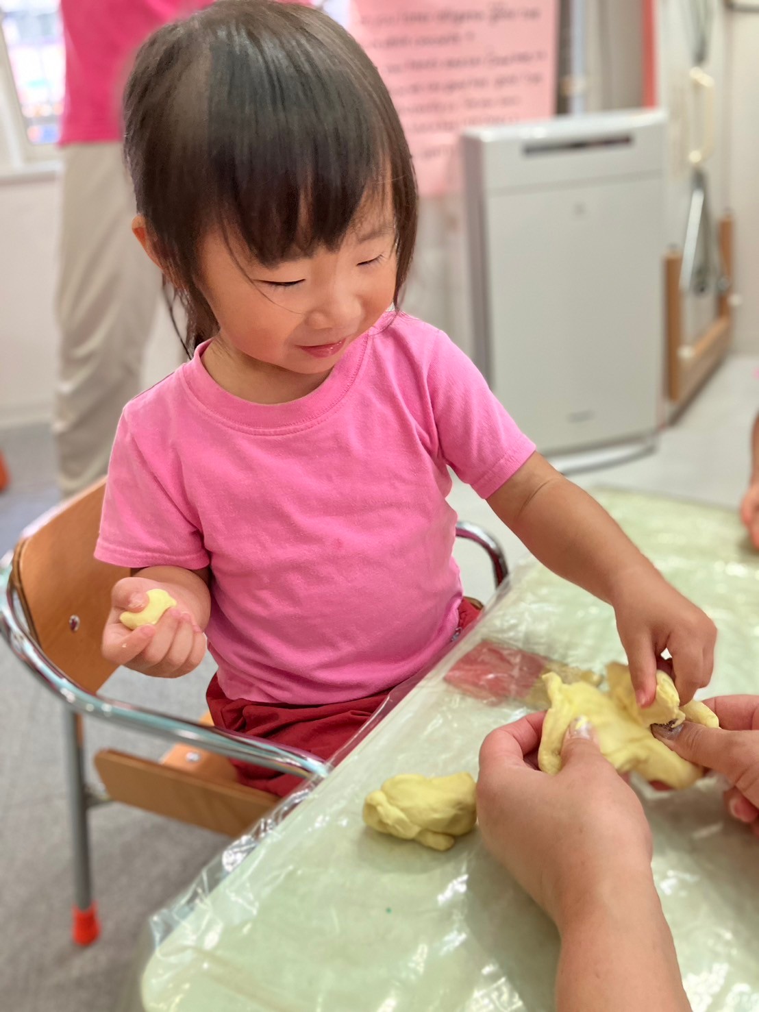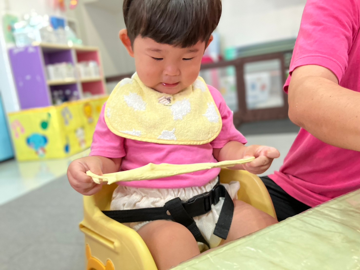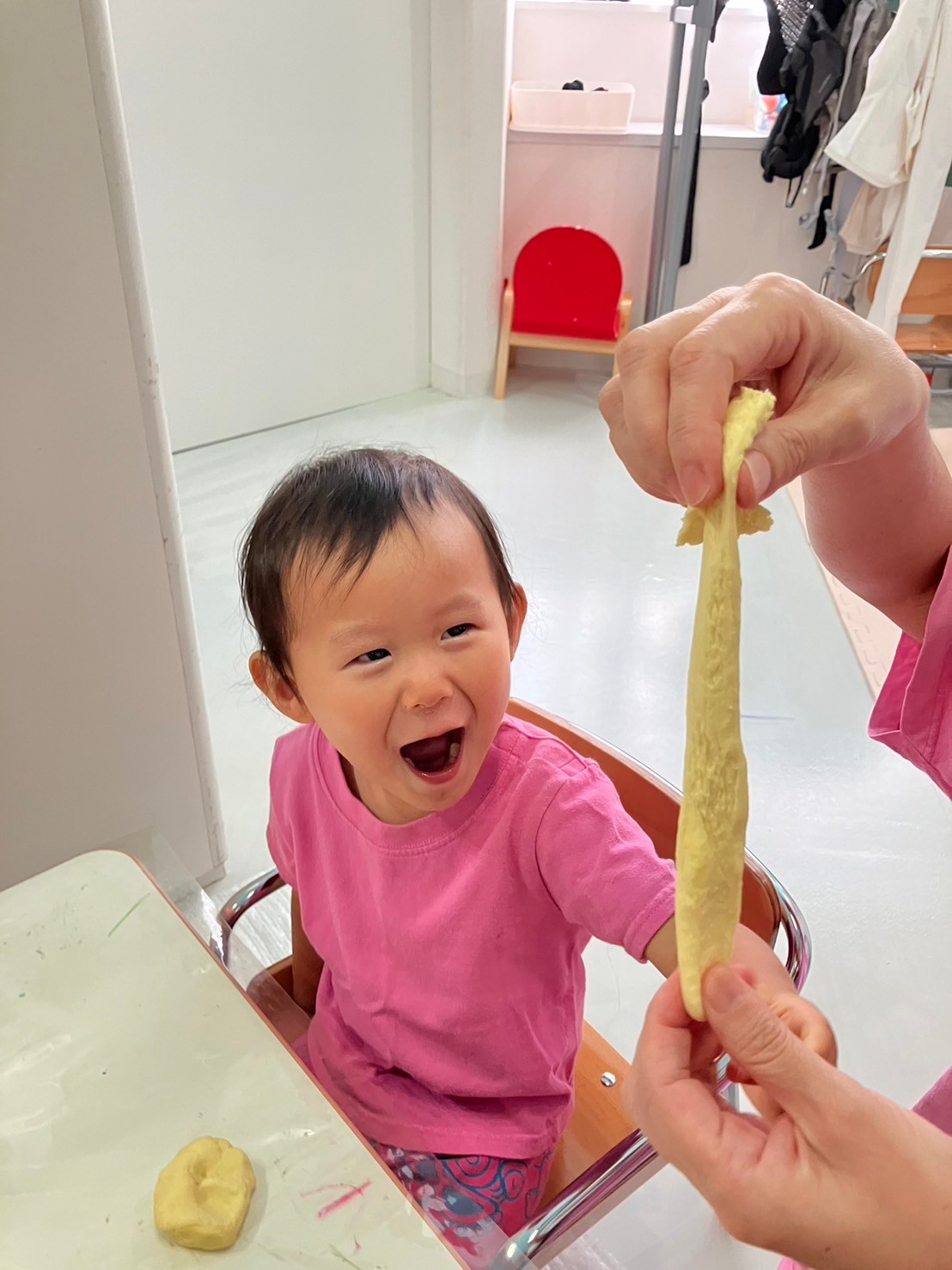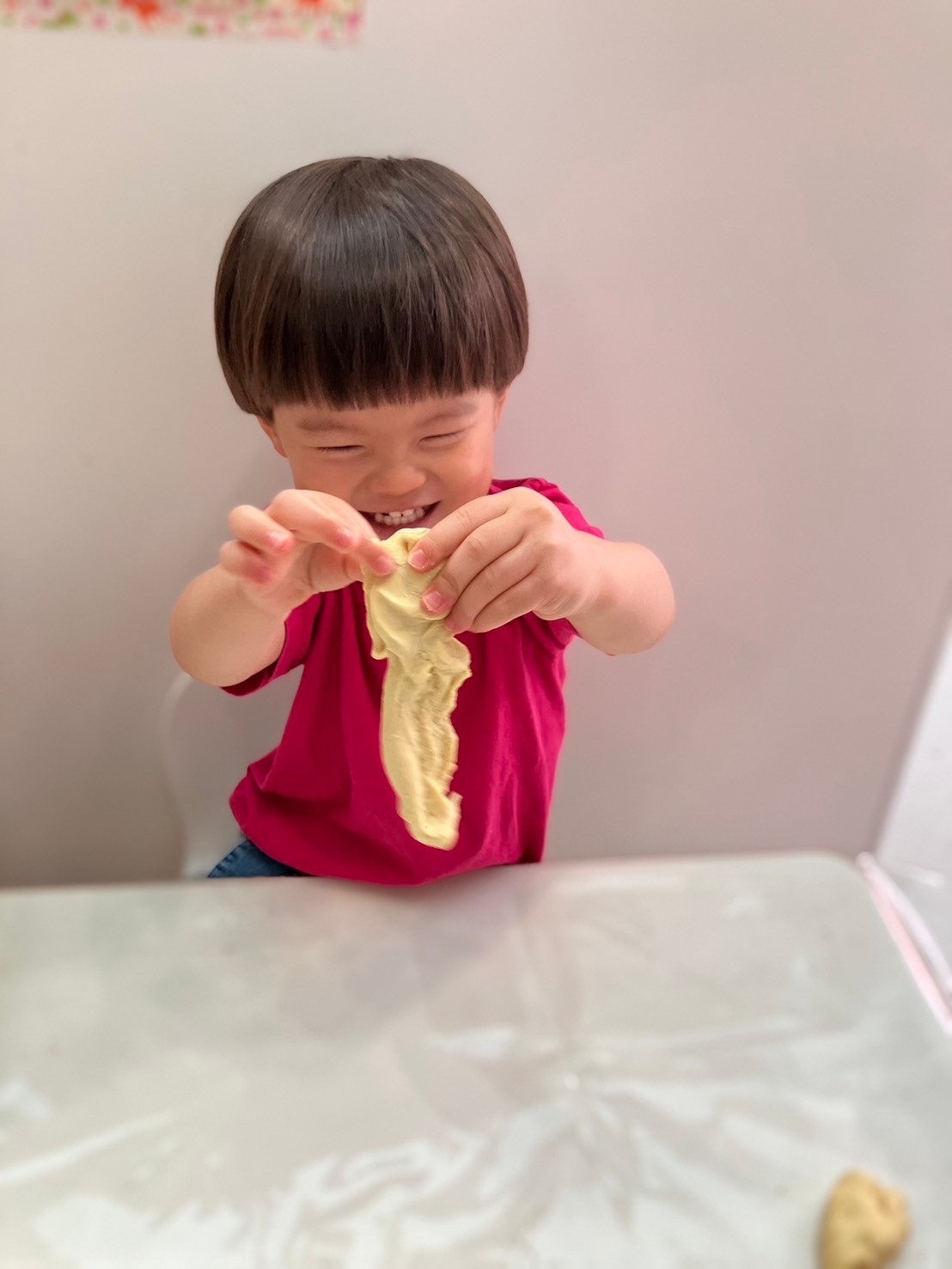もちもちした小麦粉粘土を触ってとても気持ちよさそうです♡