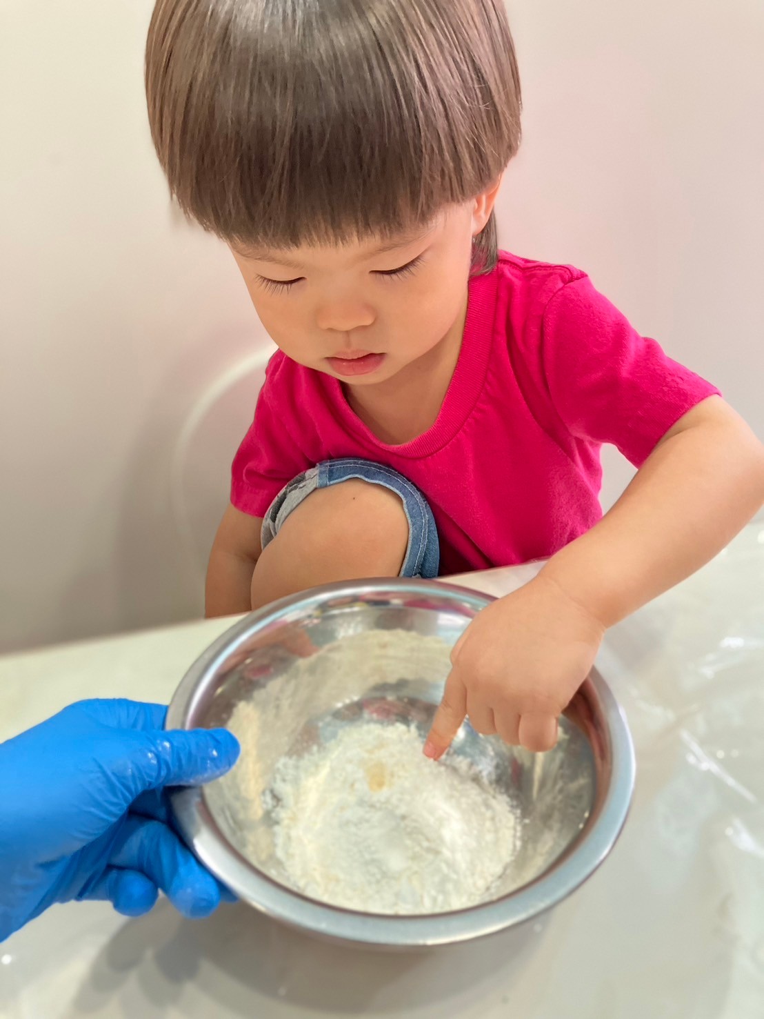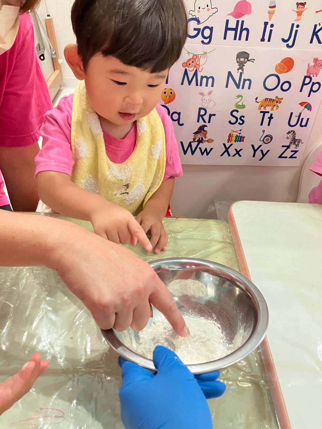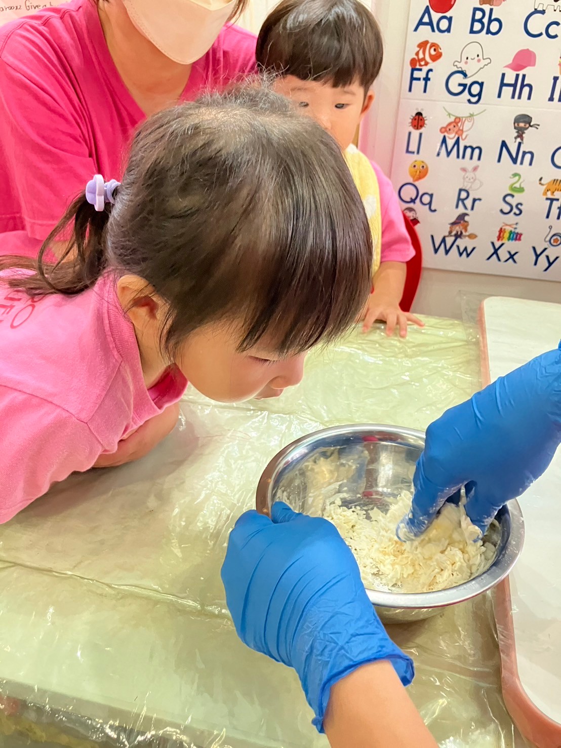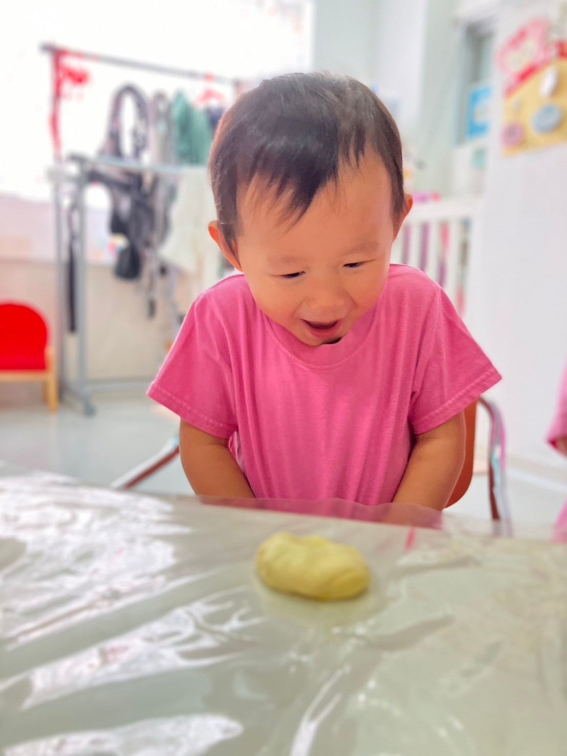 もちもちした小麦粉粘土を触ってとても気持ちよさそうです♡