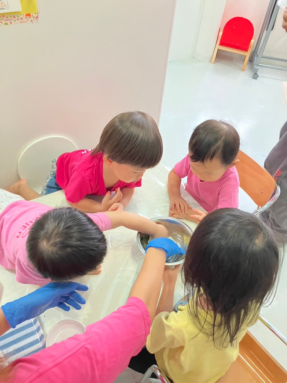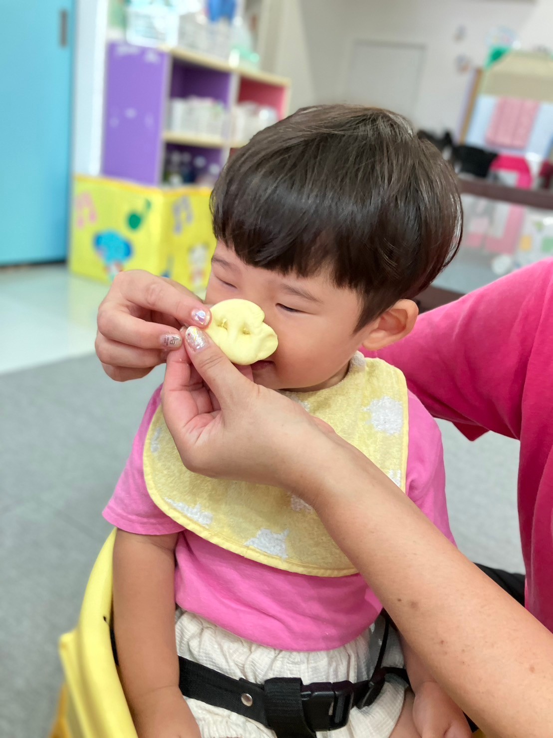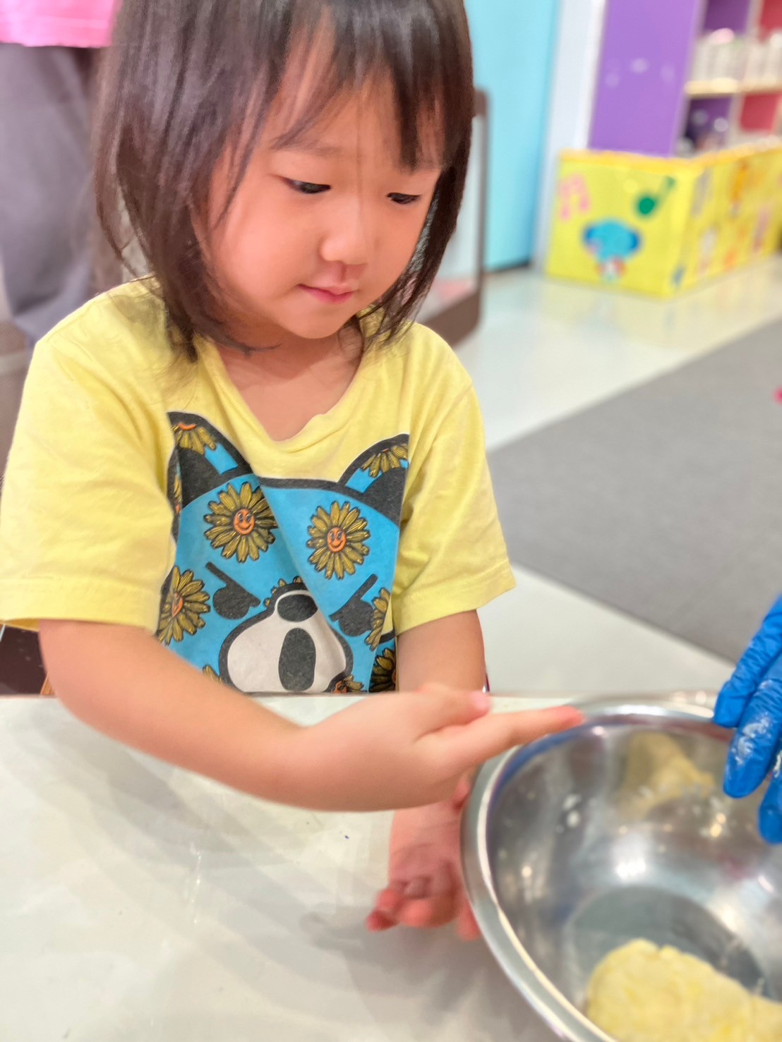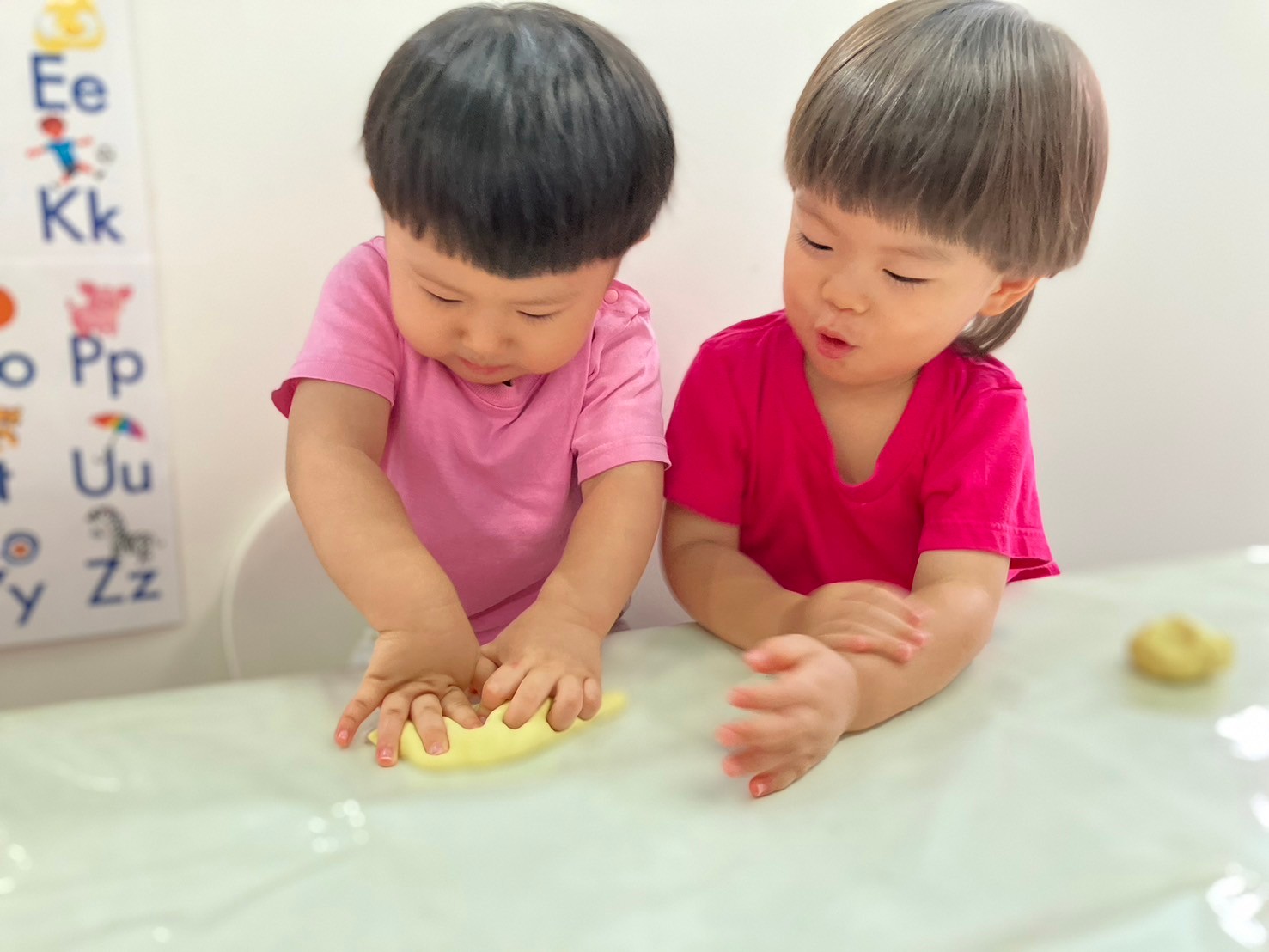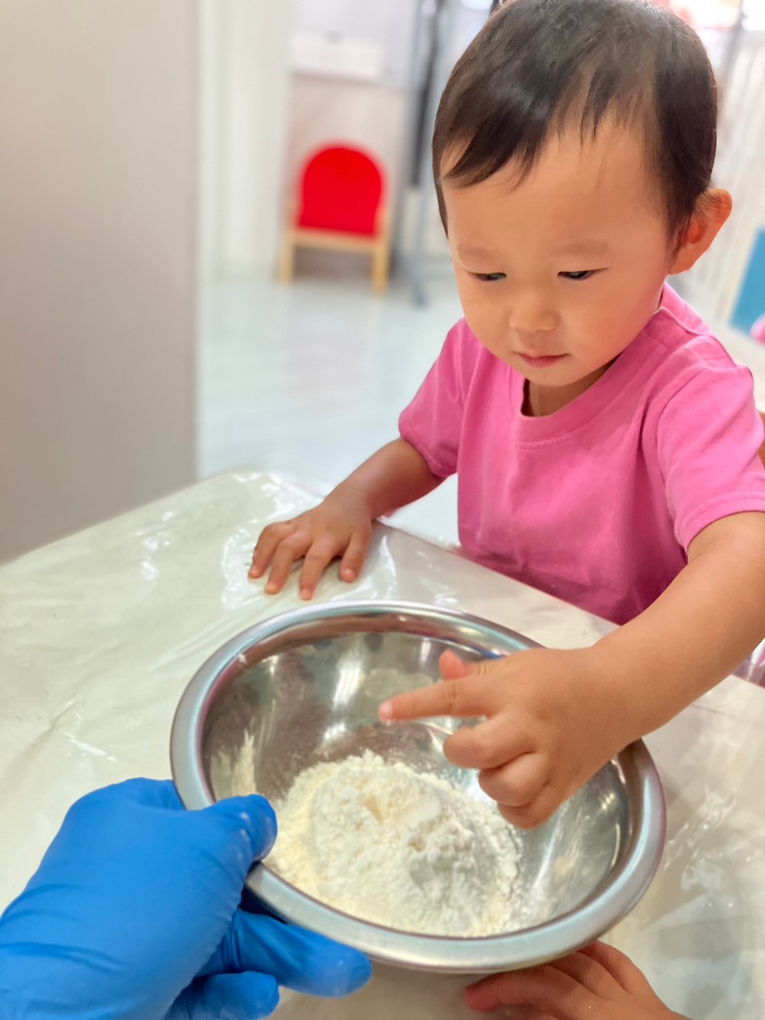 もちもちした小麦粉粘土を触ってとても気持ちよさそうです♡
