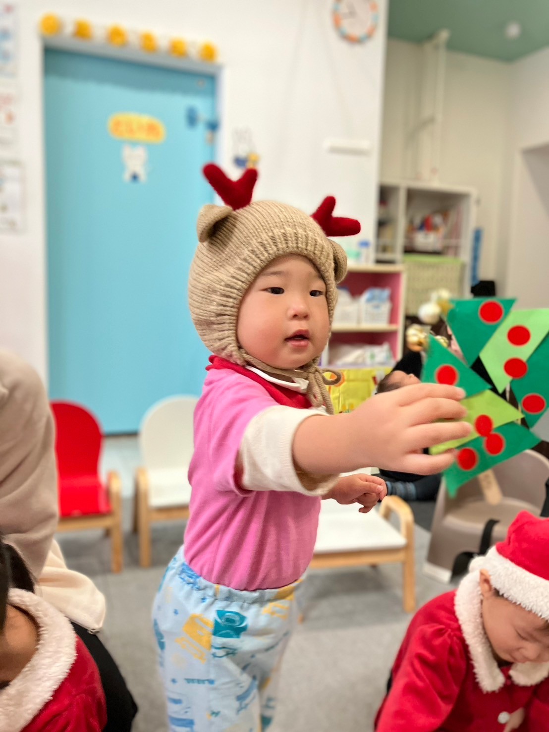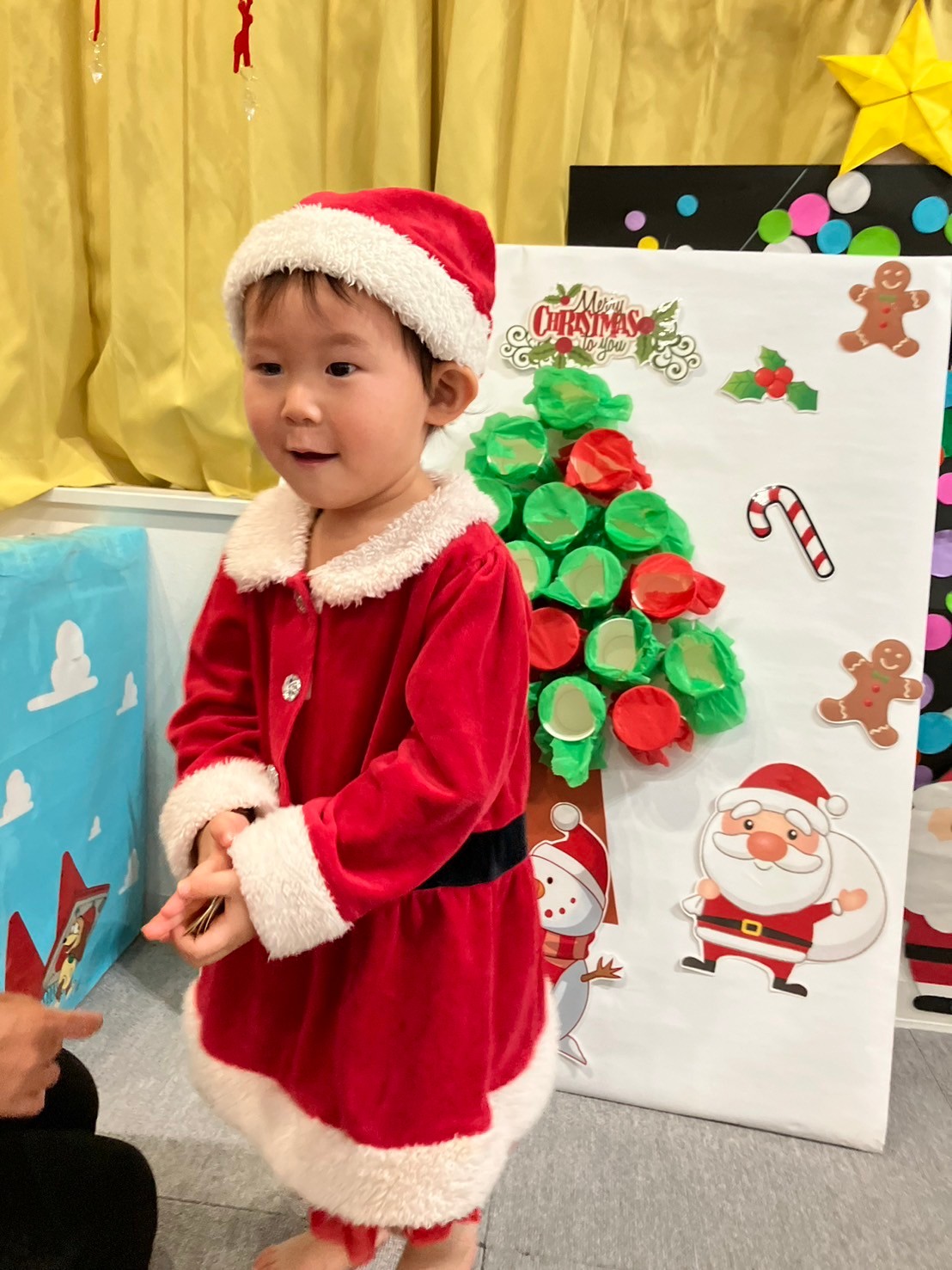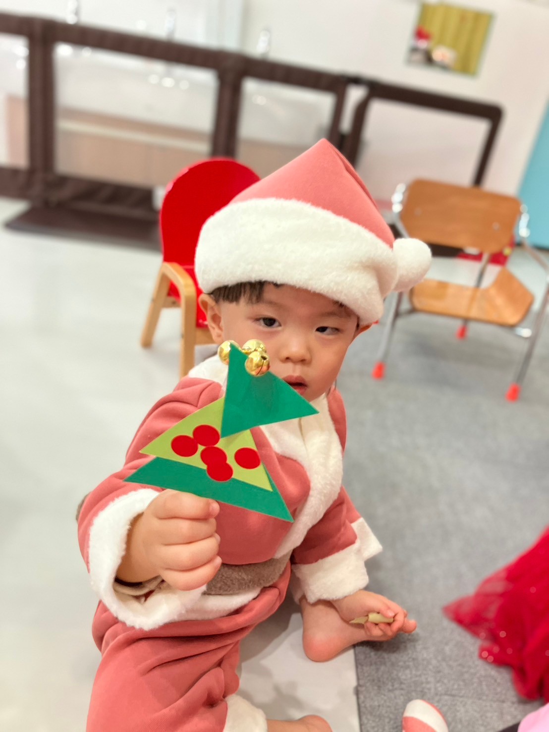 クリスマス会では、サンタさんの衣装を着てダンスを踊ったり、鈴のついたクリスマスツリー作ったりしました。