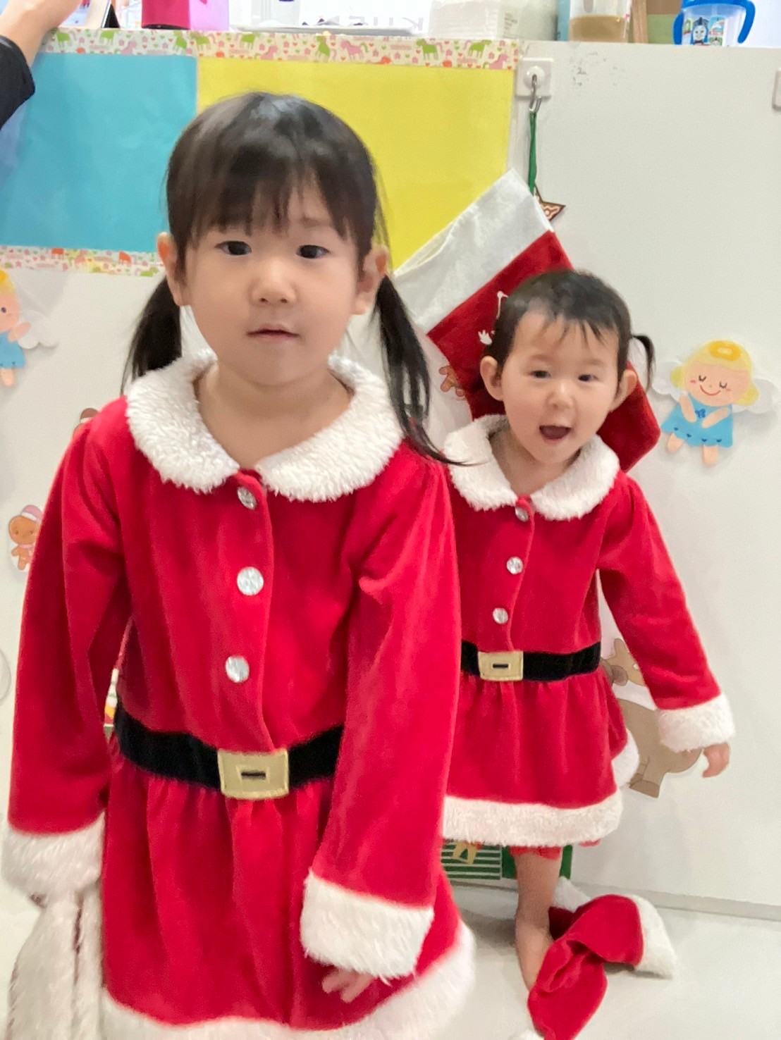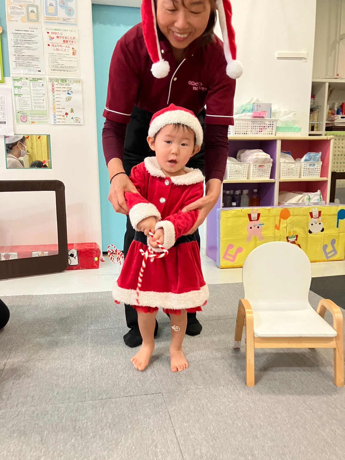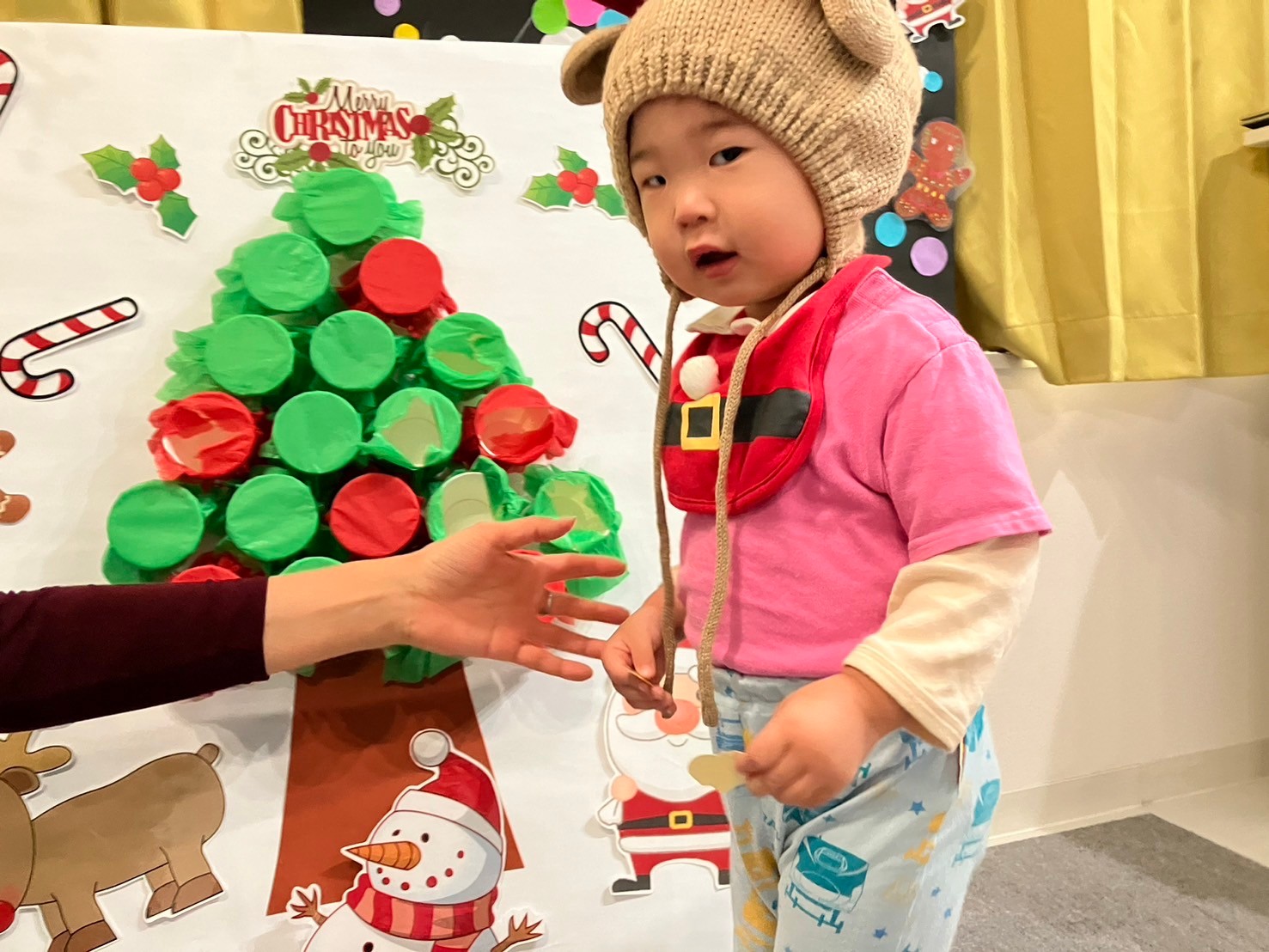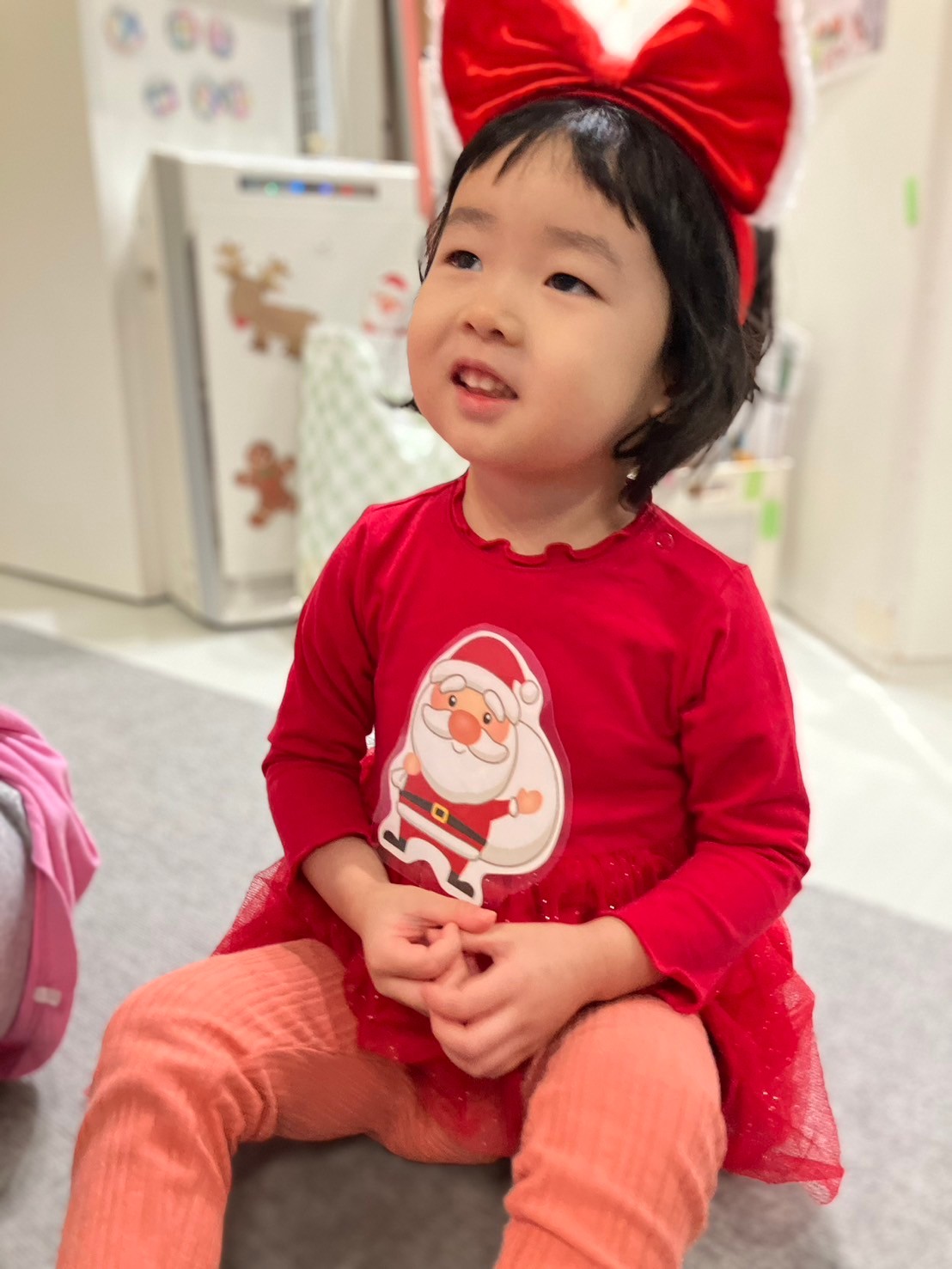 クリスマス会では、サンタさんの衣装を着てダンスを踊ったり、鈴のついたクリスマスツリー作ったりしました。
