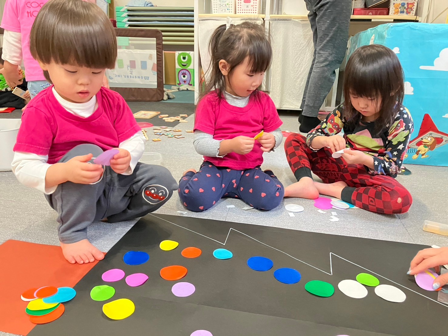 色とりどりの丸い折り紙を白い枠の中や外にペタペタ貼ってツリーの完成⭐︎