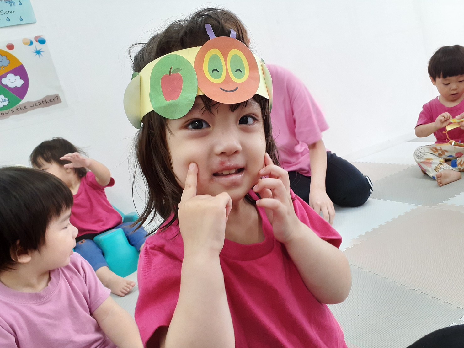 エリックカールの絵本 The Very Hungry Caterpillar(はらぺこ あおむし)では、曜日や数字、果物の名前を英語で言ったり、あおむしのかぶり物を作ったりしました。