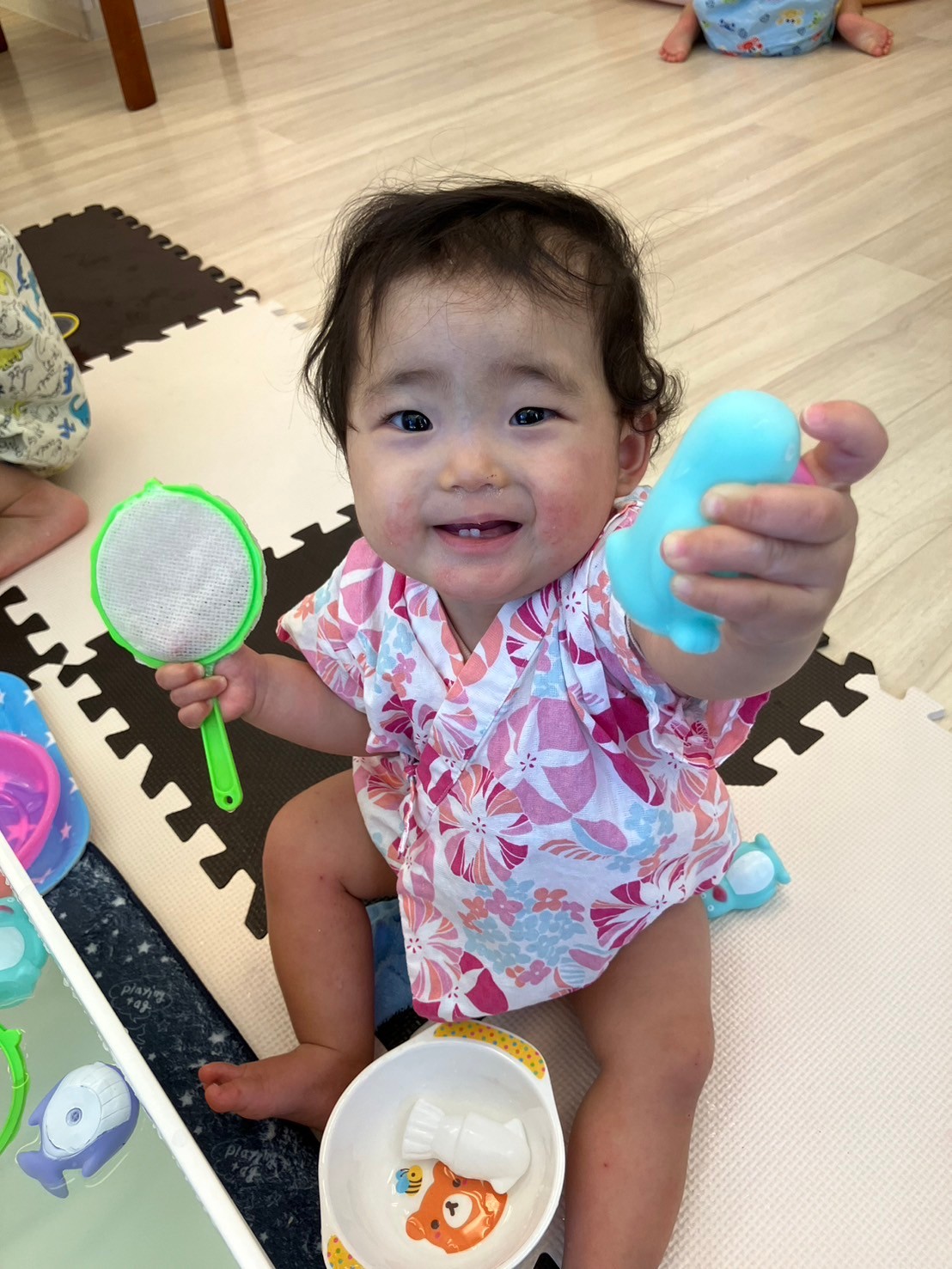 一点を見つめ真剣な眼差しでヨーヨーをすくう姿が可愛かったです。また、魚釣りでは、慣れた手つきで竿やポイを持ち、器から溢れるほど沢山釣っていました。