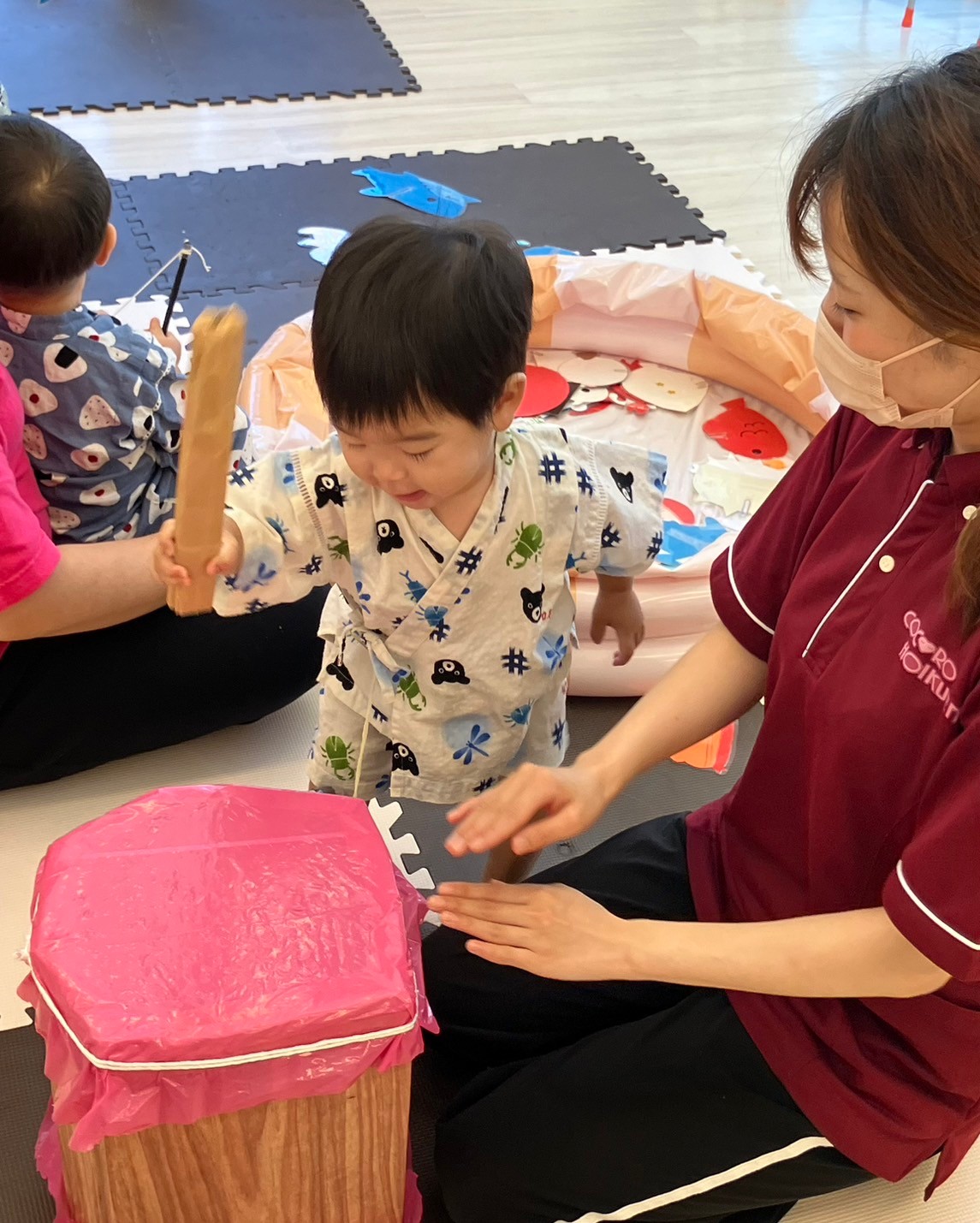 次に、お友だちと一緒に太鼓の周りを囲い、皆で綺麗な太鼓の音色を保育室に響かせてくれました。