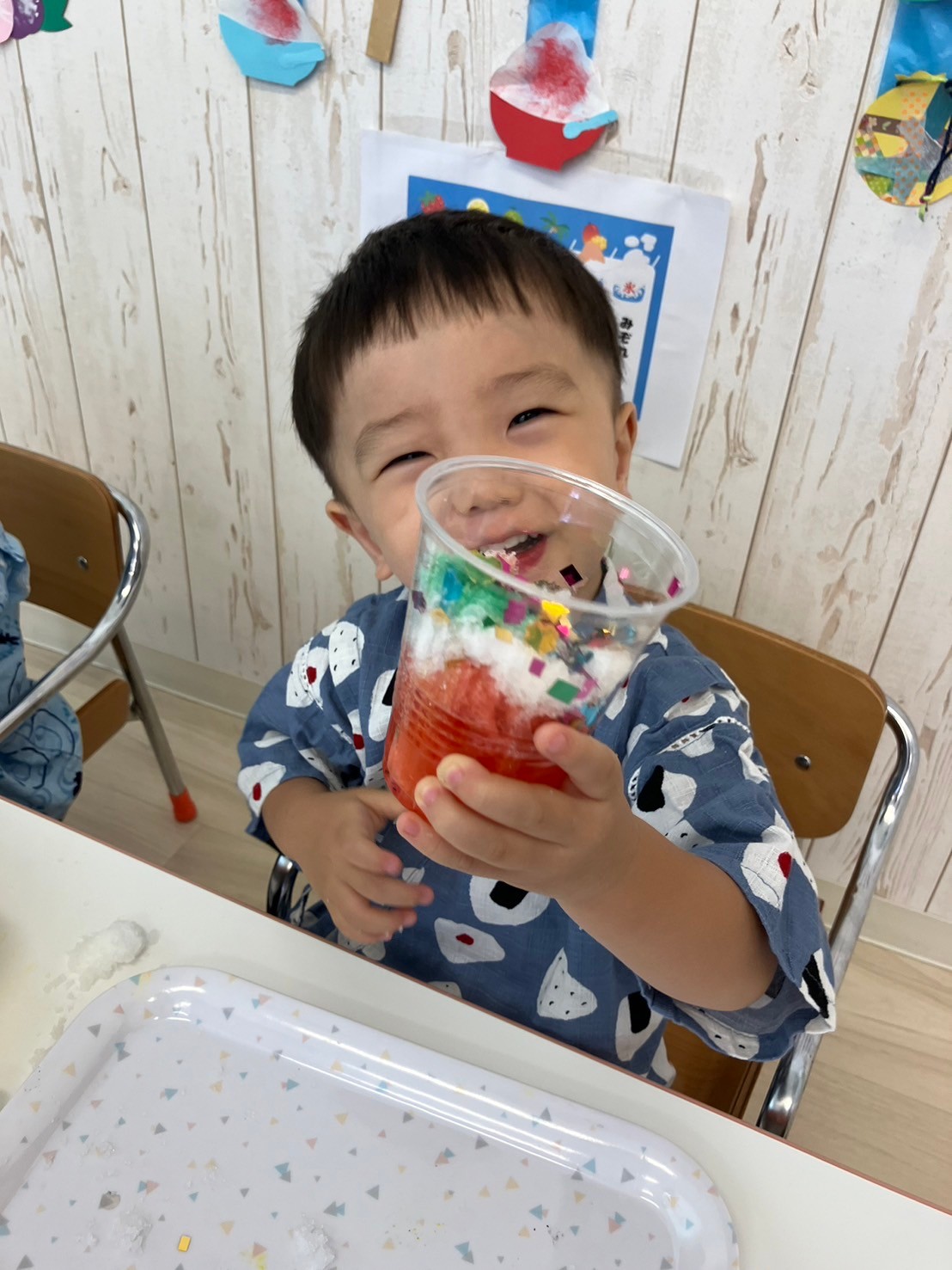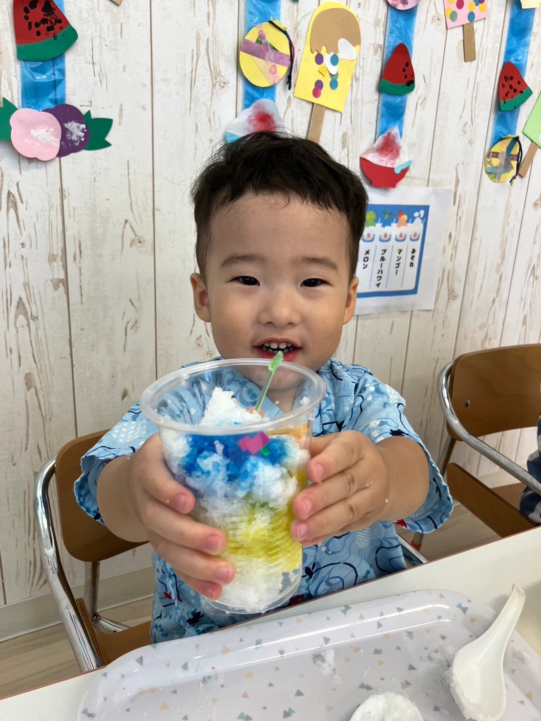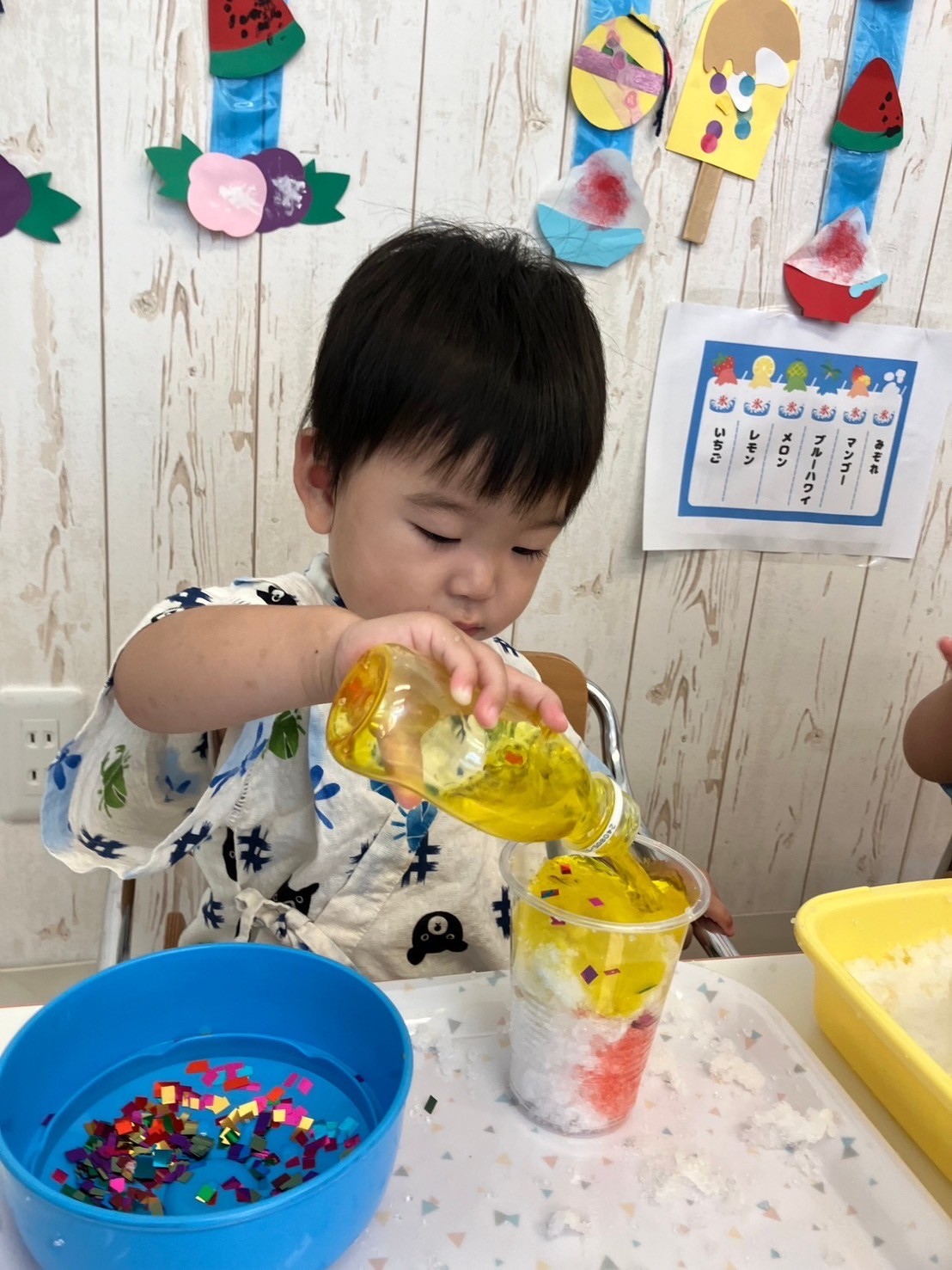 好きな味のシロップ(色水)を選び、「あおいろってなにあじ?」「ぶどう?」「あかはなんだろ?」「すいか?いちご?」と子ども達なりに沢山考えてシロップをかけていました。