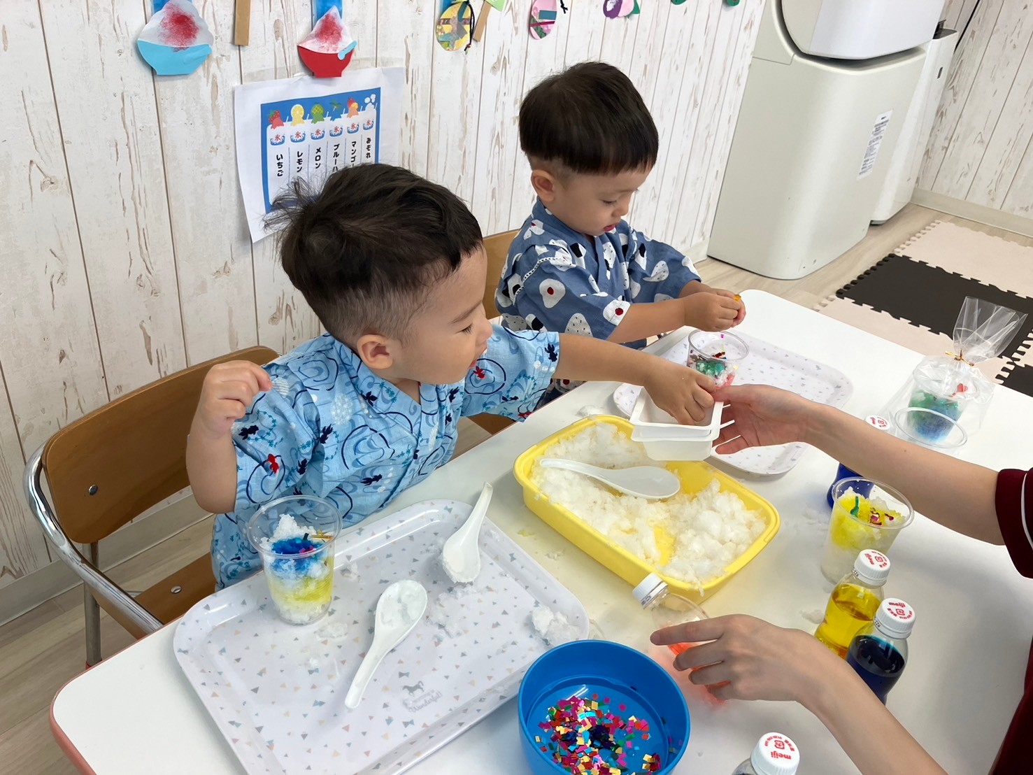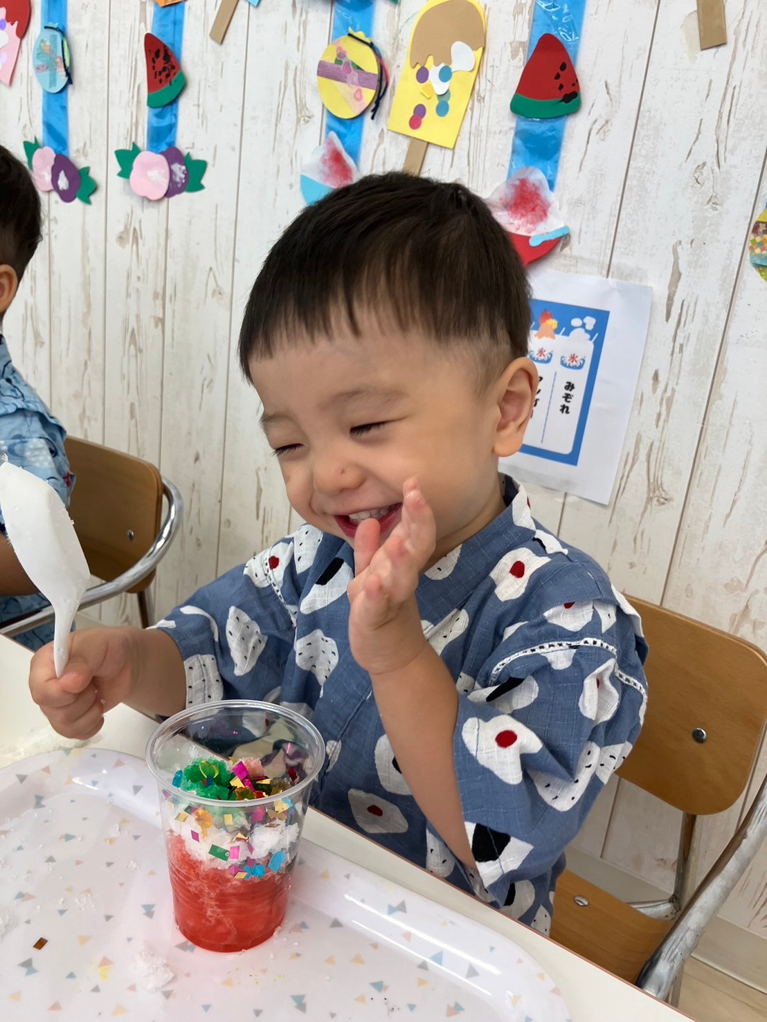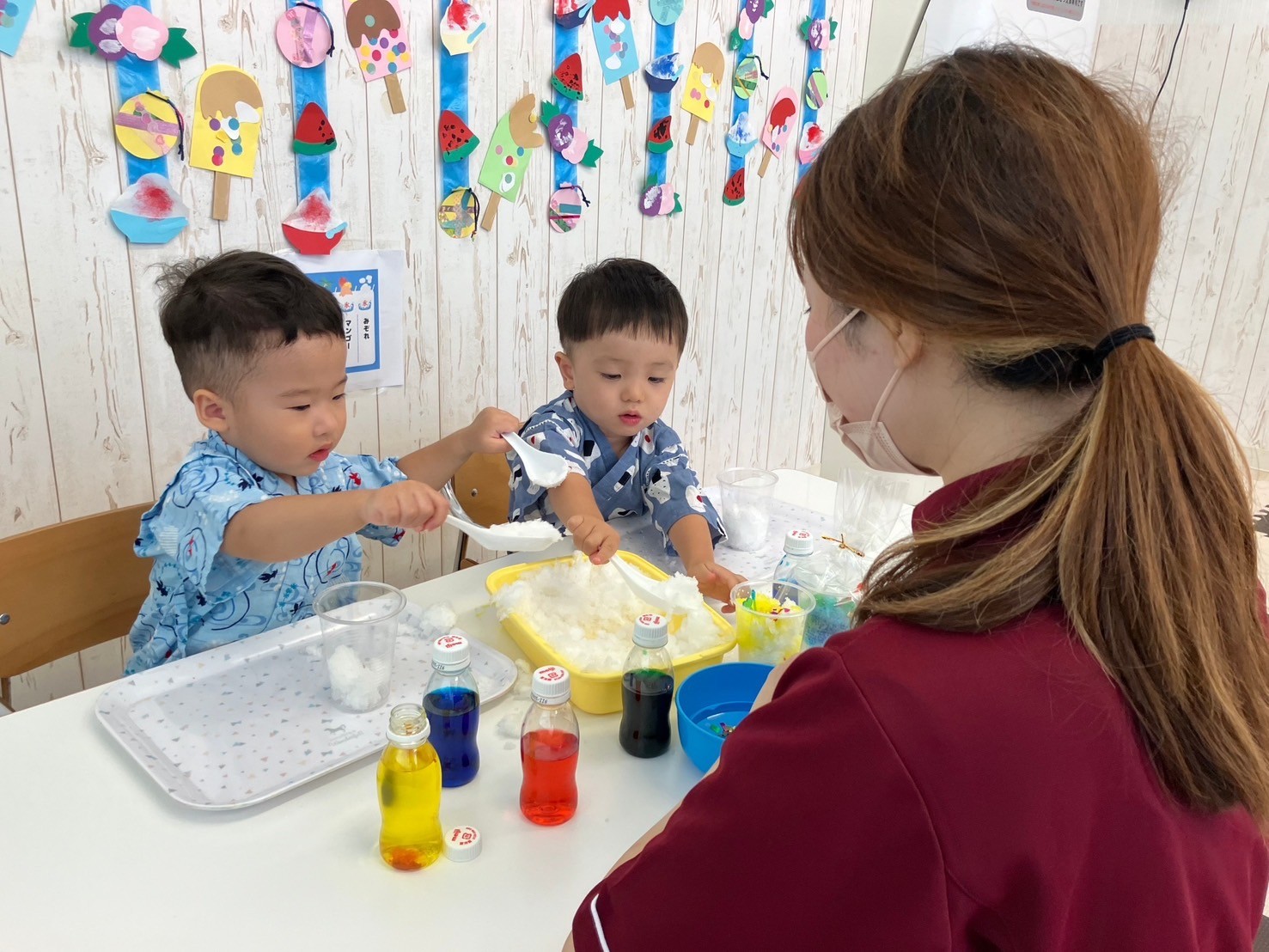 好きな味のシロップ(色水)を選び、「あおいろってなにあじ?」「ぶどう?」「あかはなんだろ?」「すいか?いちご?」と子ども達なりに沢山考えてシロップをかけていました。