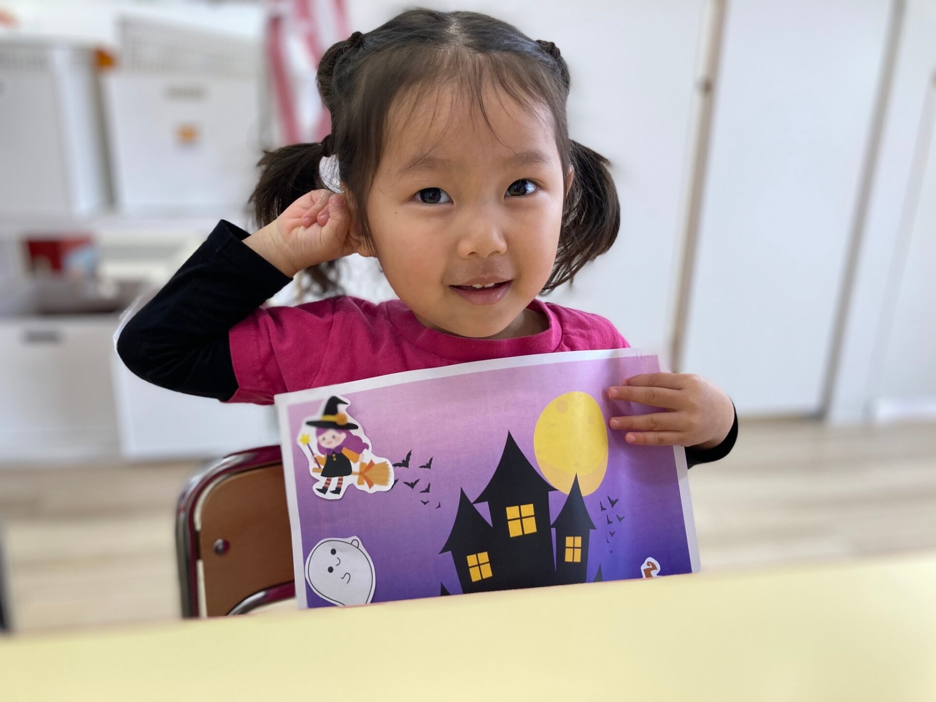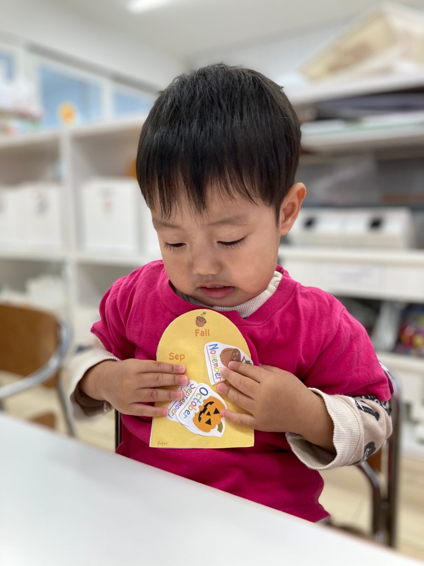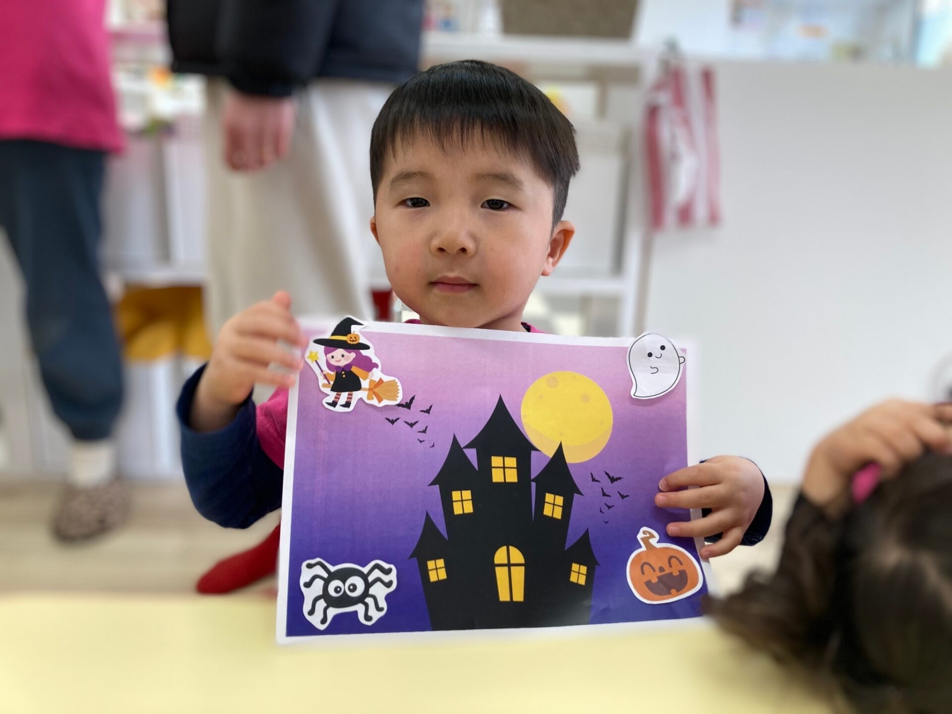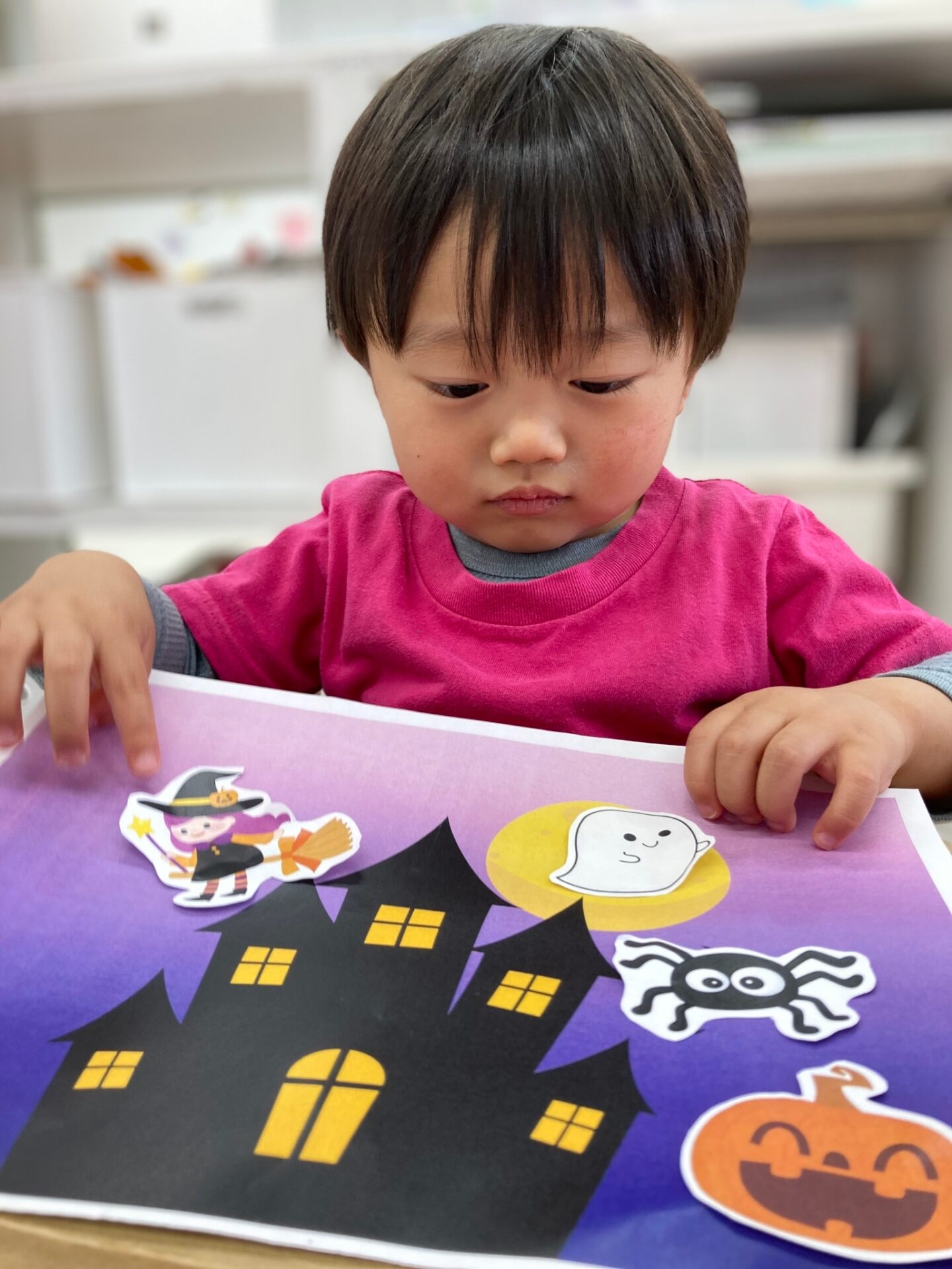 ・Halloweenワークシート(秋の復習)ハロウィンキャラクターのシールを貼る。