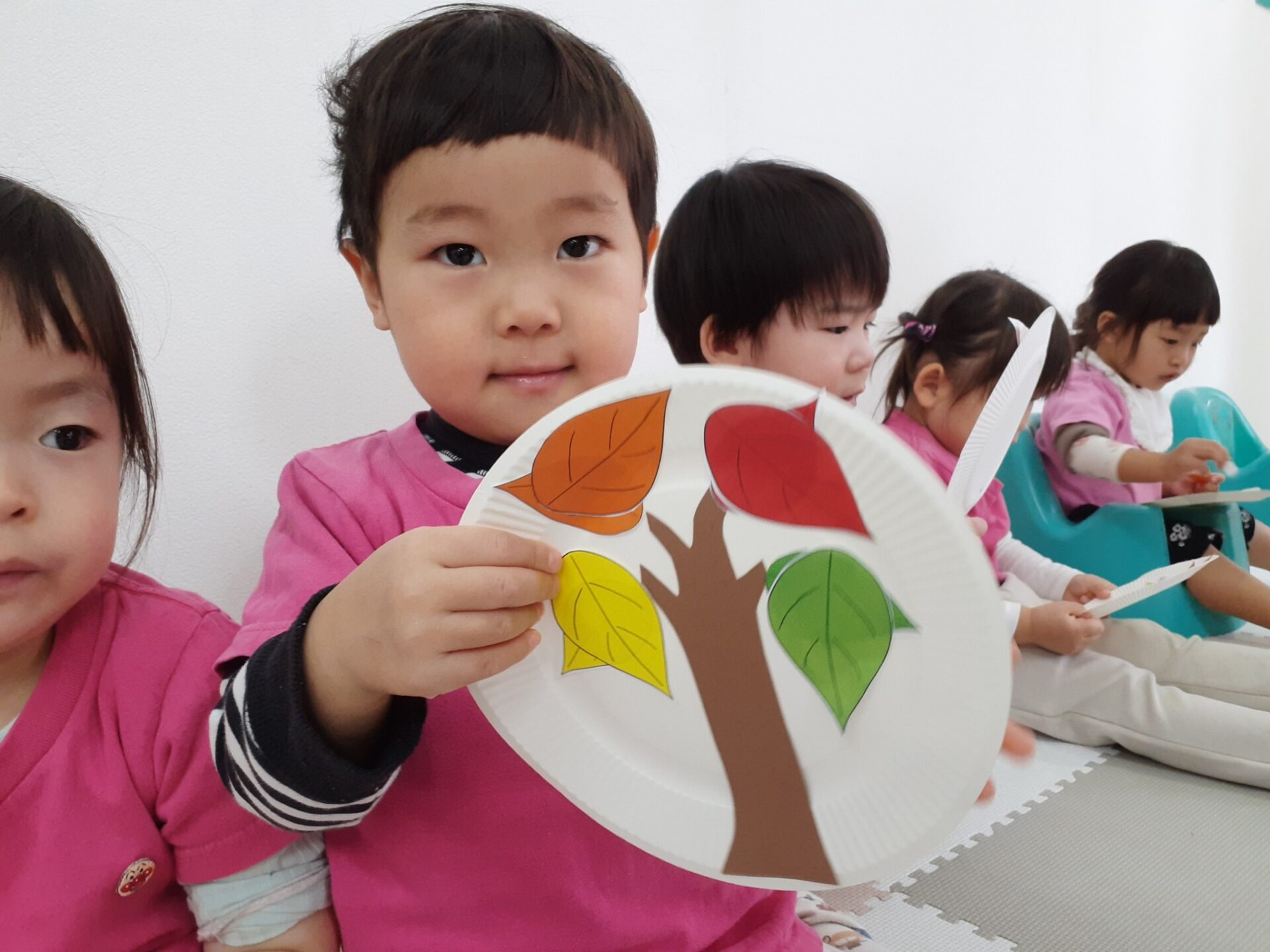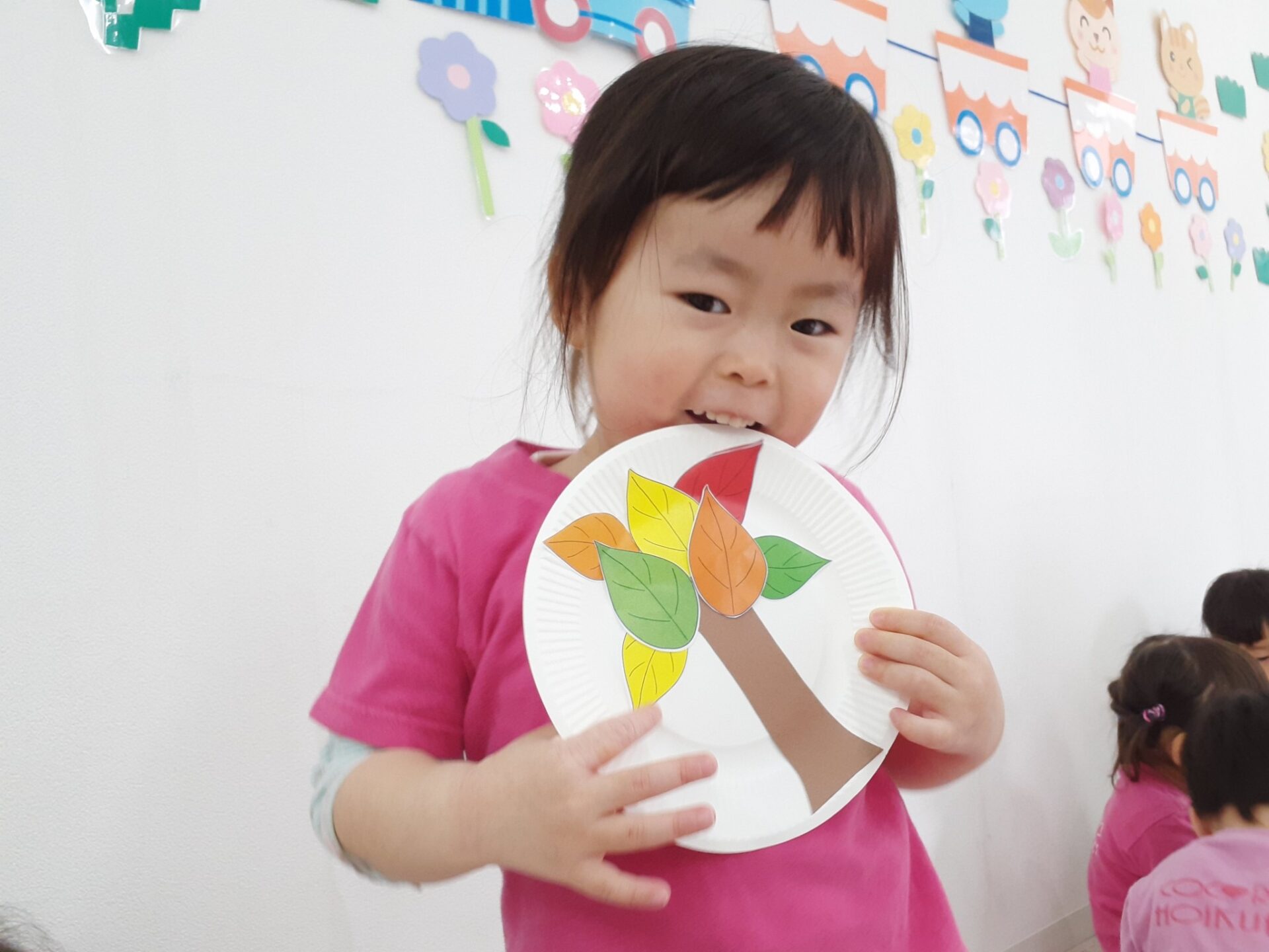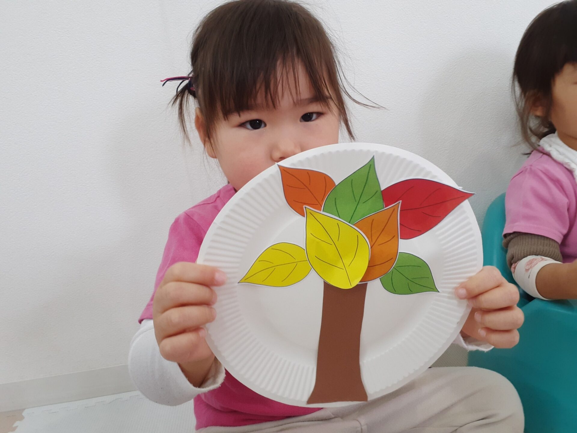 ・Paper plate Autumn Tree 色とりどりの秋の葉っぱを貼り付けるクラフト