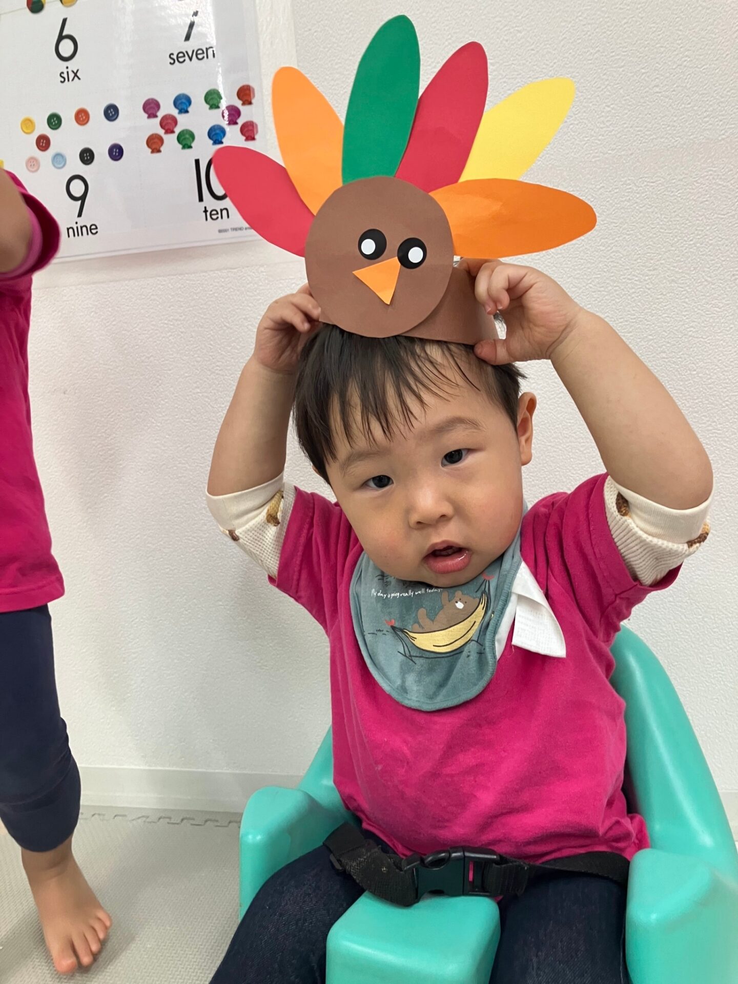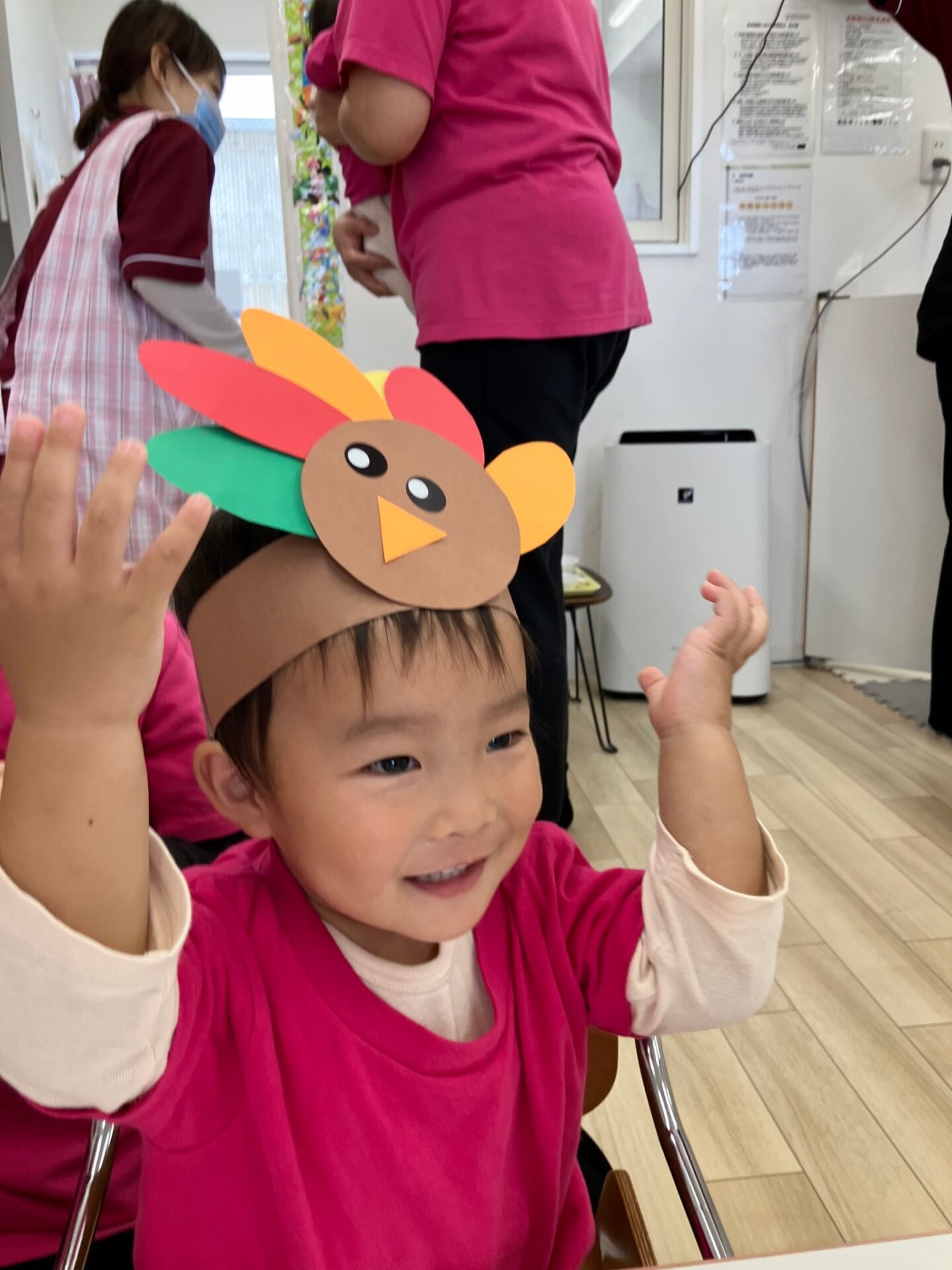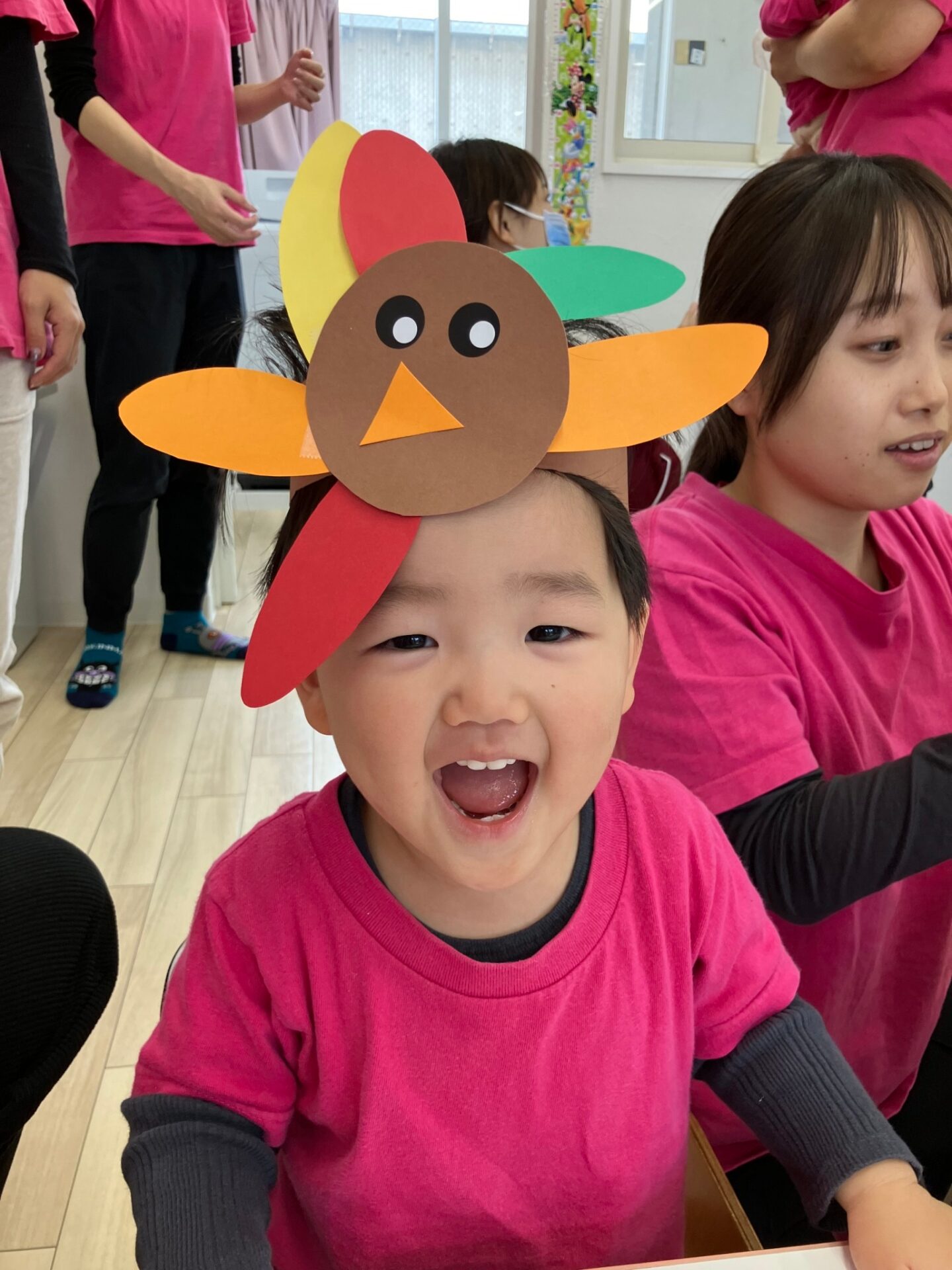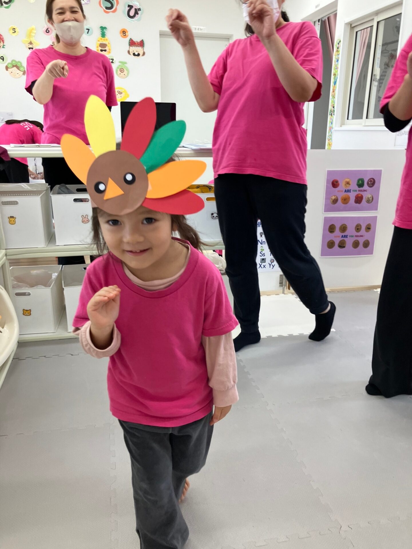 できた七面鳥のヘアバンドを付けて、ターキーダンスをしたり、Freeze game(音楽が止まったら動かずじっとする遊び)も楽しみました。