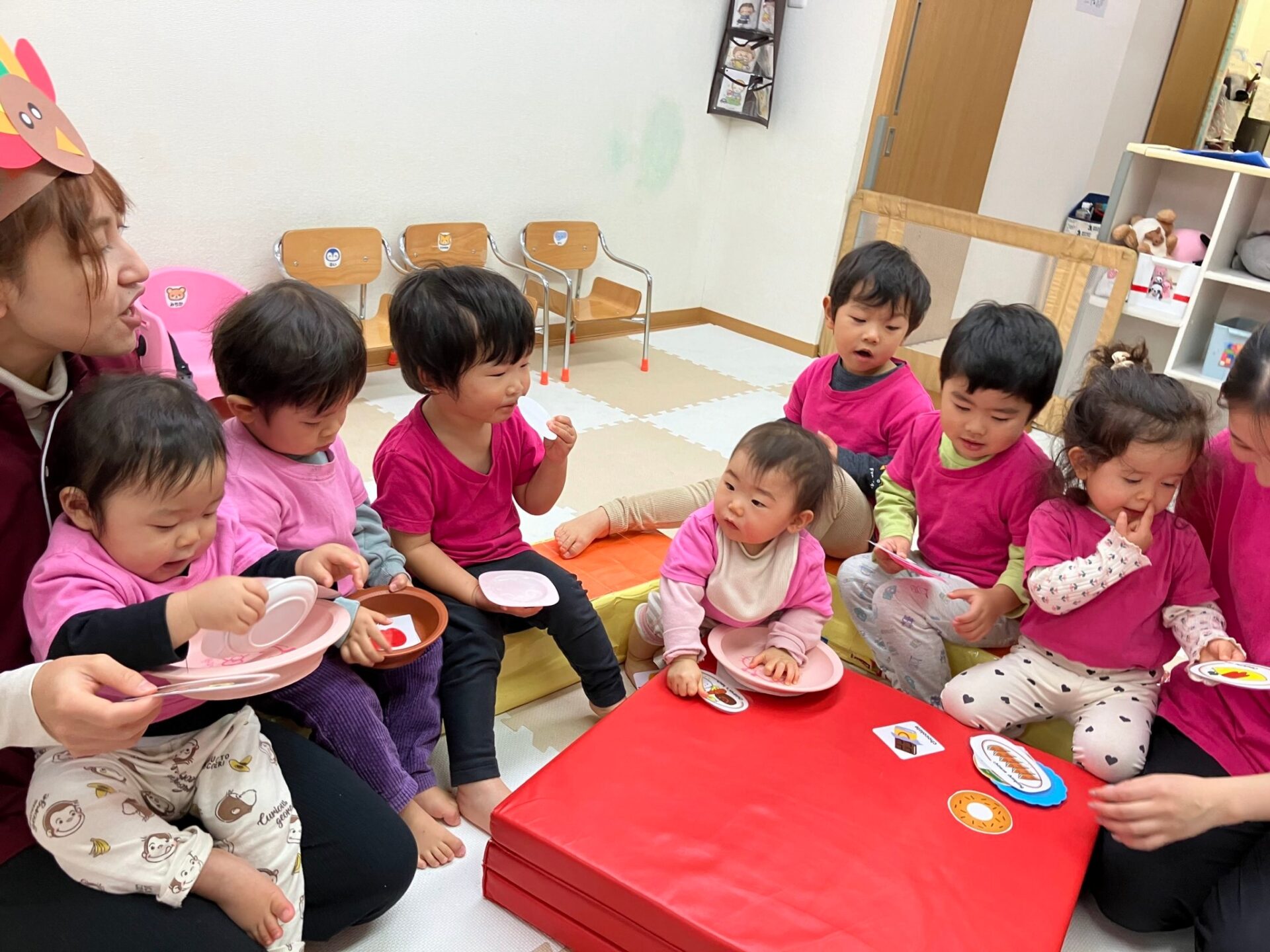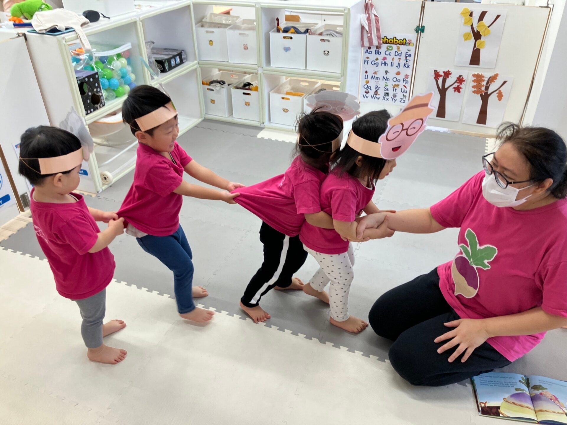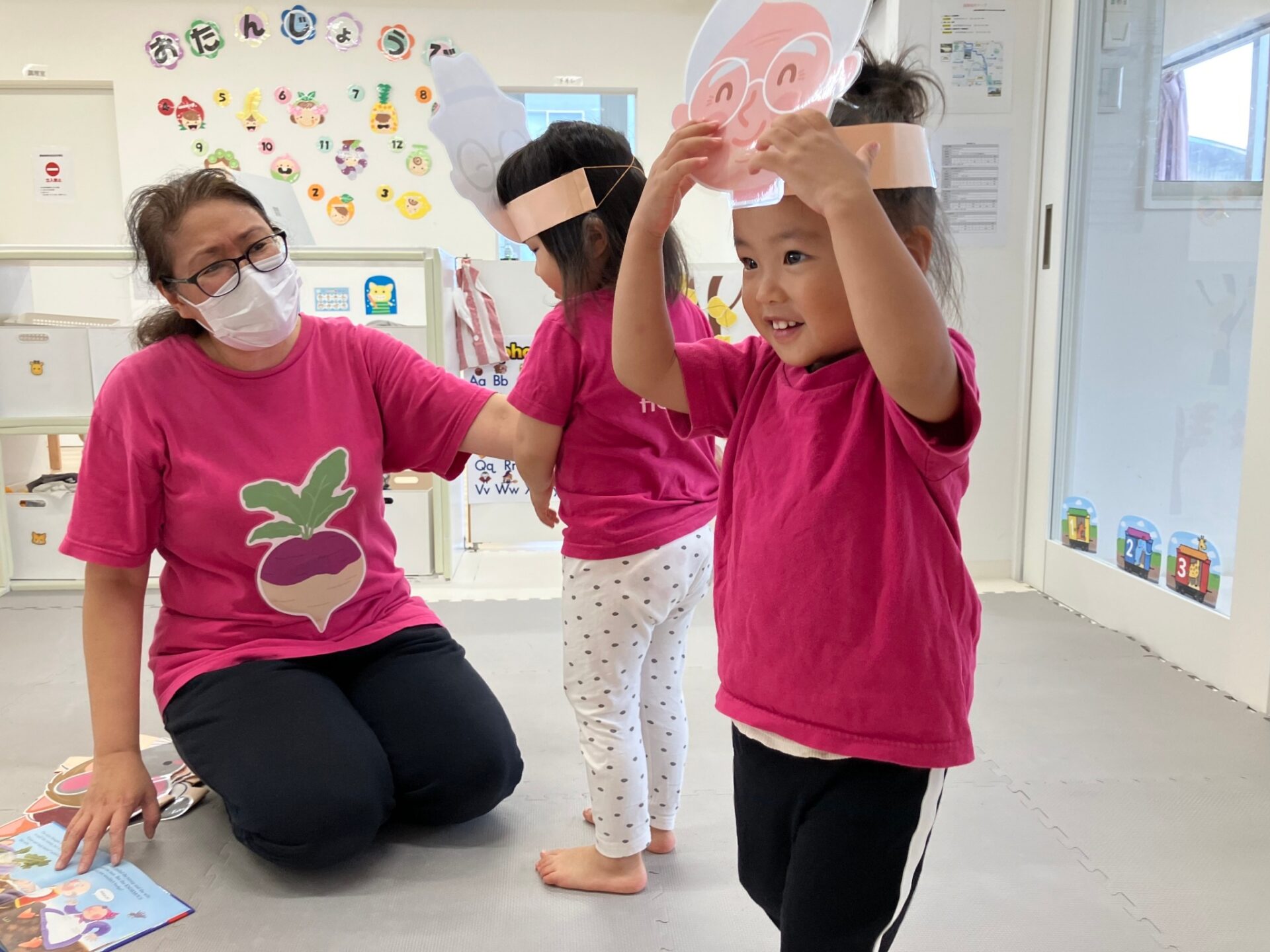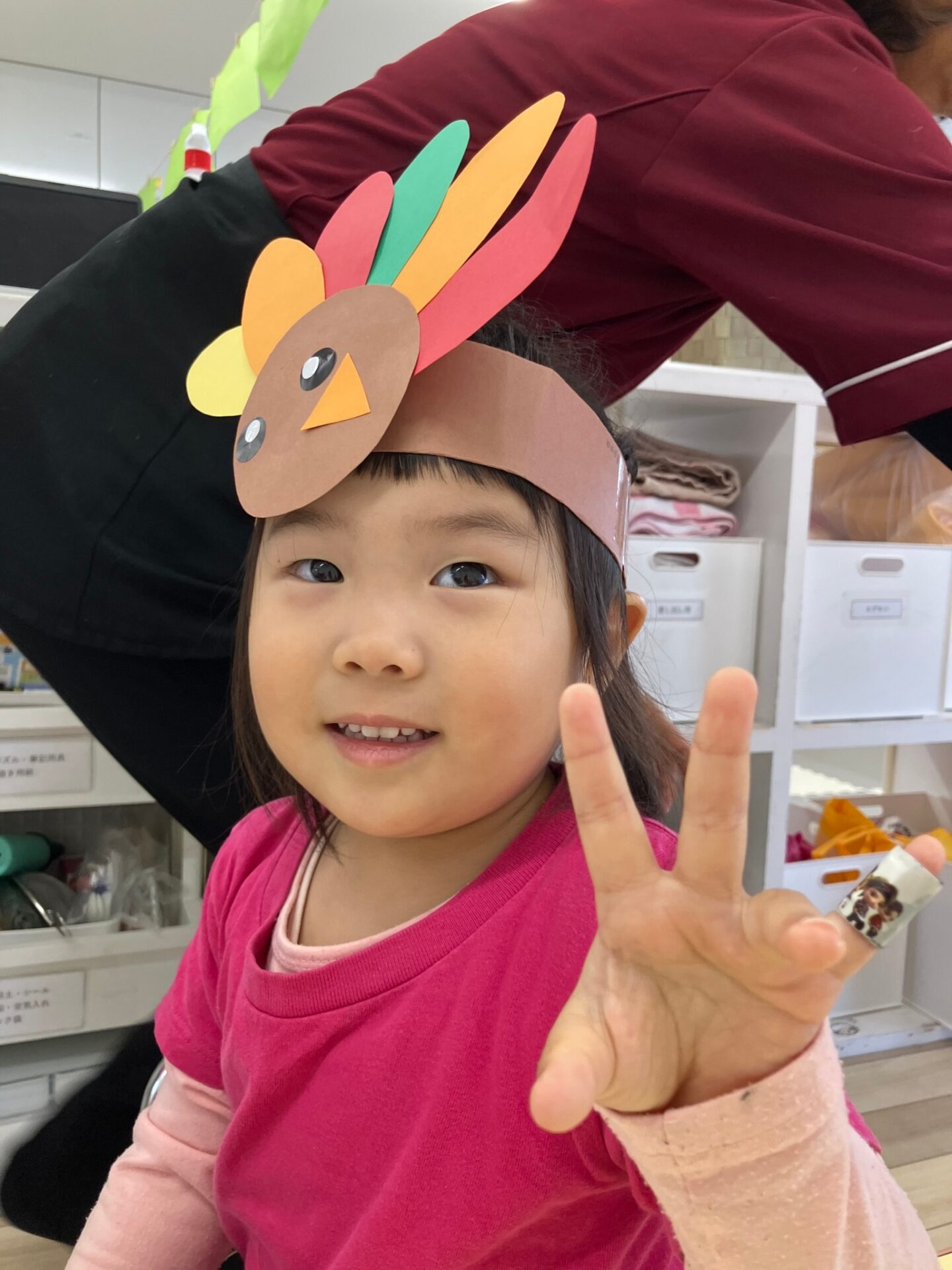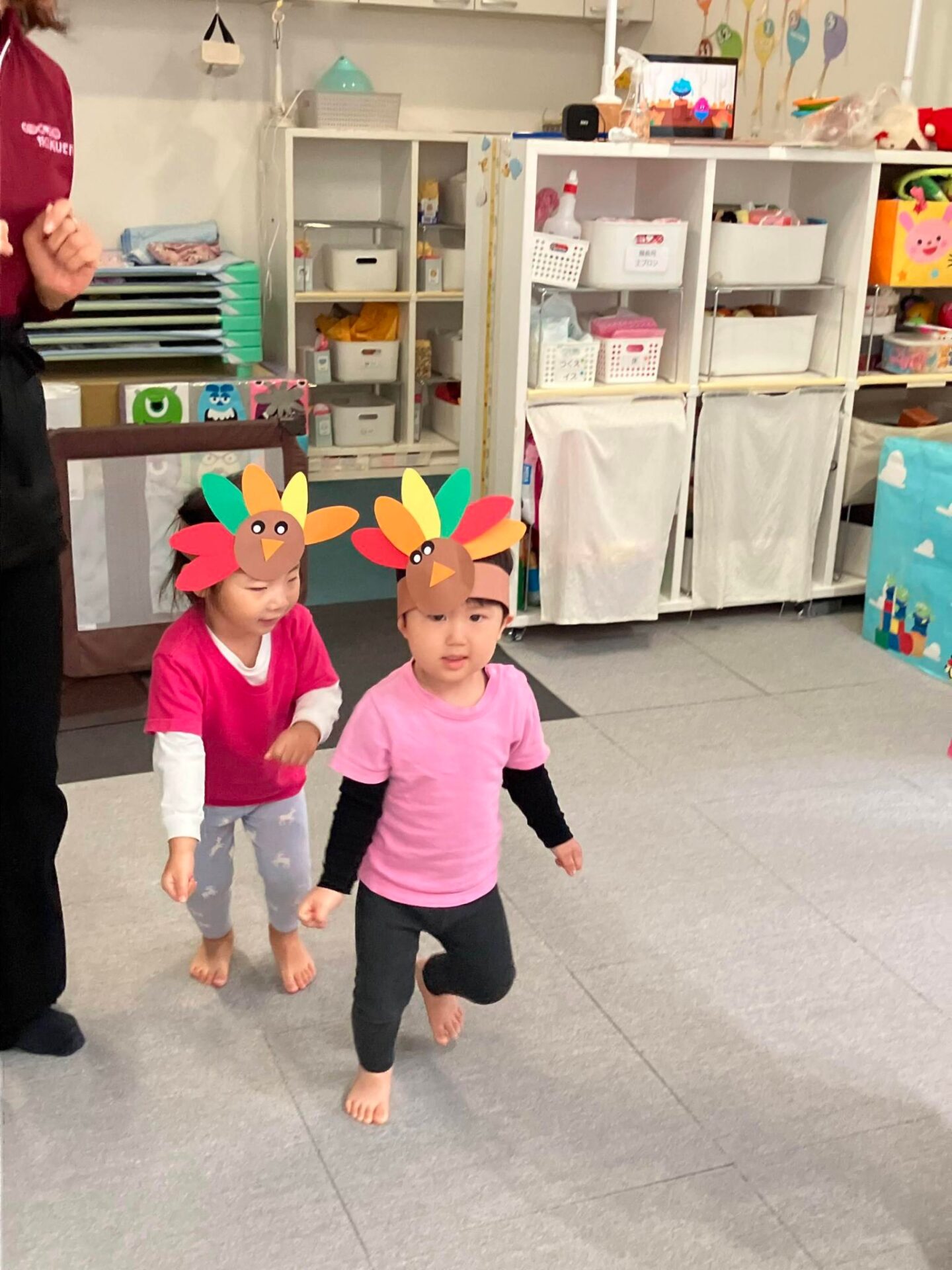 できた七面鳥のヘアバンドを付けて、ターキーダンスをしたり、Freeze game(音楽が止まったら動かずじっとする遊び)も楽しみました。