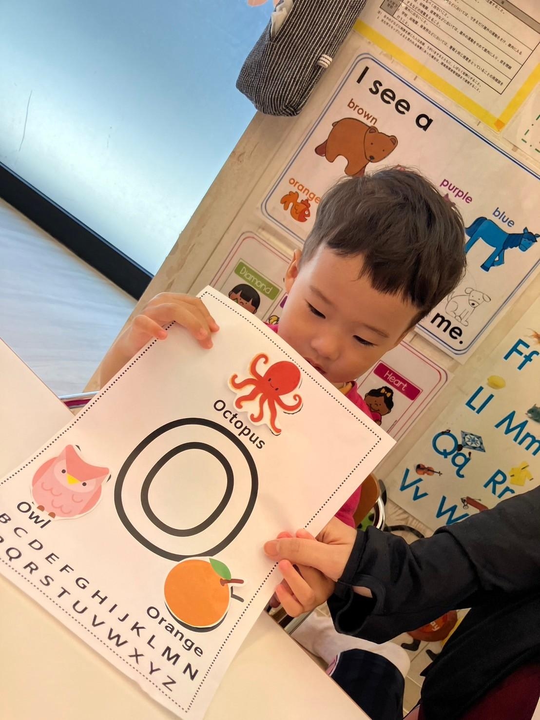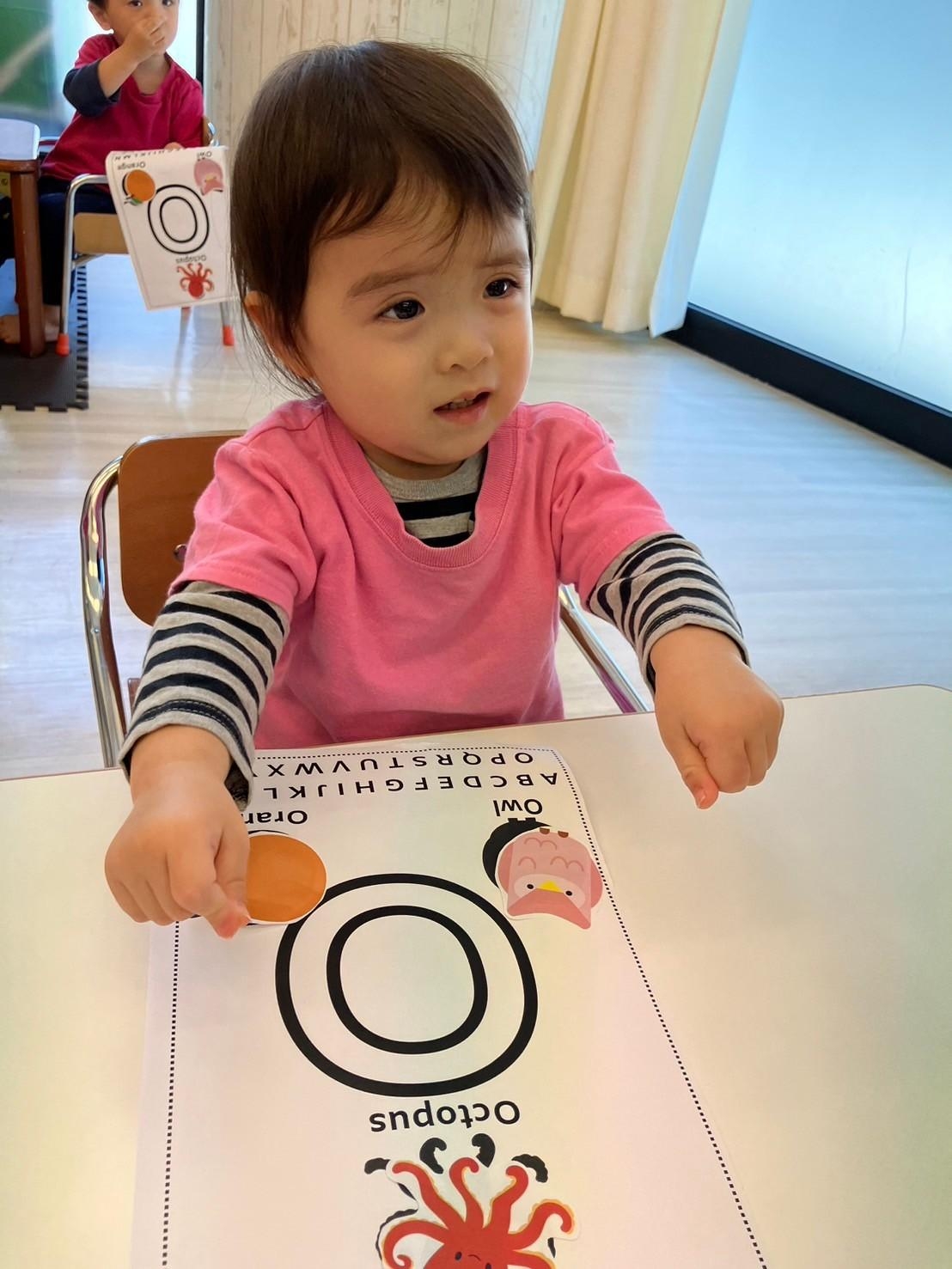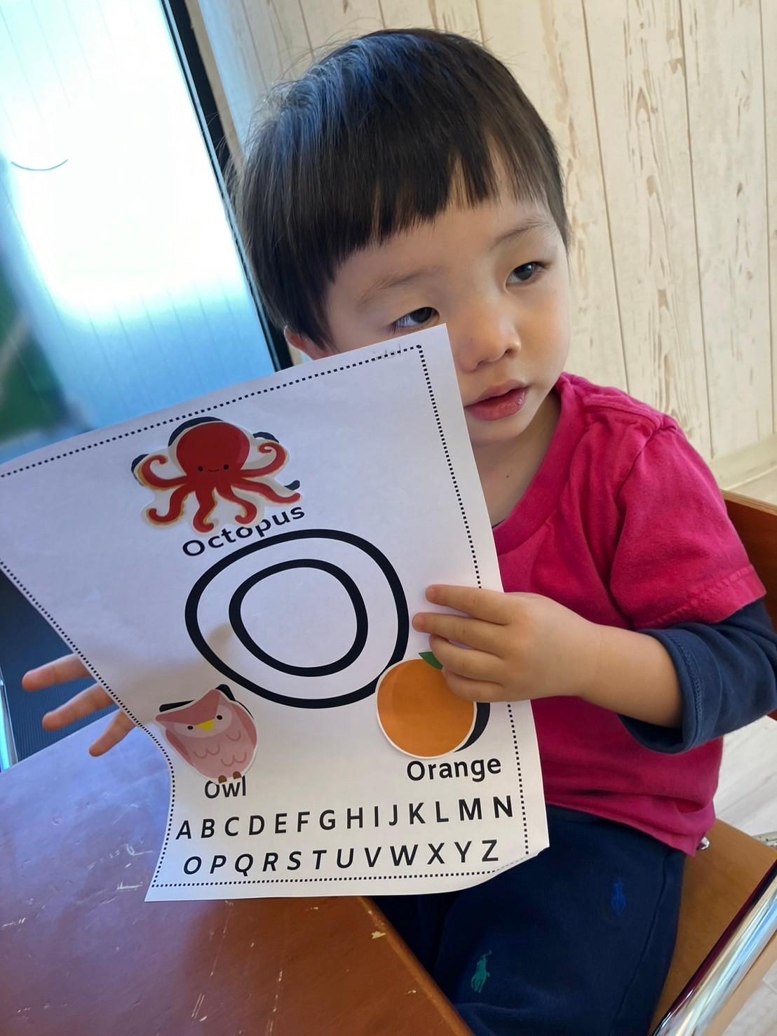 ・Letter ”O”(Octopus, Owl, Orange) Letter ”P”(Pig, Pizza, Penguin) 形のうえにシールを張る