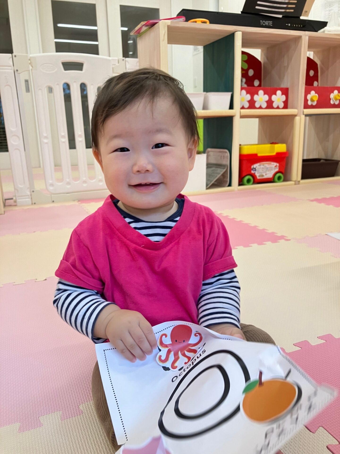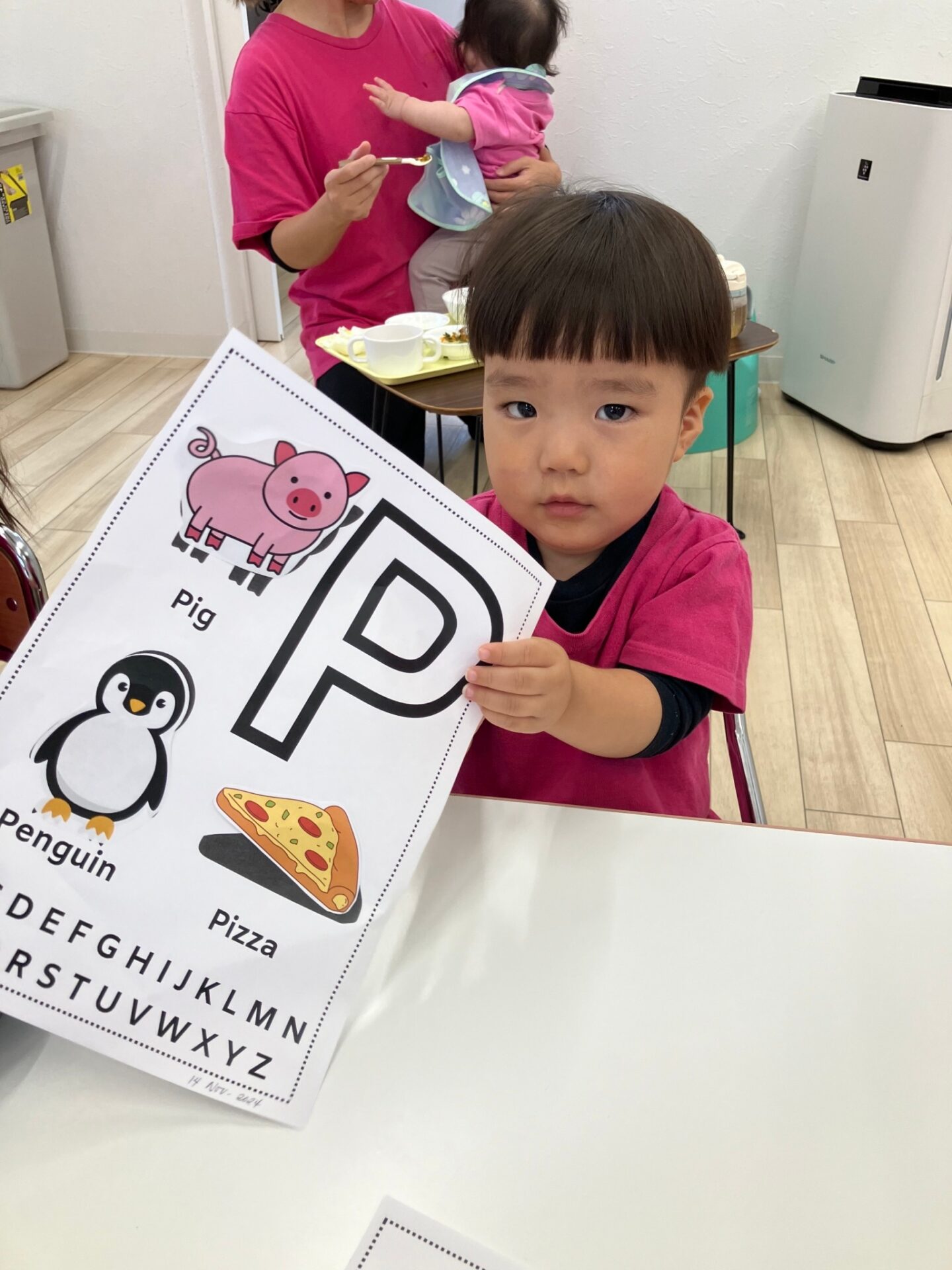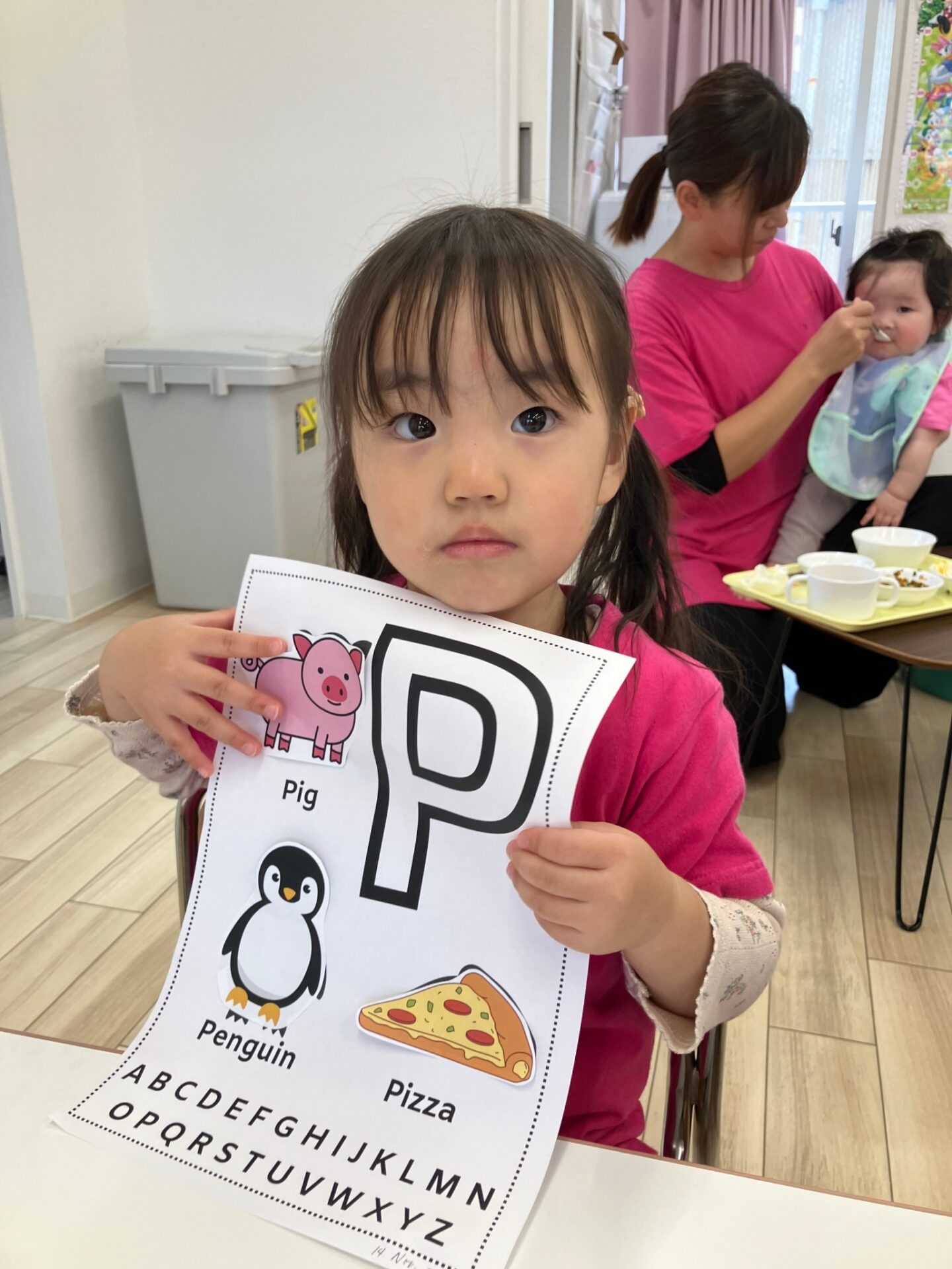 ・Letter ”O”(Octopus, Owl, Orange) Letter ”P”(Pig, Pizza, Penguin) 形のうえにシールを張る