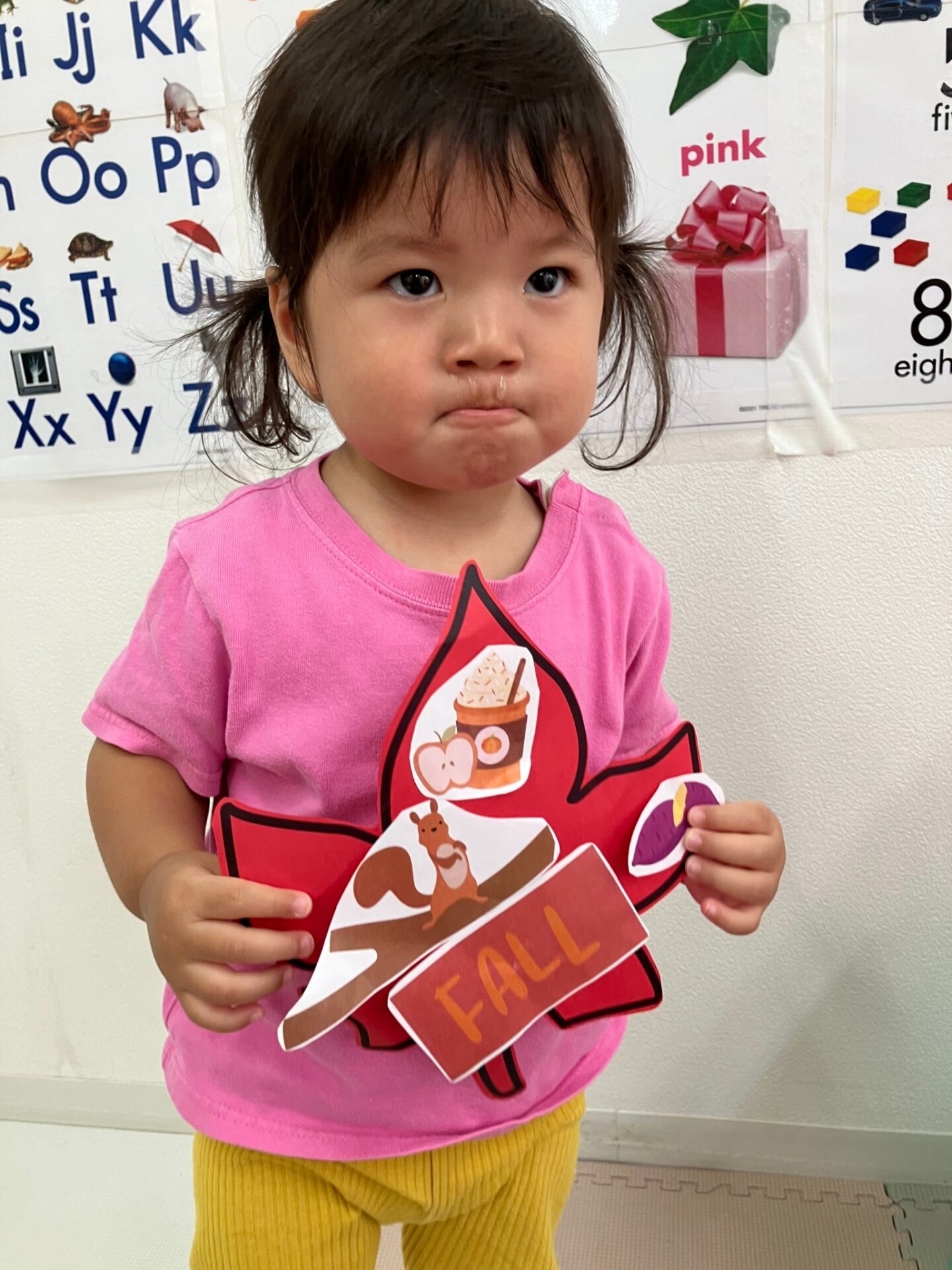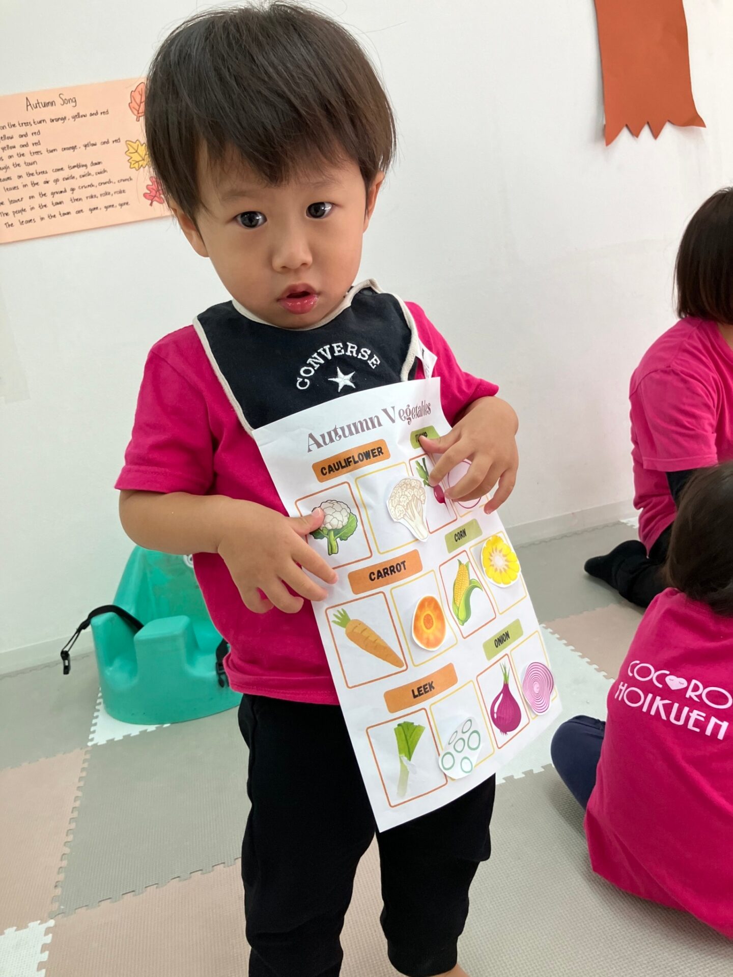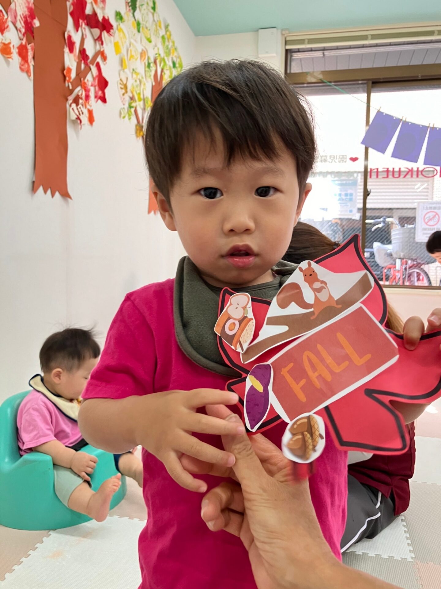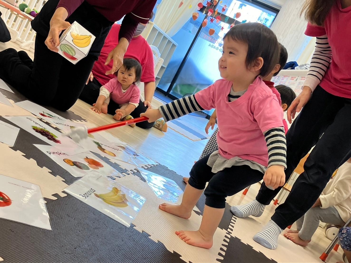 秋になって色ずく葉っぱの歌Autumn Leaves song を歌いながら手遊びをしたり、先生の指示した色の葉っぱを探してその上に立つゲームを楽しみました。