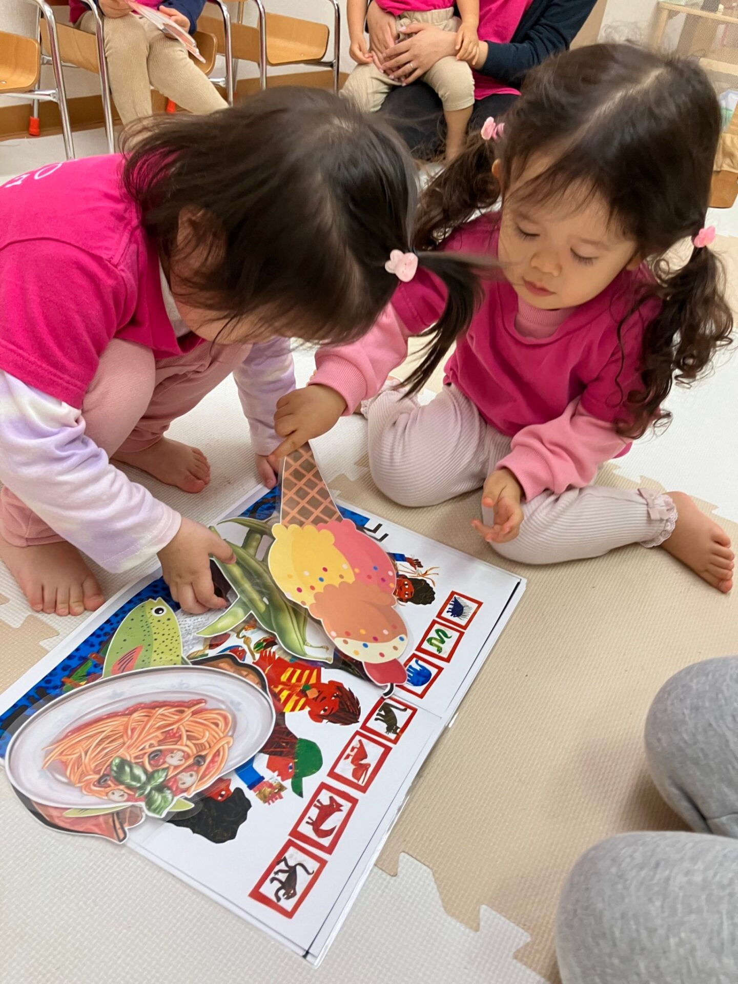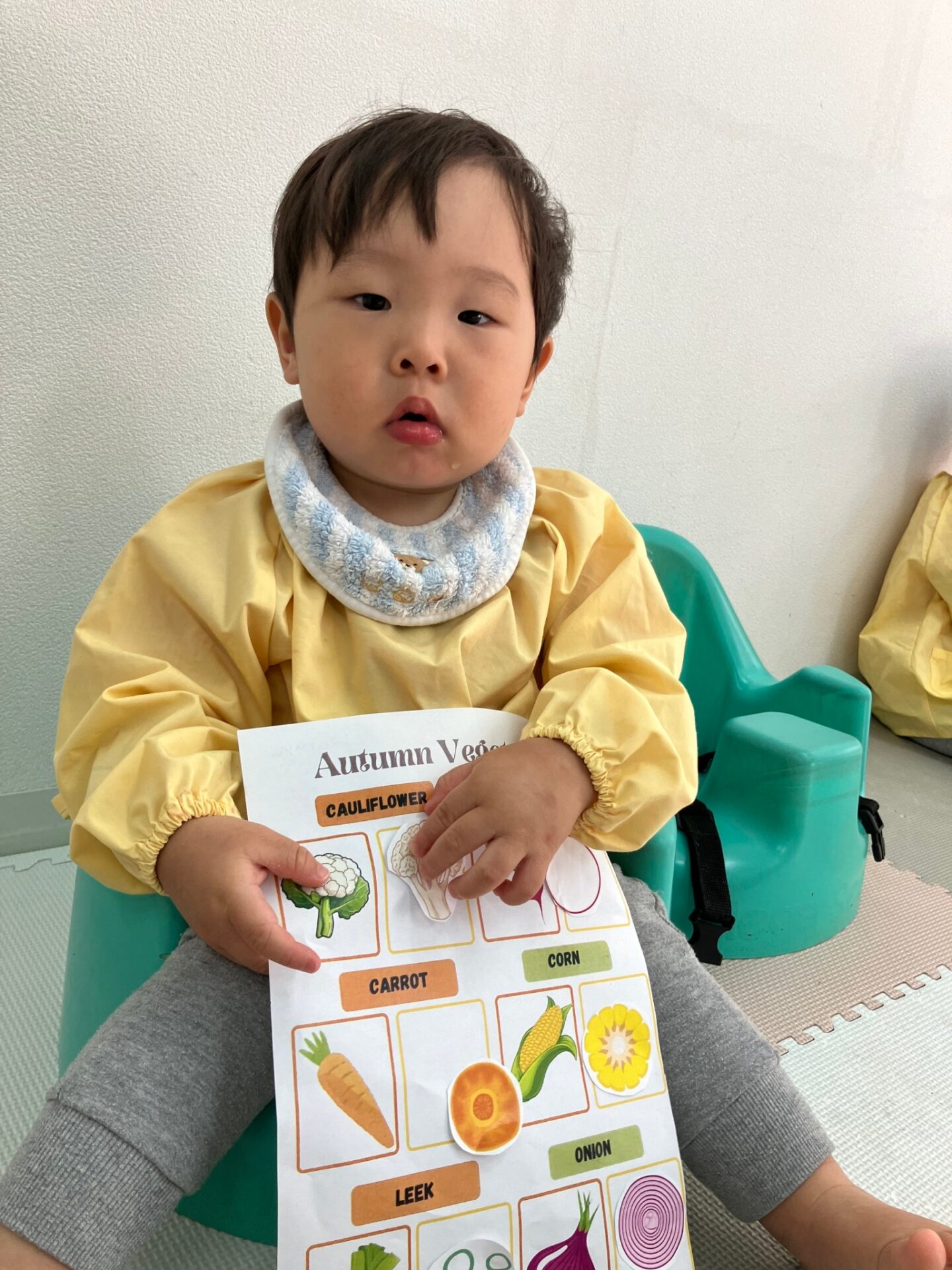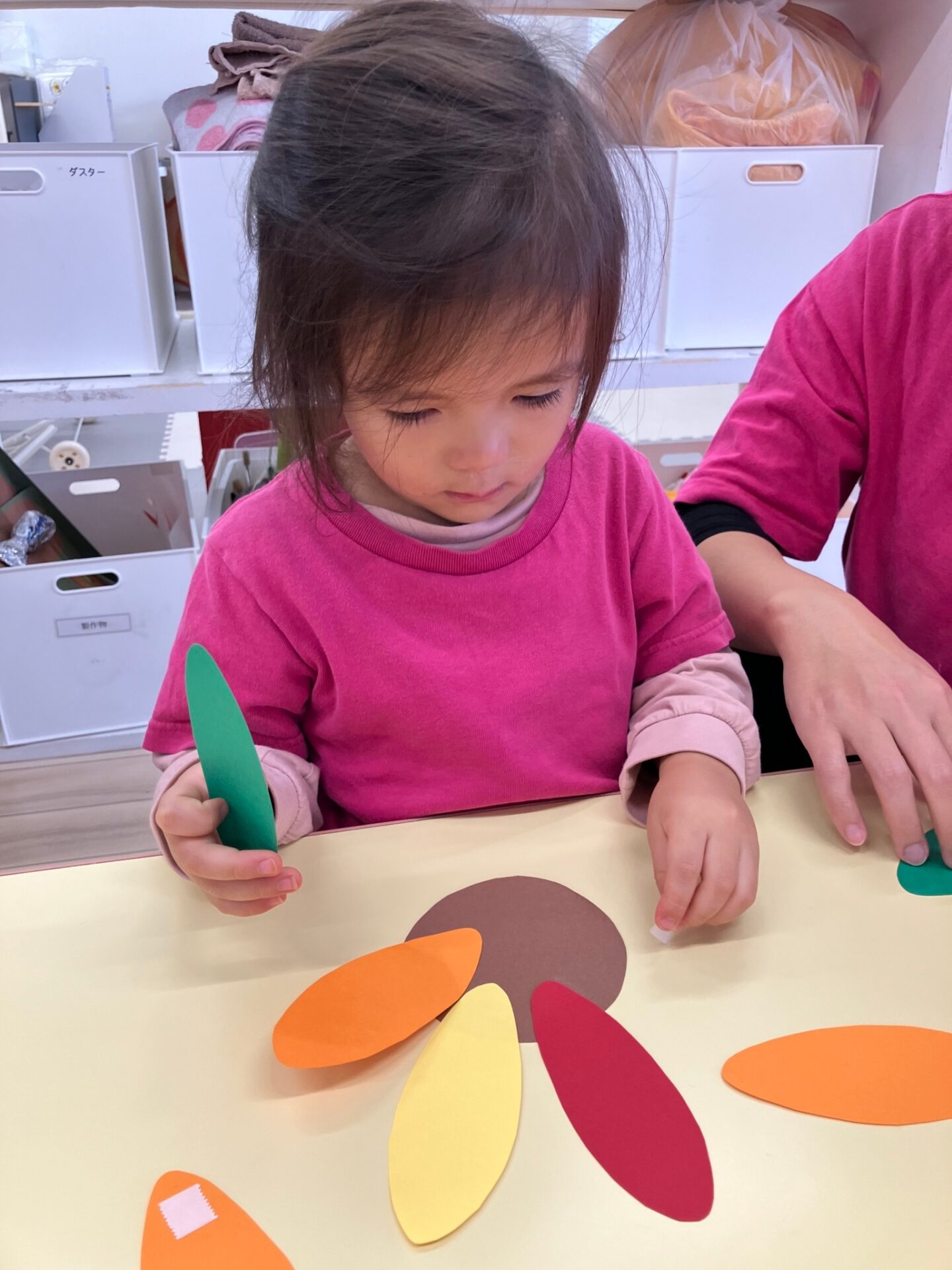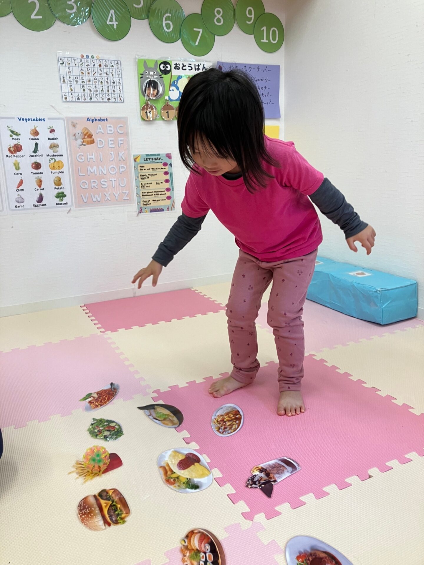 秋になって色ずく葉っぱの歌Autumn Leaves song を歌いながら手遊びをしたり、先生の指示した色の葉っぱを探してその上に立つゲームを楽しみました。