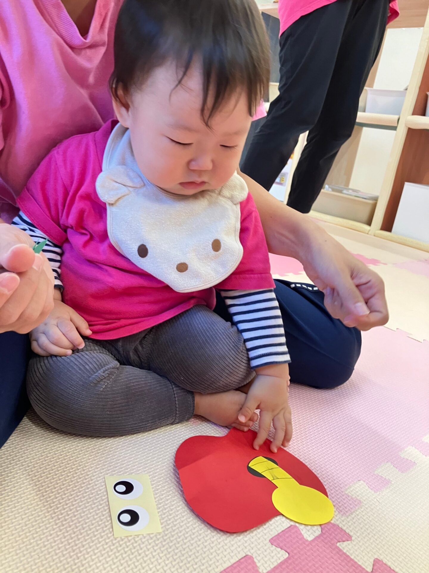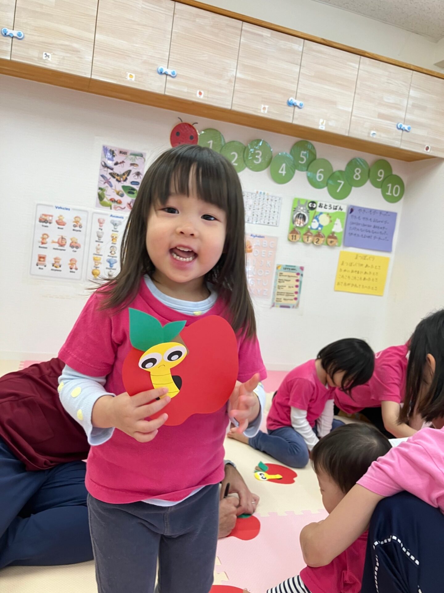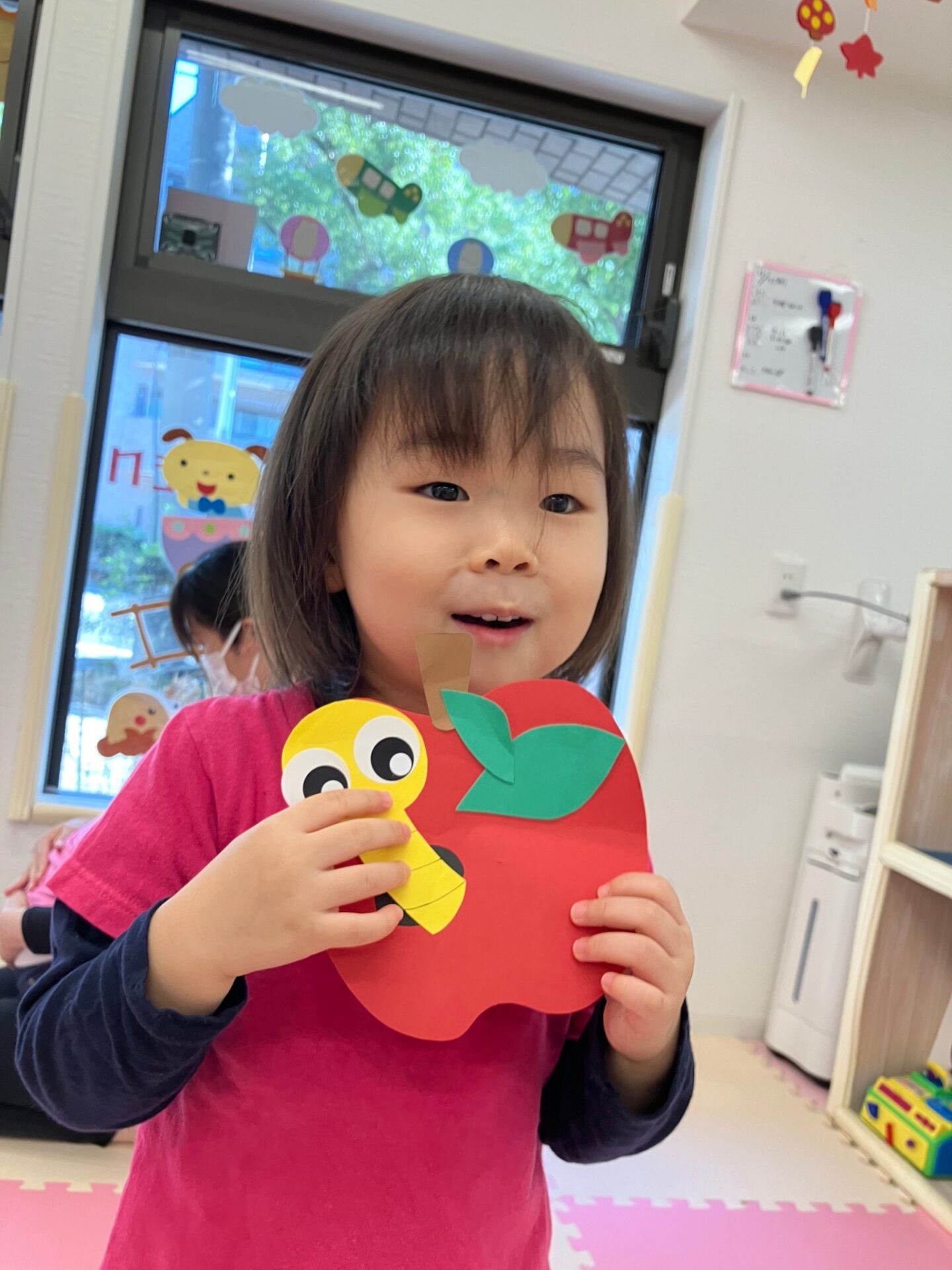 ・Apple Craft 赤いリンゴから可愛い青虫がのぞいている様子を色画用紙で作る