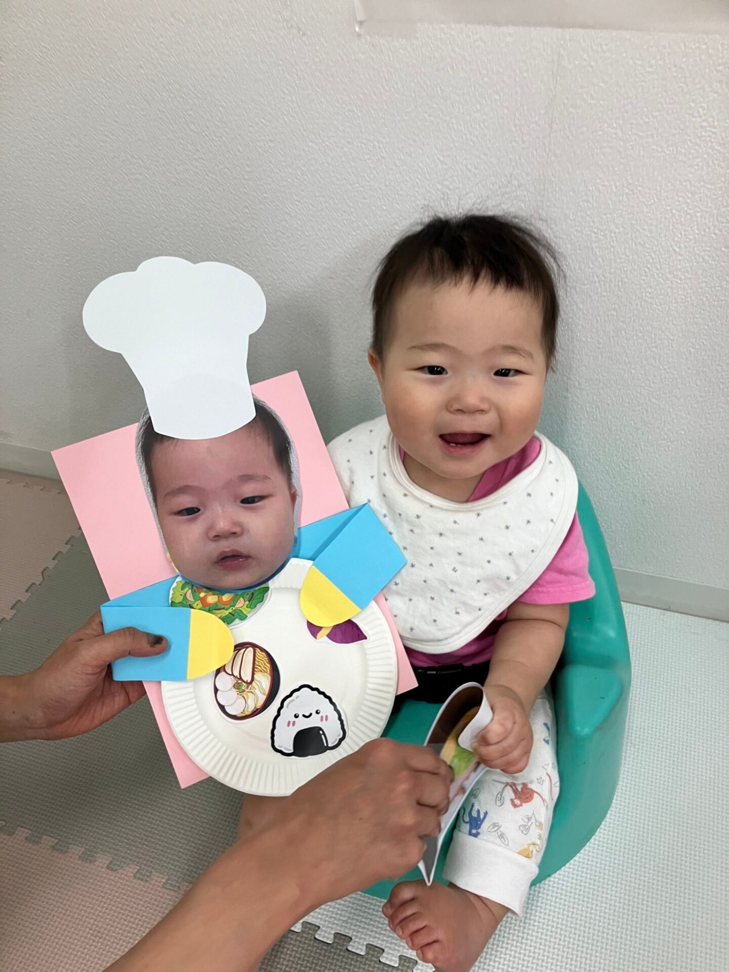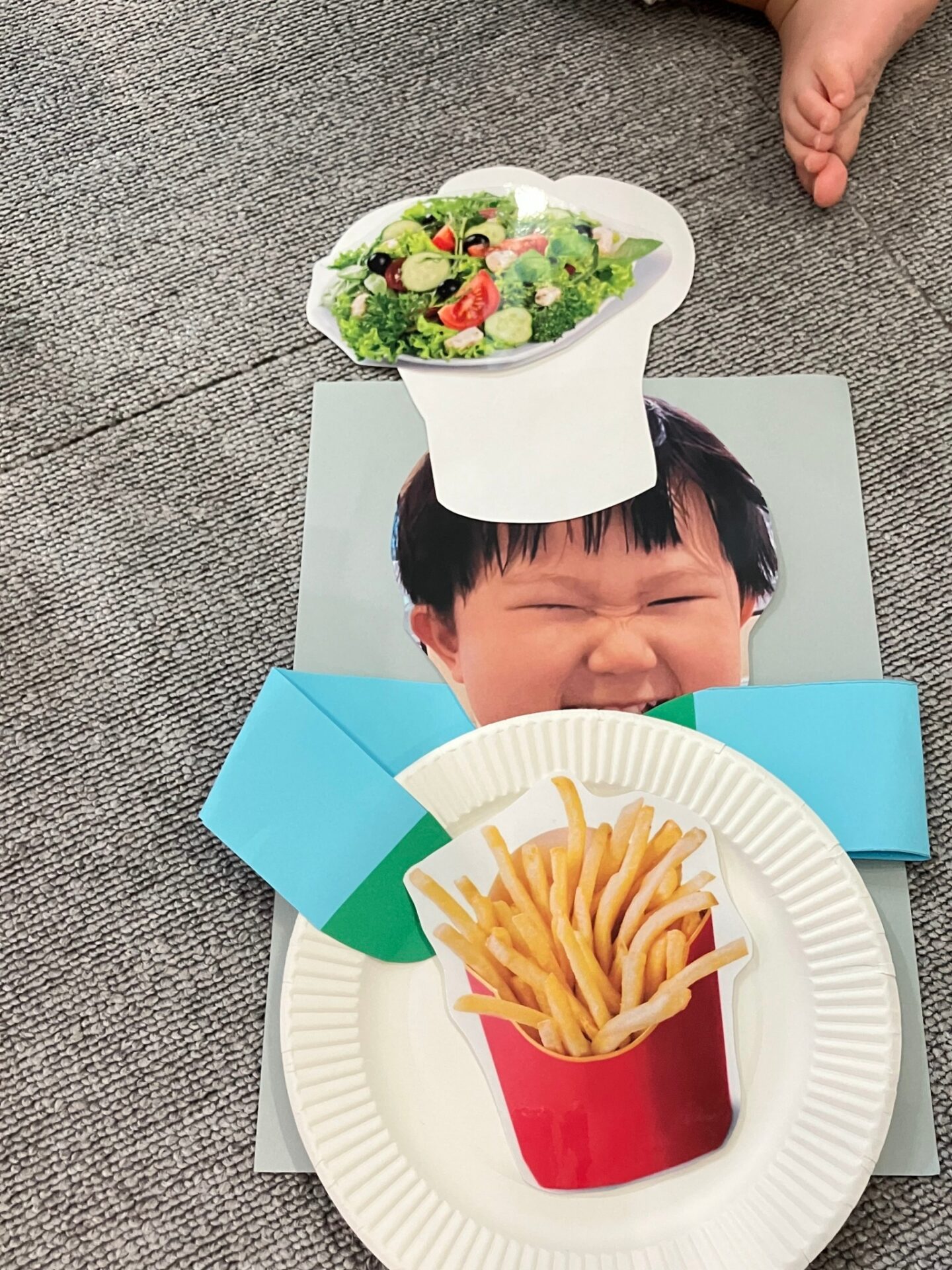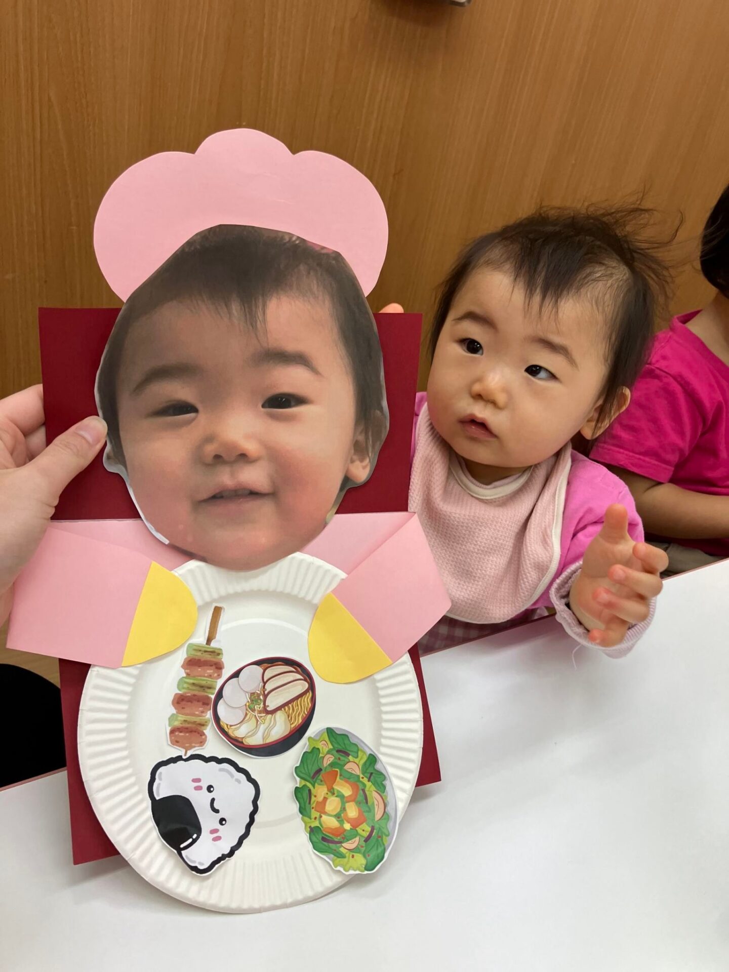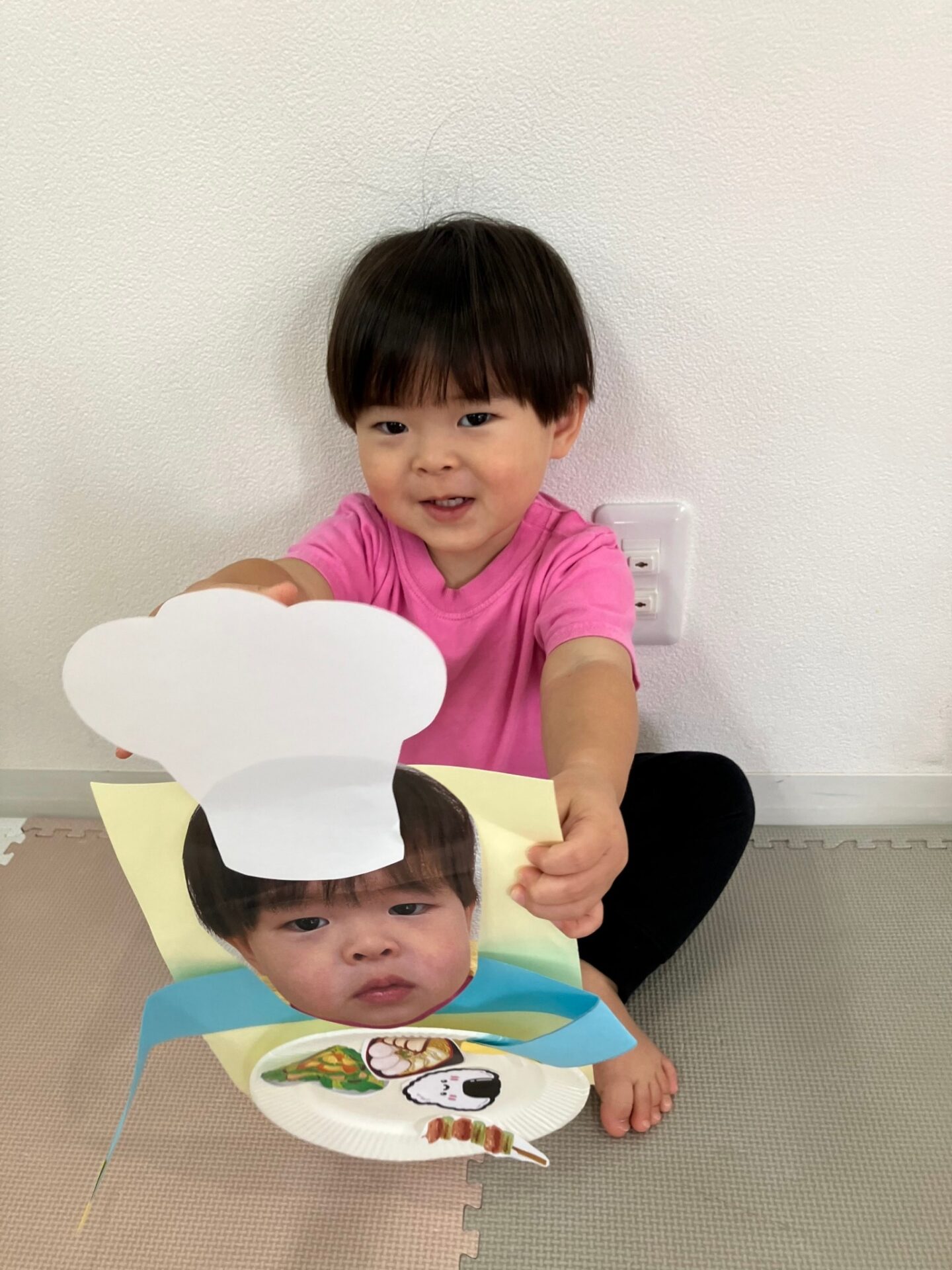 ・My Plate 子どもたちの顔写真を使ったコックさんが持つ紙皿に、おいしい食べ物を張り付ける