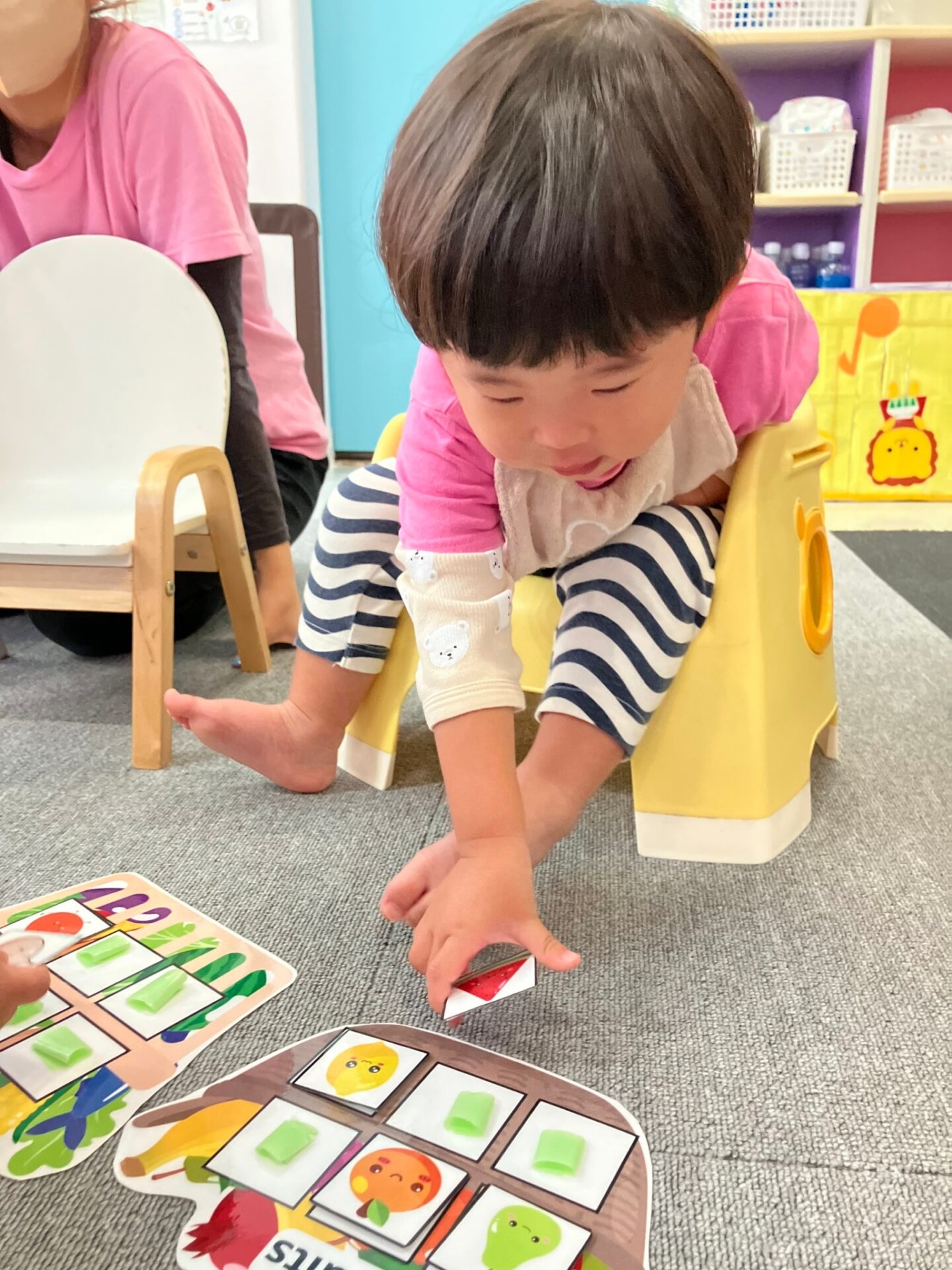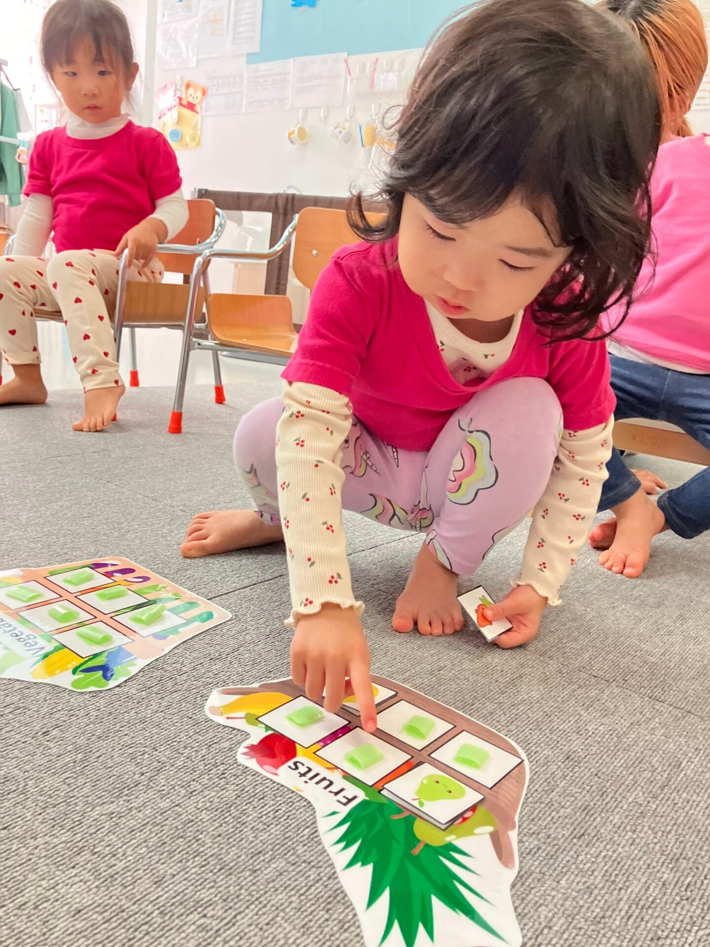 ・Colorful leaves game 床に置いてあるカラフルな葉っぱから、先生の言った色を見つけてその上に立つ