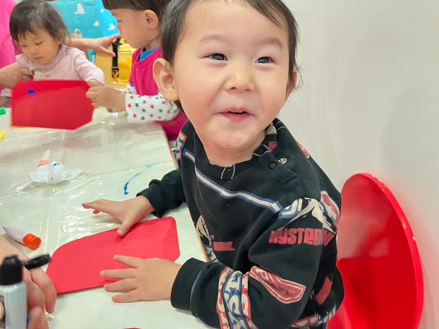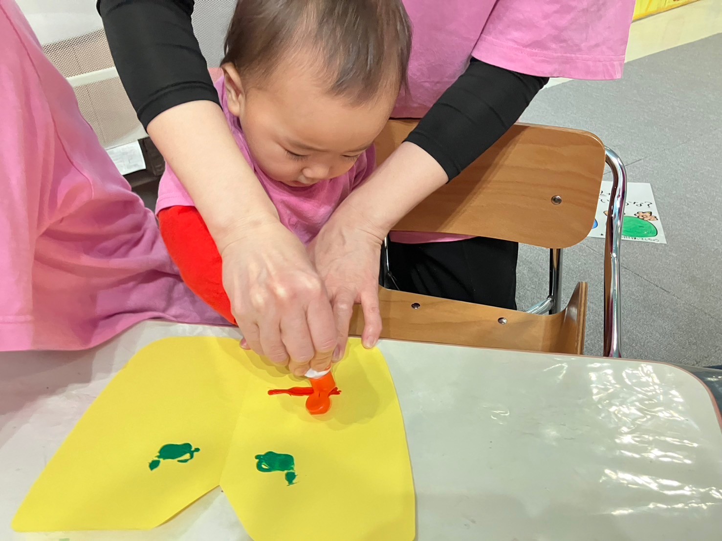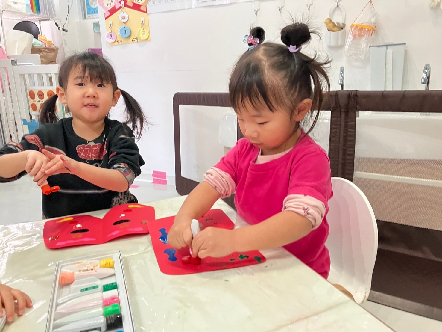 2歳児さんは、お友だち同士でどの色を塗ってるかなどを横目で見ながら、製作に集中して取り組み、競争が激しくなってきてます。