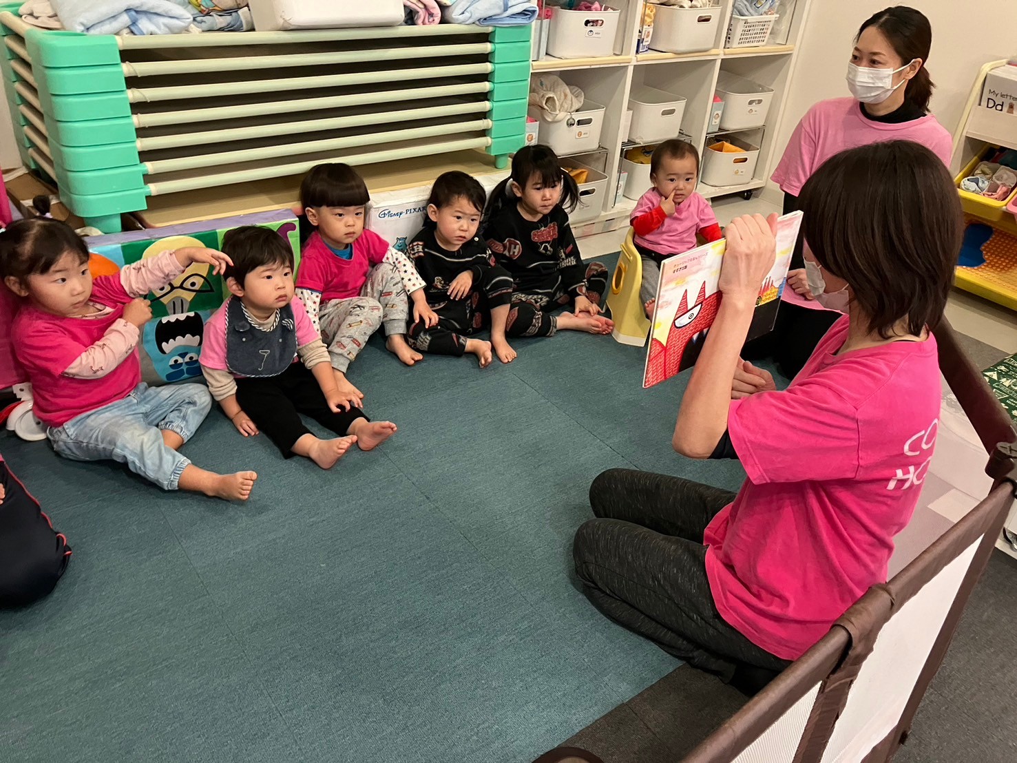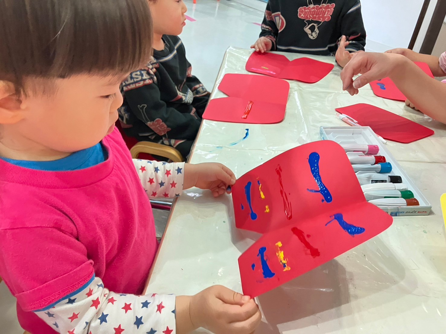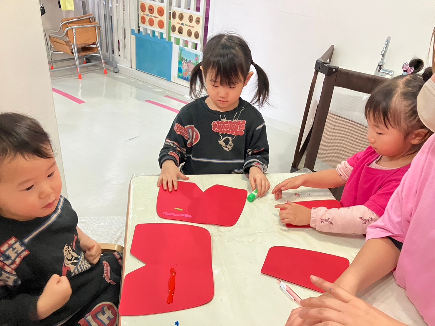 2歳児さんは、お友だち同士でどの色を塗ってるかなどを横目で見ながら、製作に集中して取り組み、競争が激しくなってきてます。
