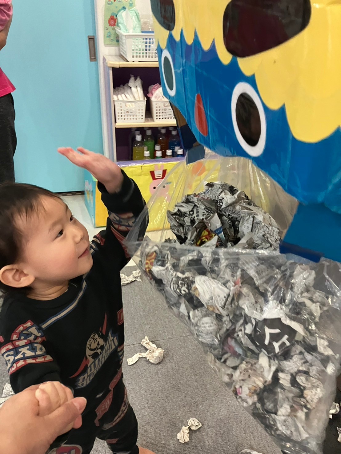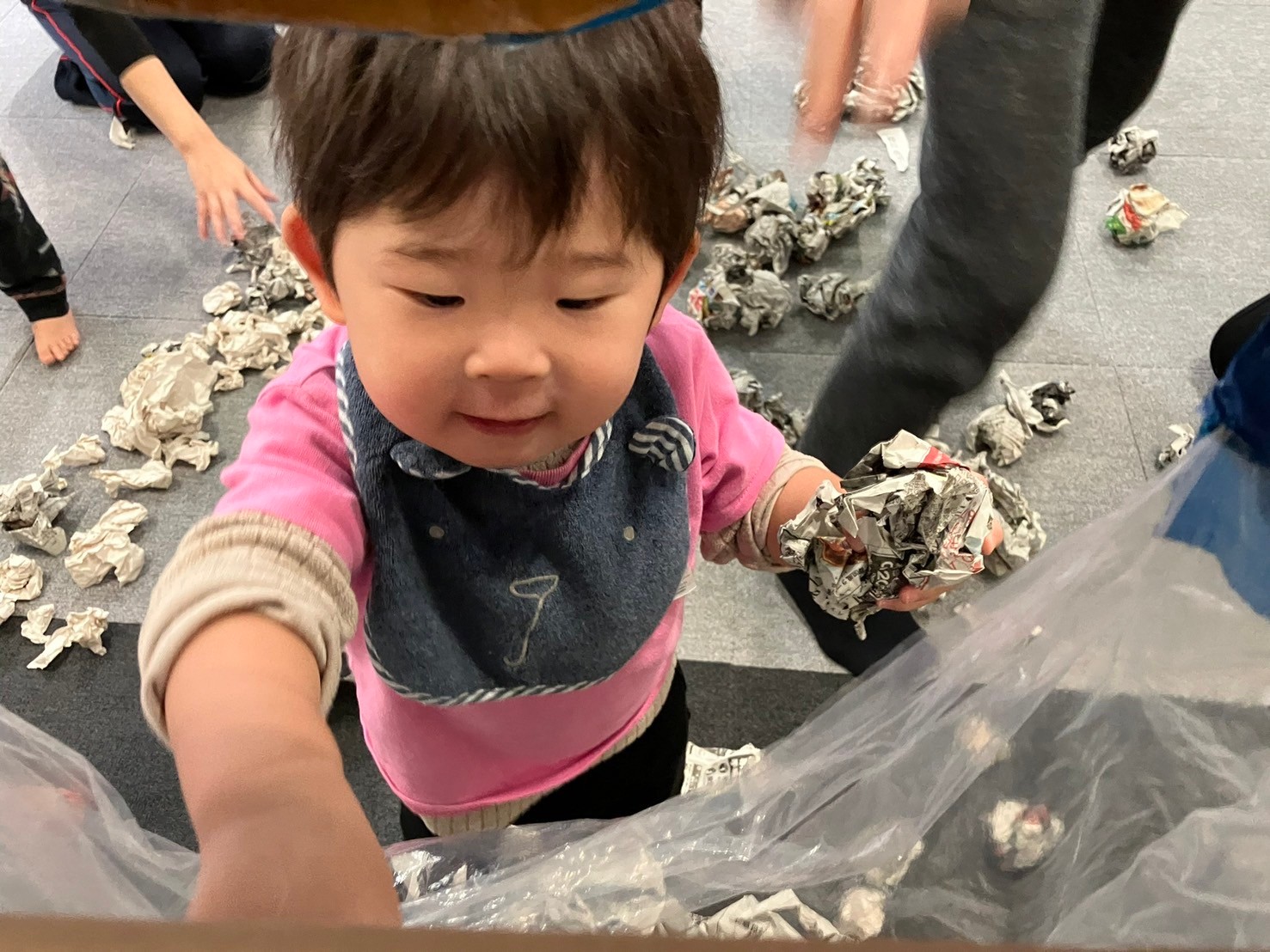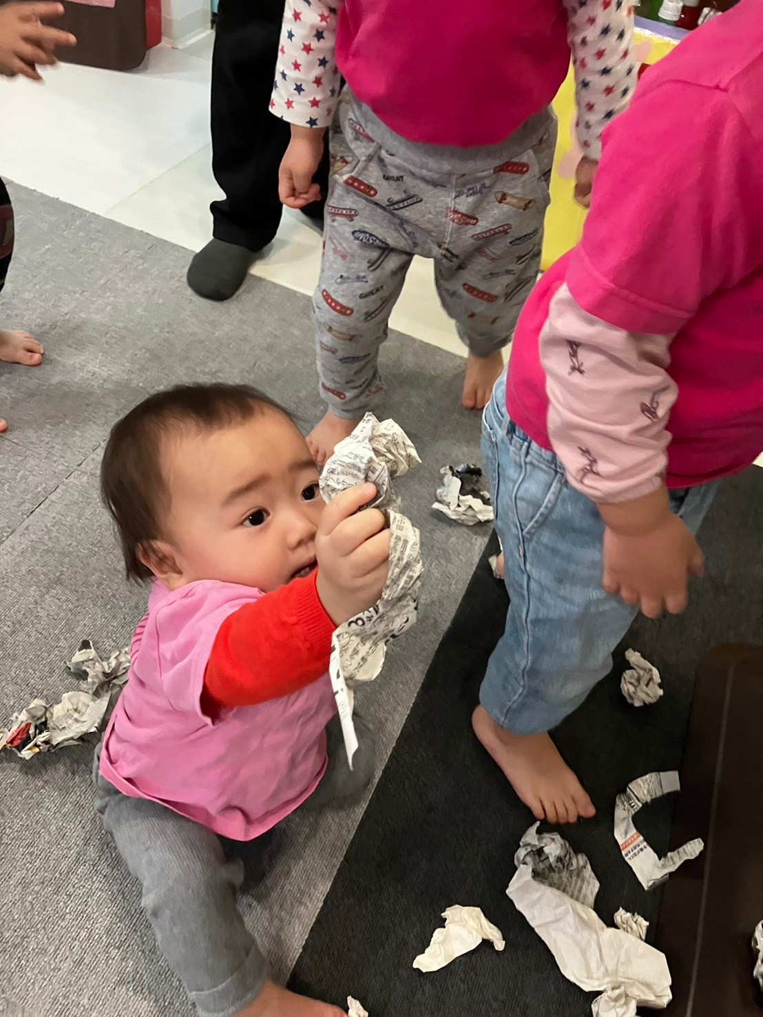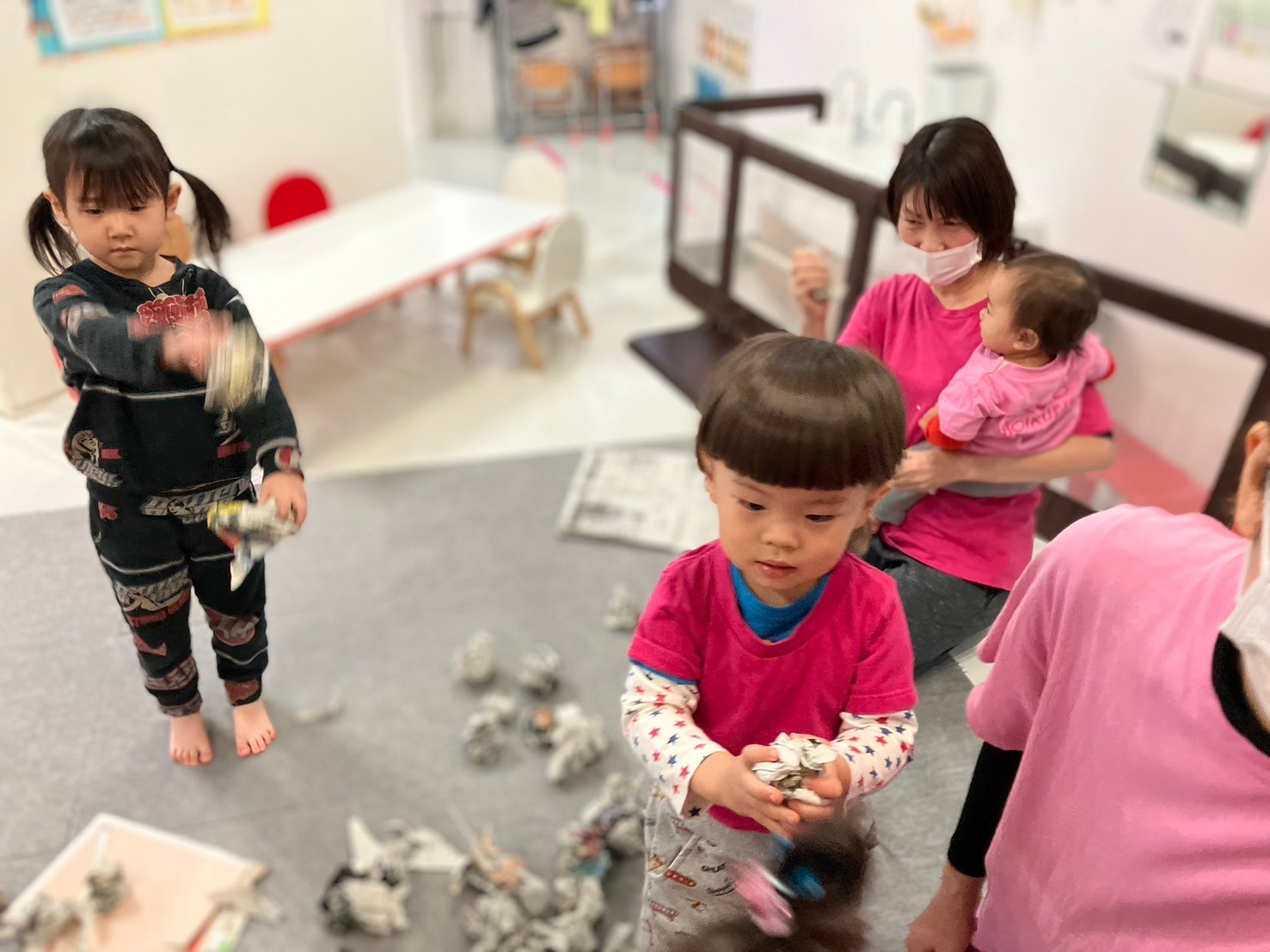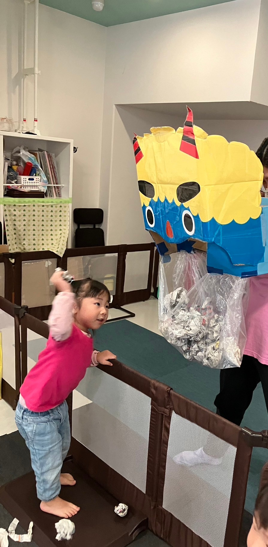 みんなで新聞紙をちぎってお豆を作って豆まきをしました。