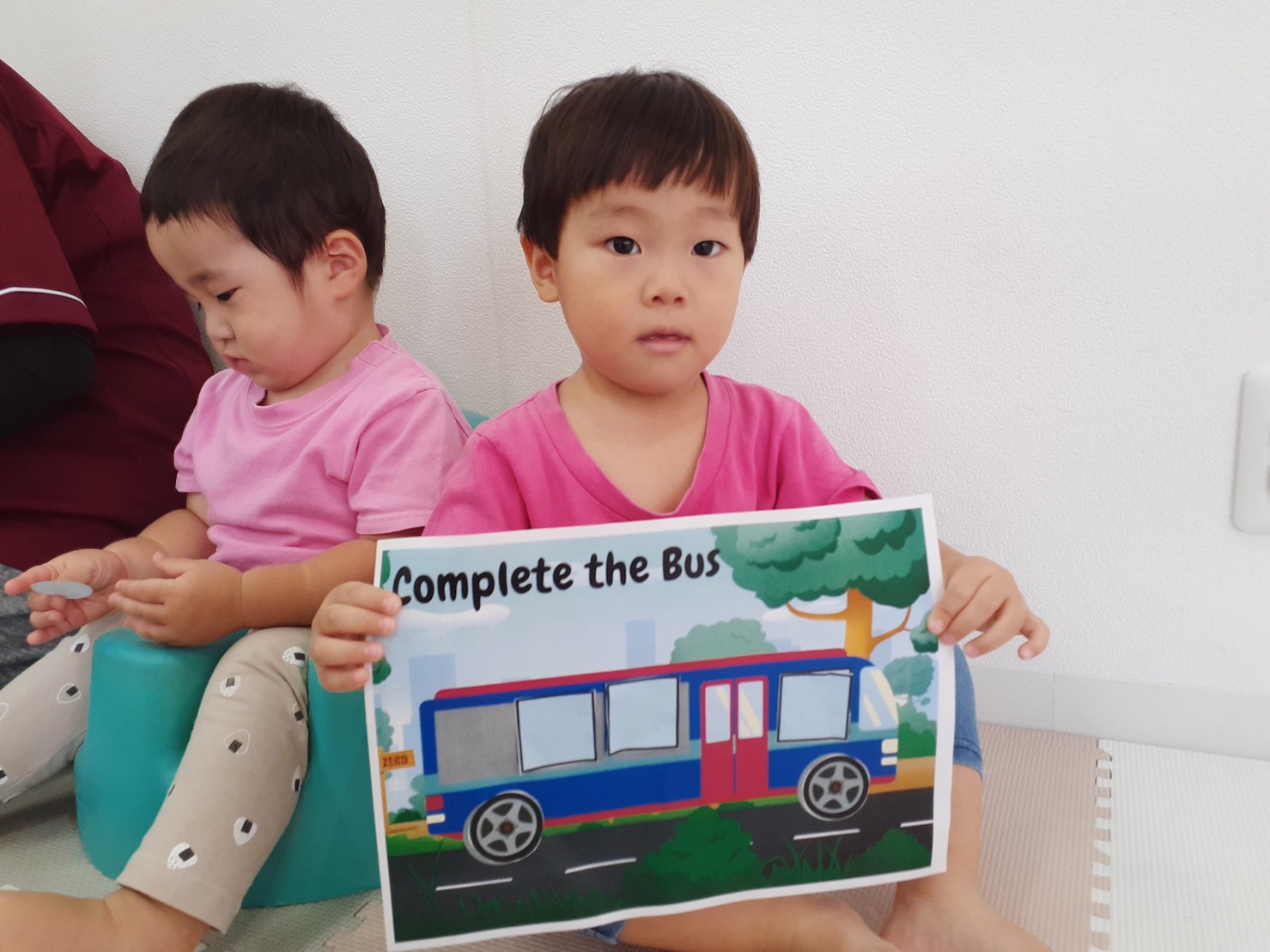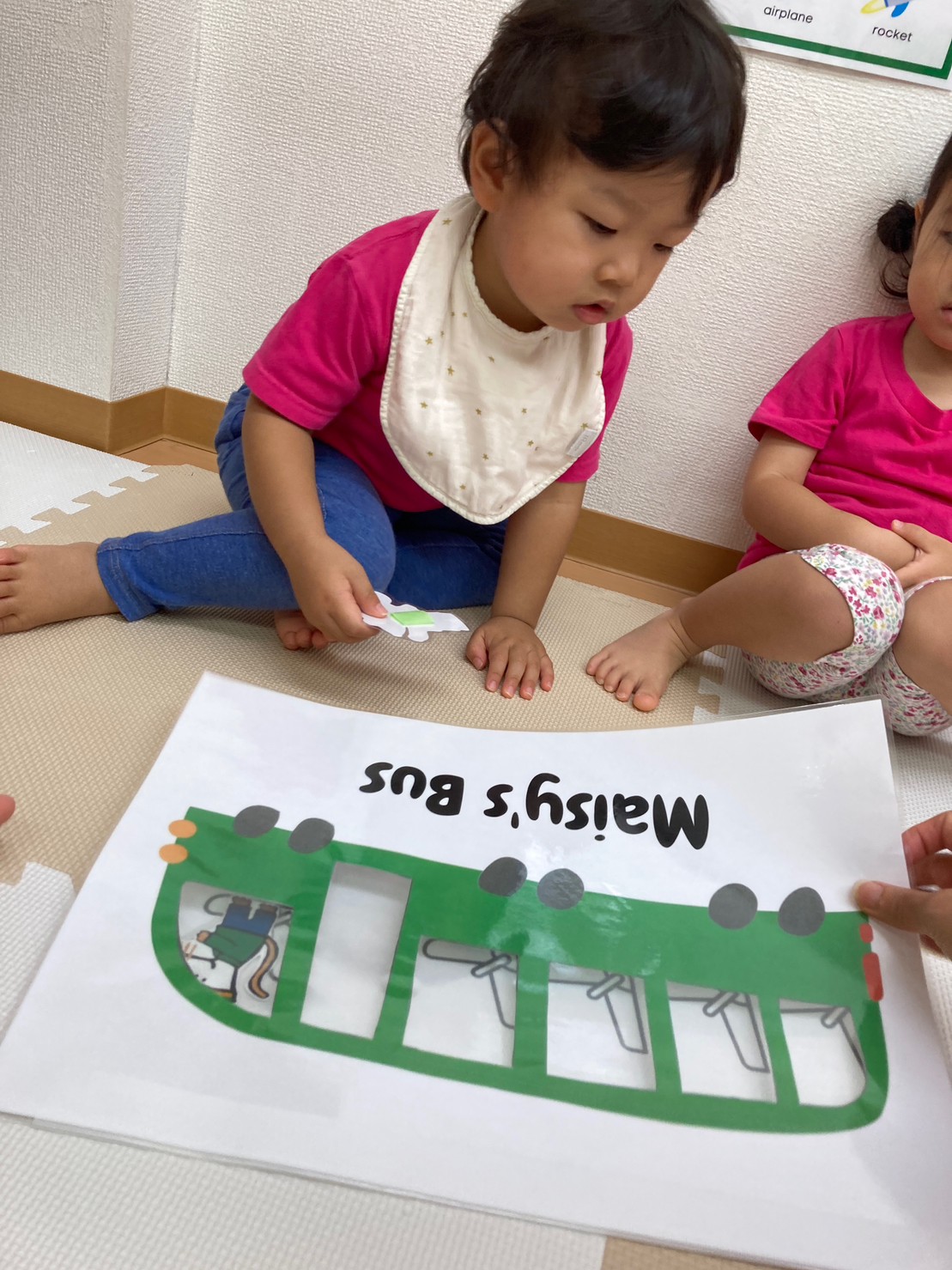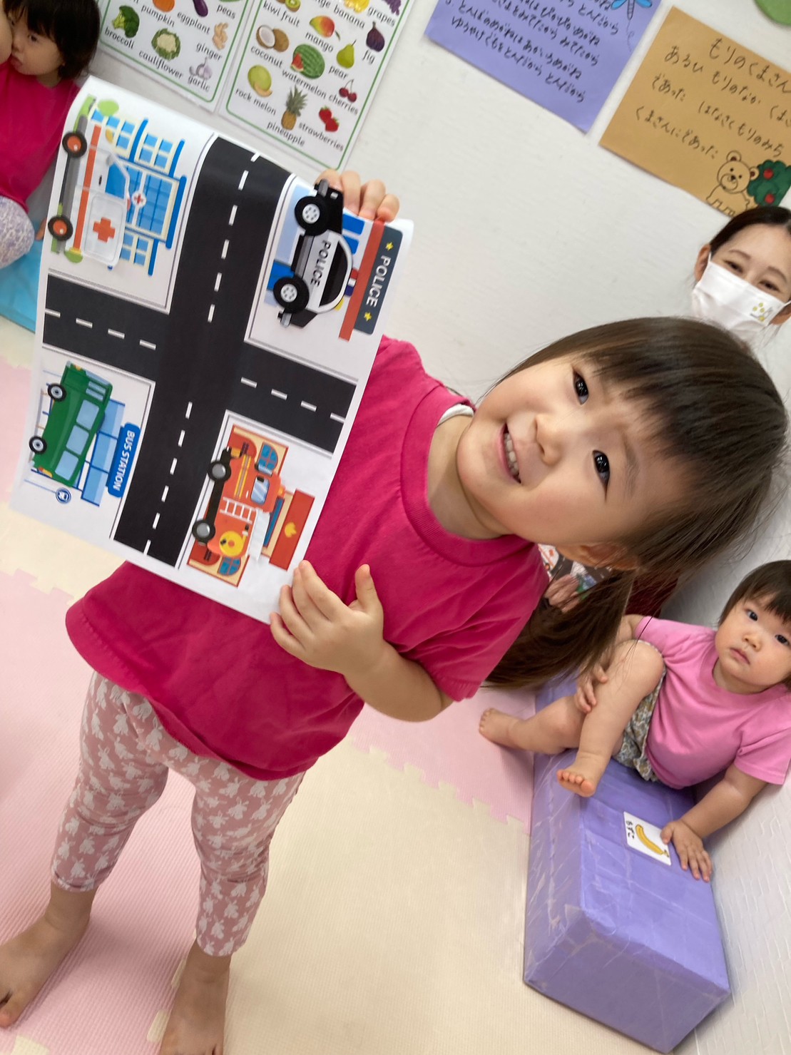 Bus(バス), Train(電車), Fire truck(消防車), Ambulance(救急車), Plane(飛行機), Boat(船), Car(自動車), Bicycle(自転車)など、身のまわりにある沢山の乗り物を英語で言ってみたり、真似をして遊んだりしました。