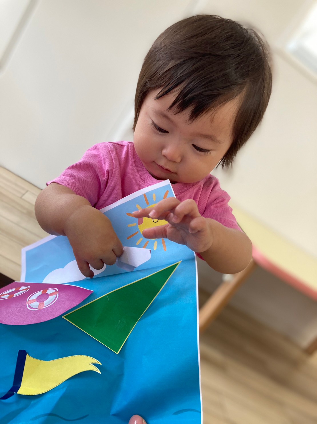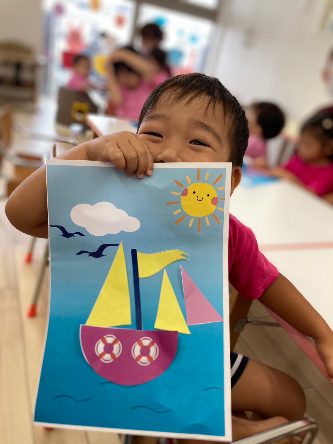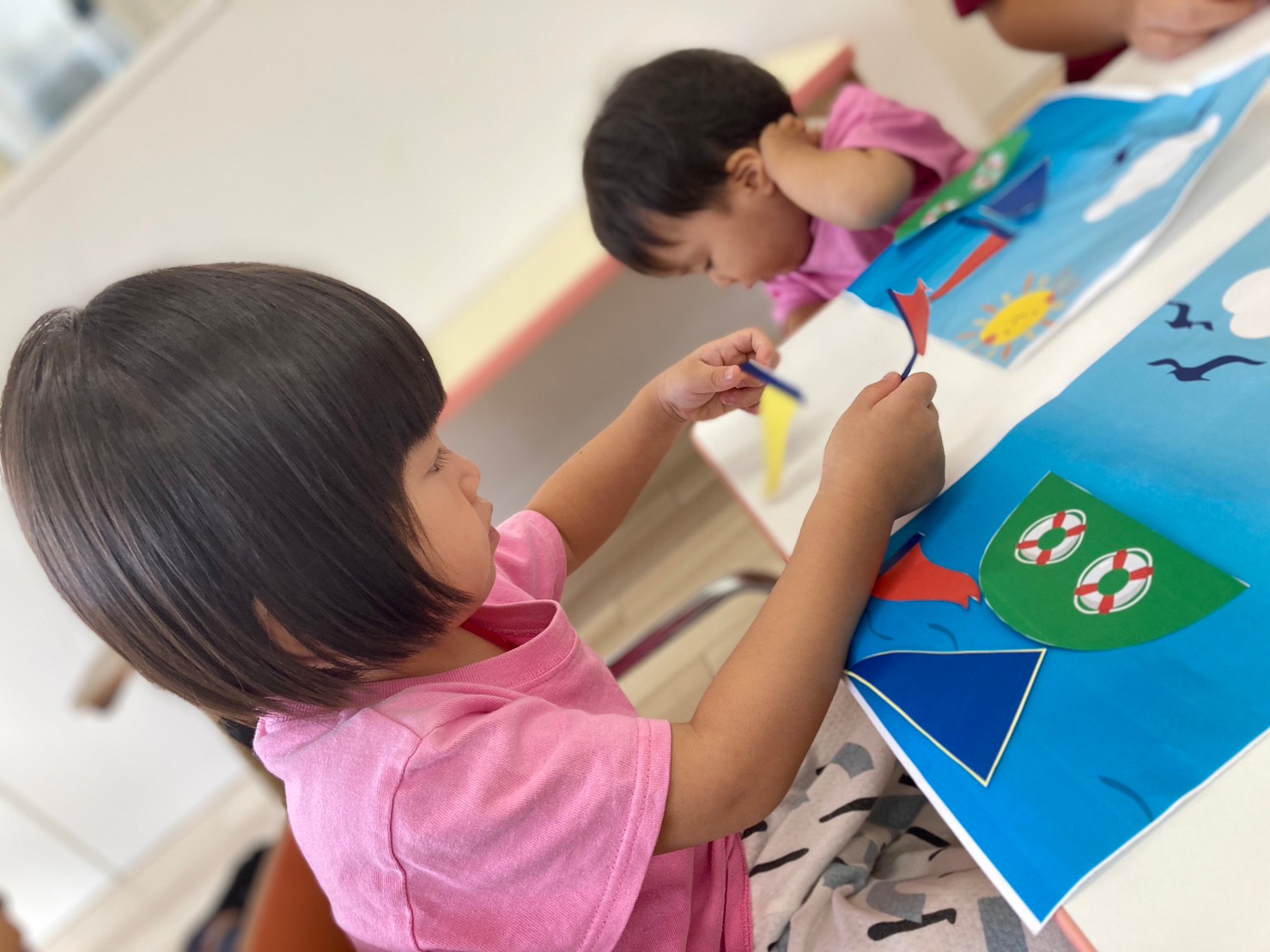 ・My sailboat 海の上に半円と三角の形のシールを合わせてボートのかたちを作る。