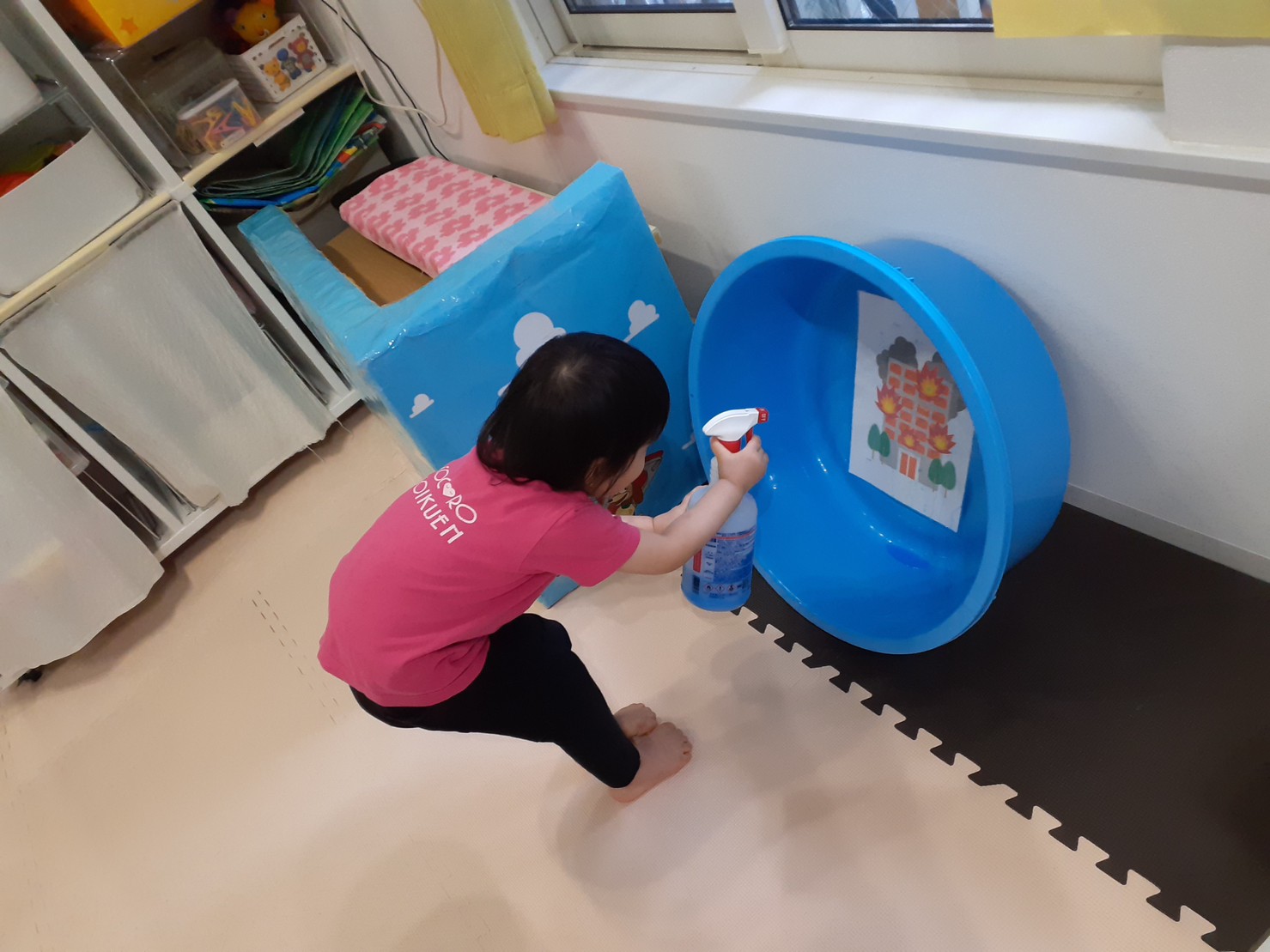 ・Fire fighter play 消防士になりきって、火事の街の火を消すために、水の絵を貼ってもらいました。