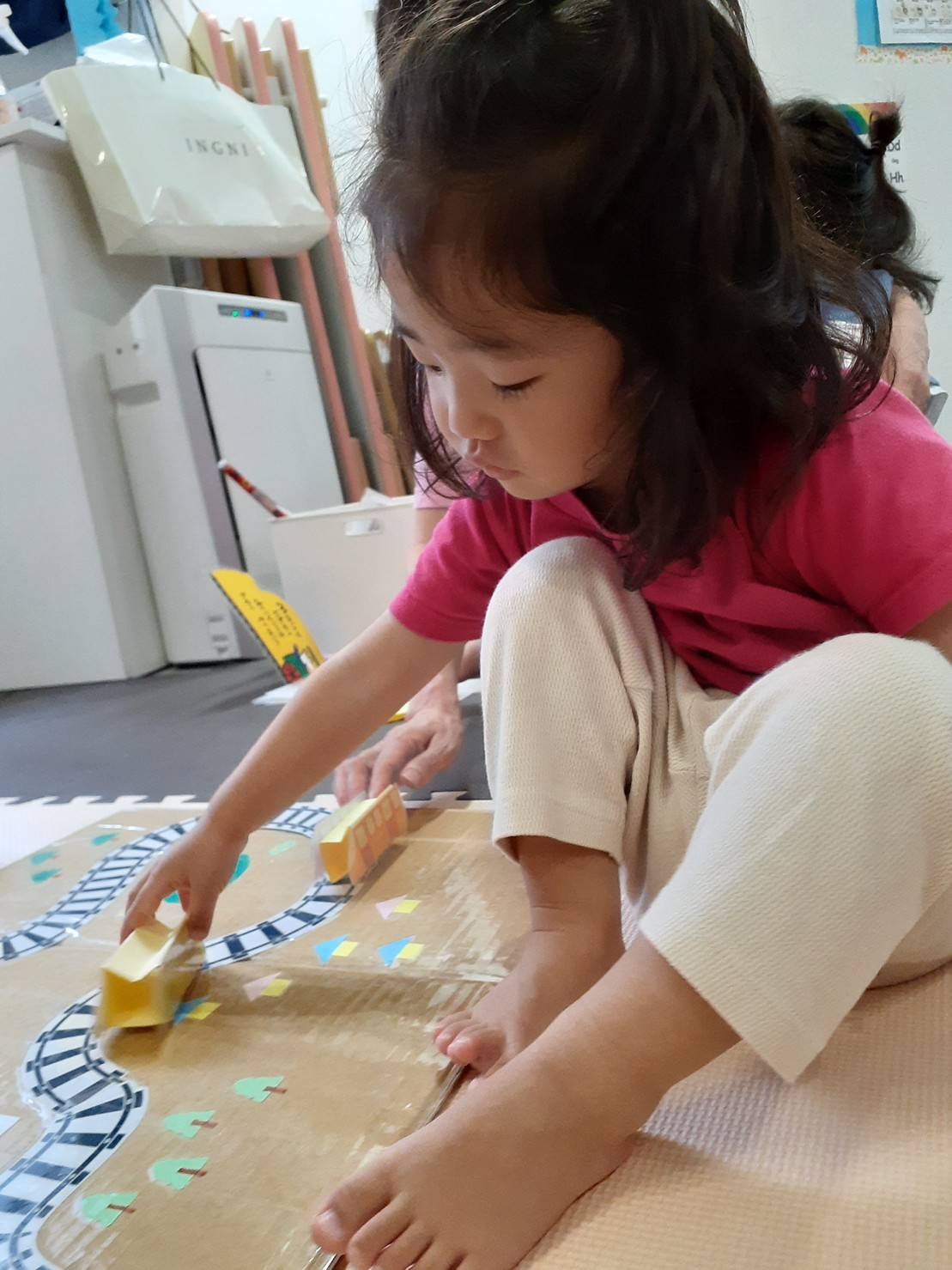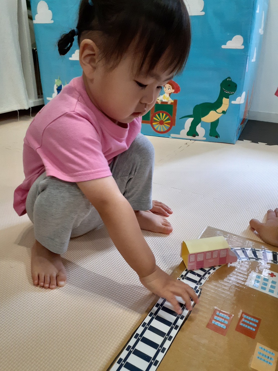 ・My Train 四角に折った筒の両面に電車の絵のシールを貼って電車を作り、出来た電車をレッスンで並べたレールの上を走らせて遊びました。