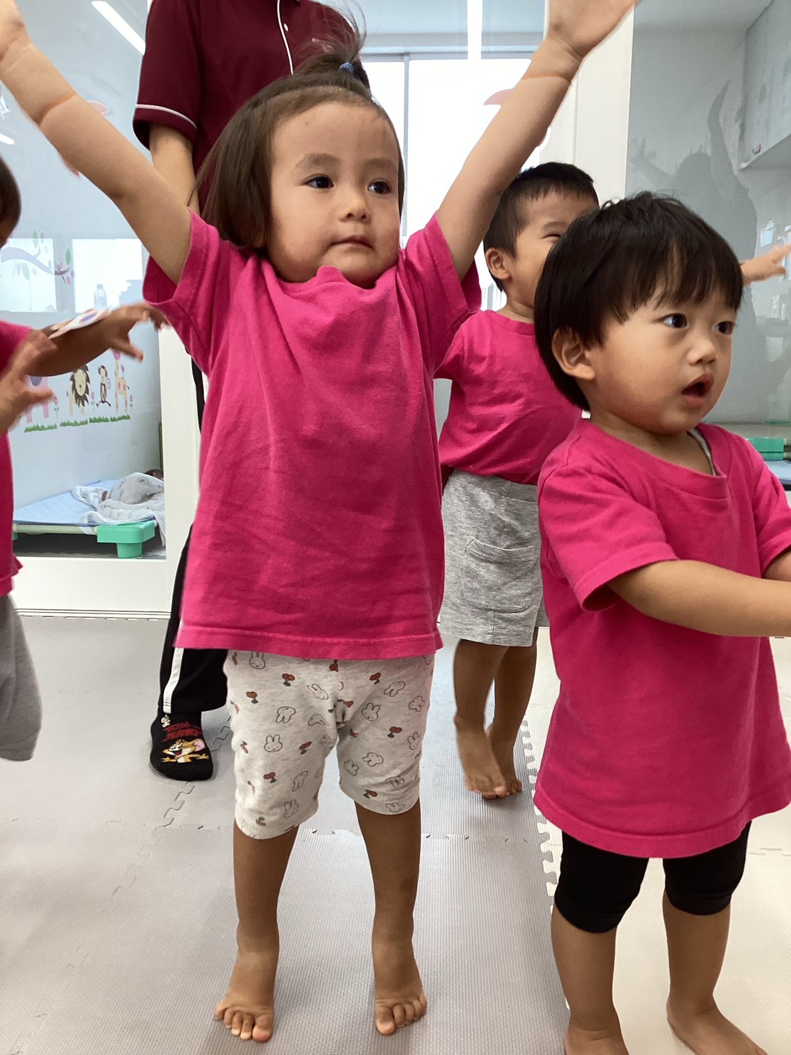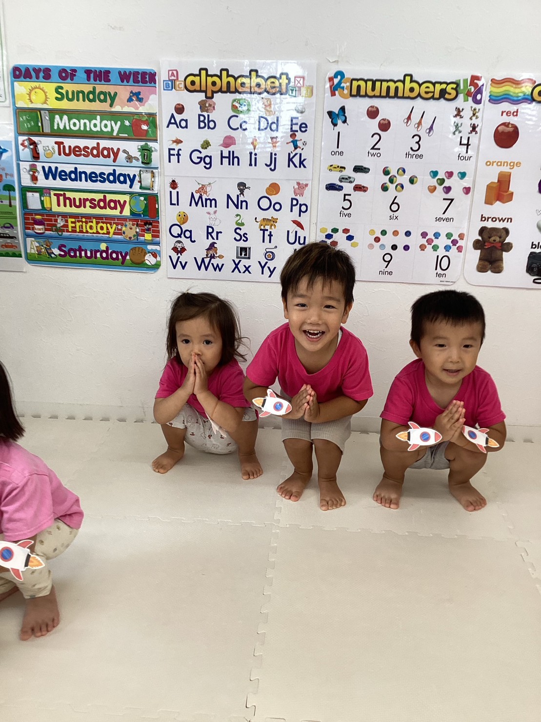 音楽が鳴り出すと、自然に手をぐるぐる回してタイヤ(wheels)が転がる真似や、ドアに見立てた手を広げてから勢いよく手拍子でドアの開閉(Open &Shut)の真似が上手に出来ていました。