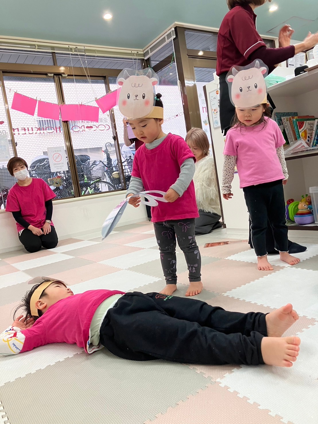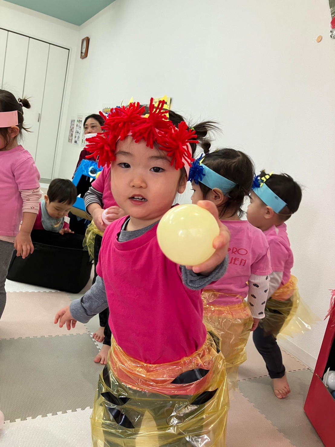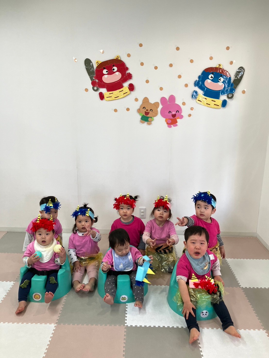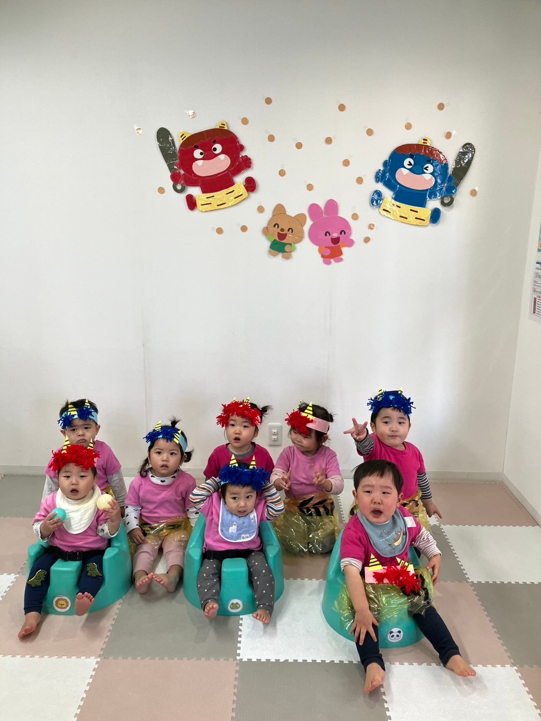 節分の歌である、「まめまき」や「おにのぱんつ」がみんなお気に入りの様子で節分の会が終わったあとも、歌を口ずさんでいる子がたくさんいましたよ♪