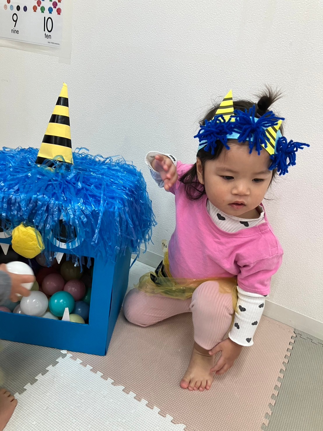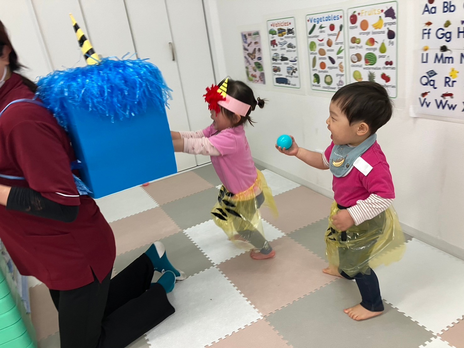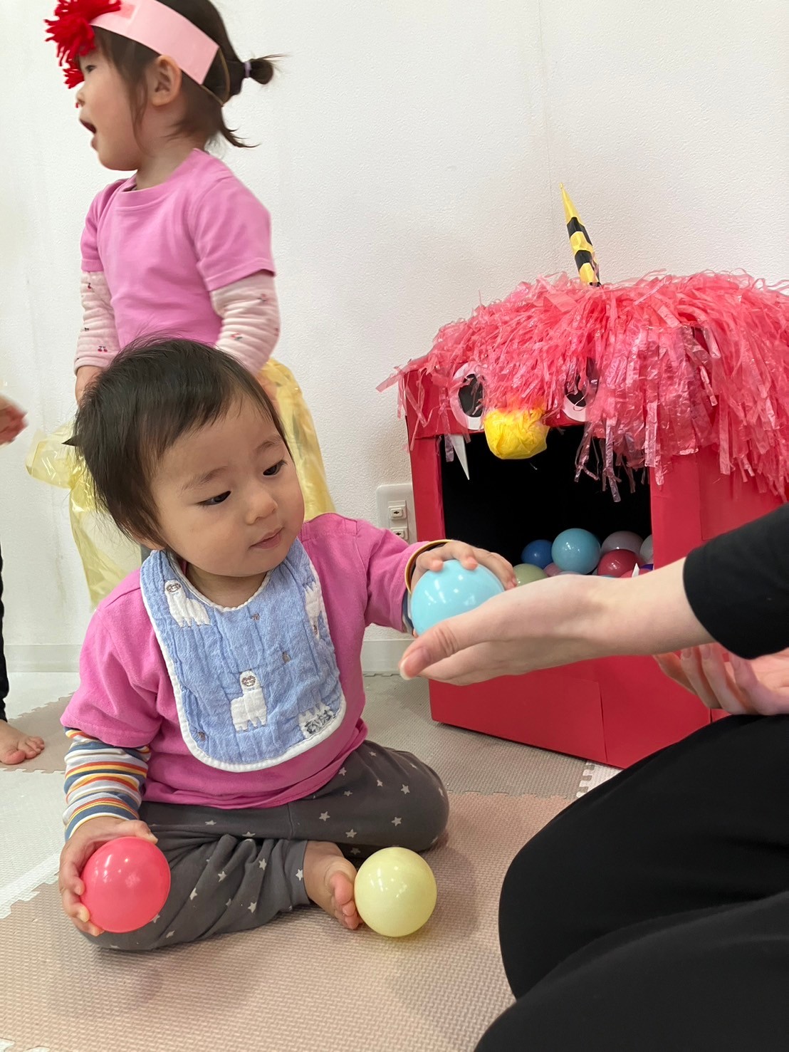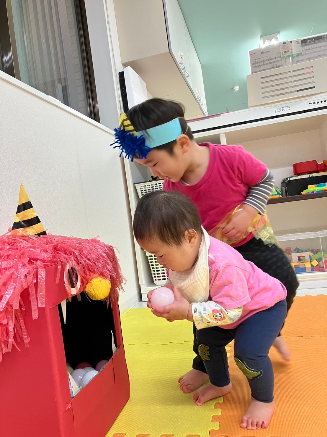 大きい声で「おには〜そと!」「ふくは〜うち!」と言いながら鬼の箱にボールを入れて遊びました。
