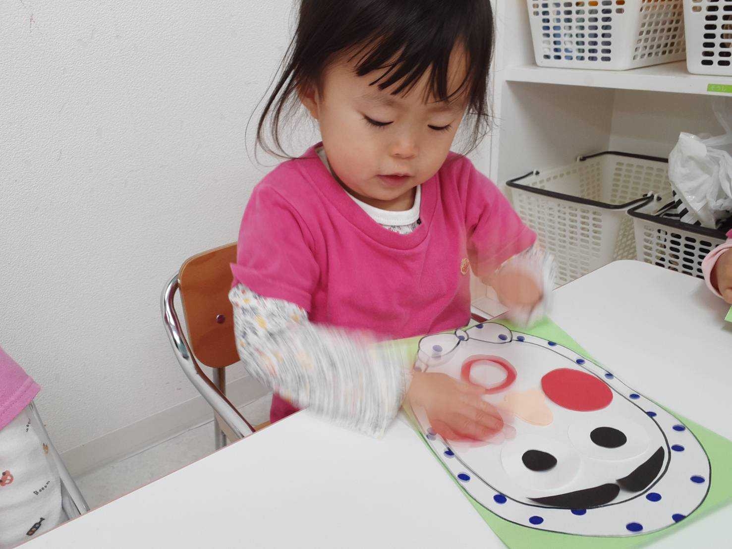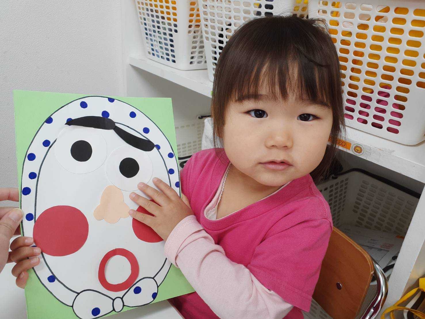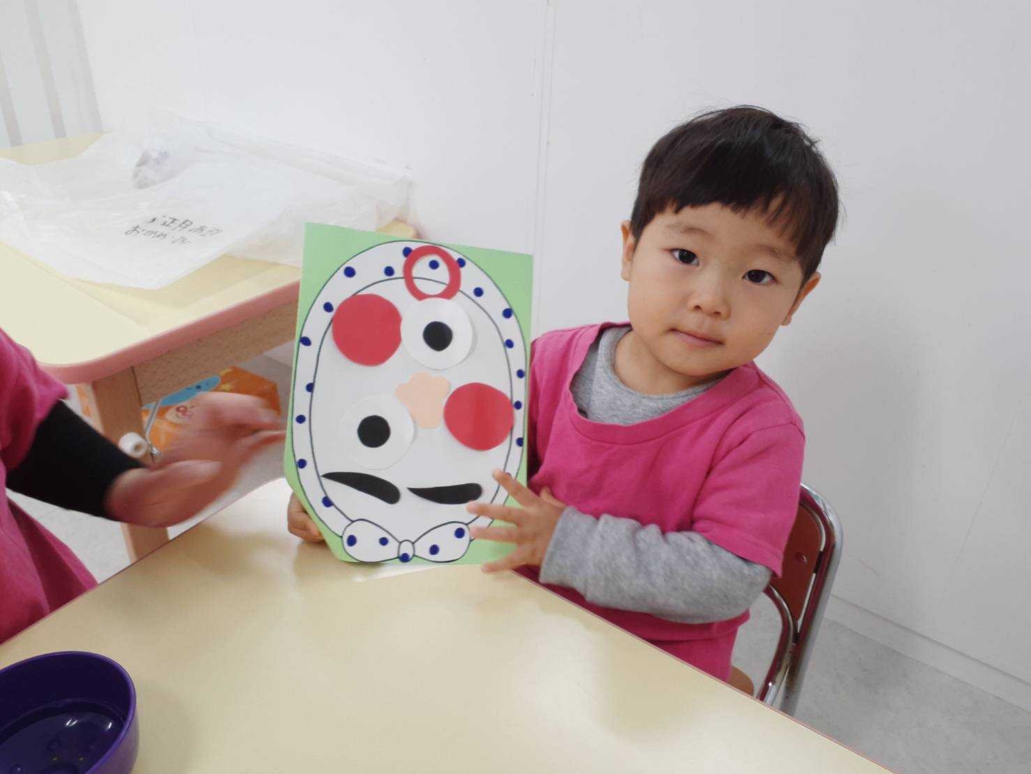 「おめめー!くちー!」といった掛け声とともに、顔のパーツを理解し、様々な表情を楽しみながらおかめを完成させていました。