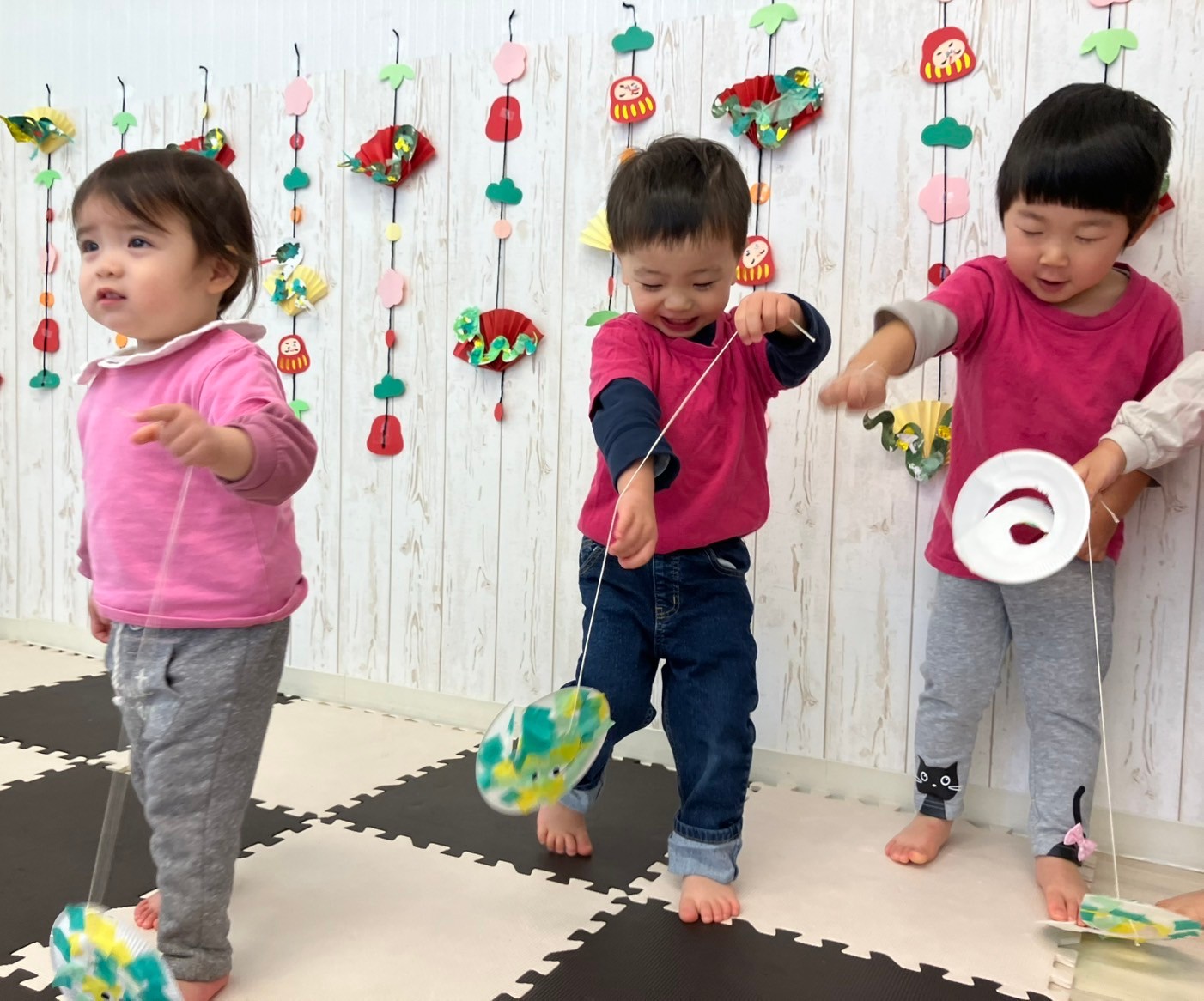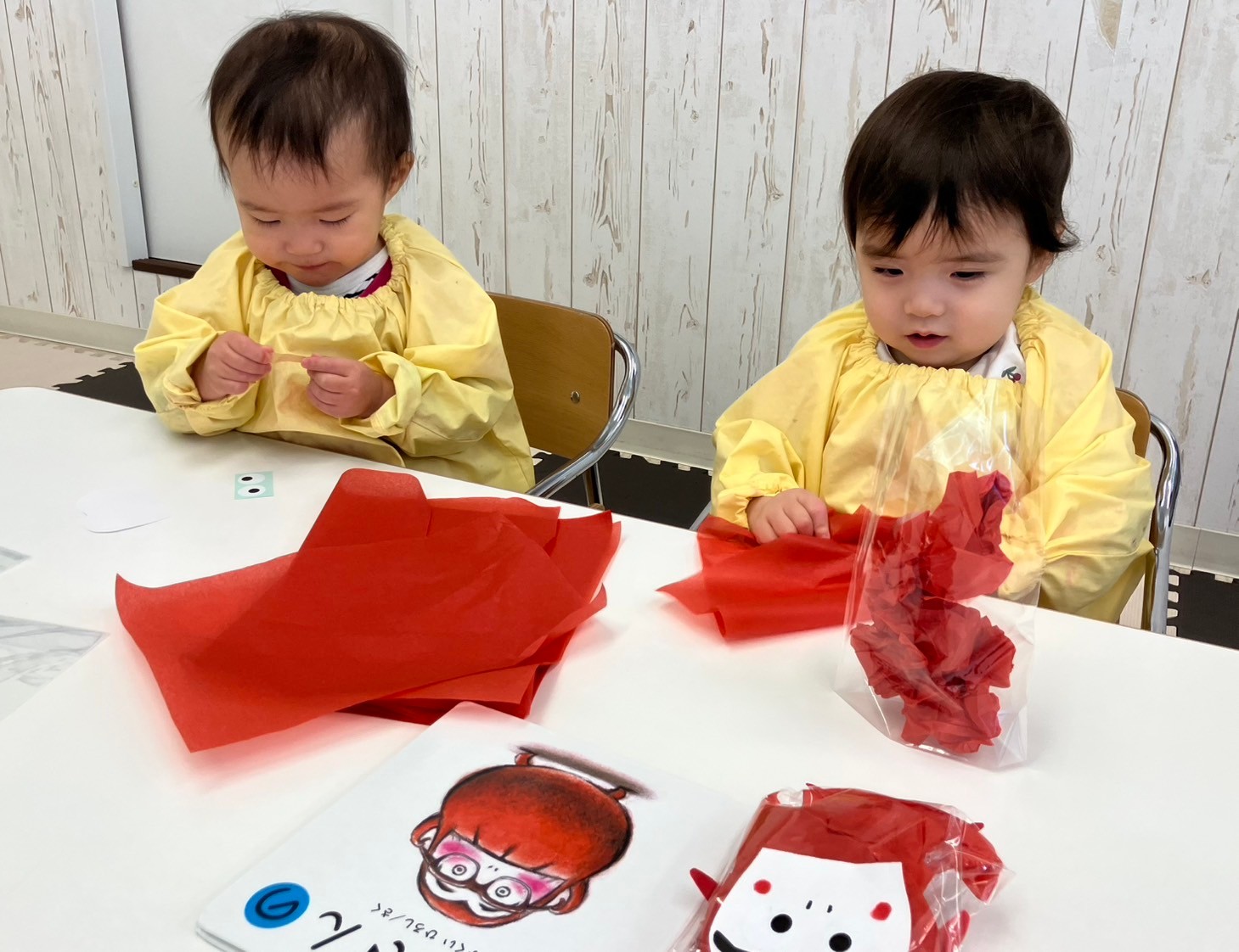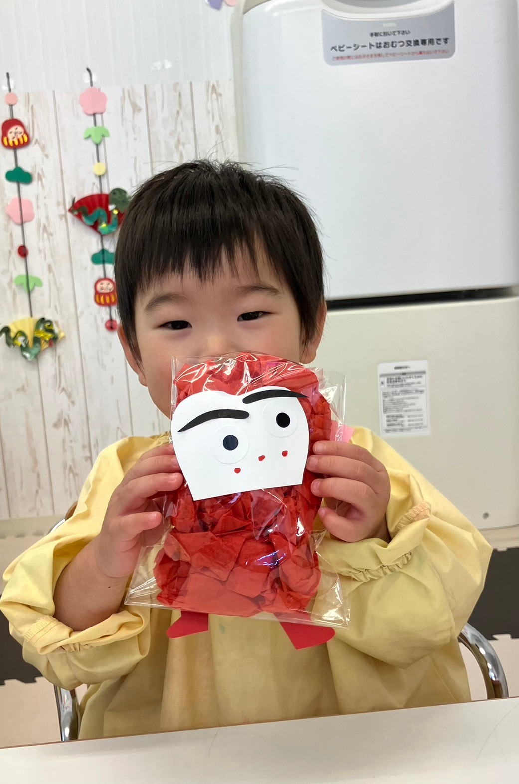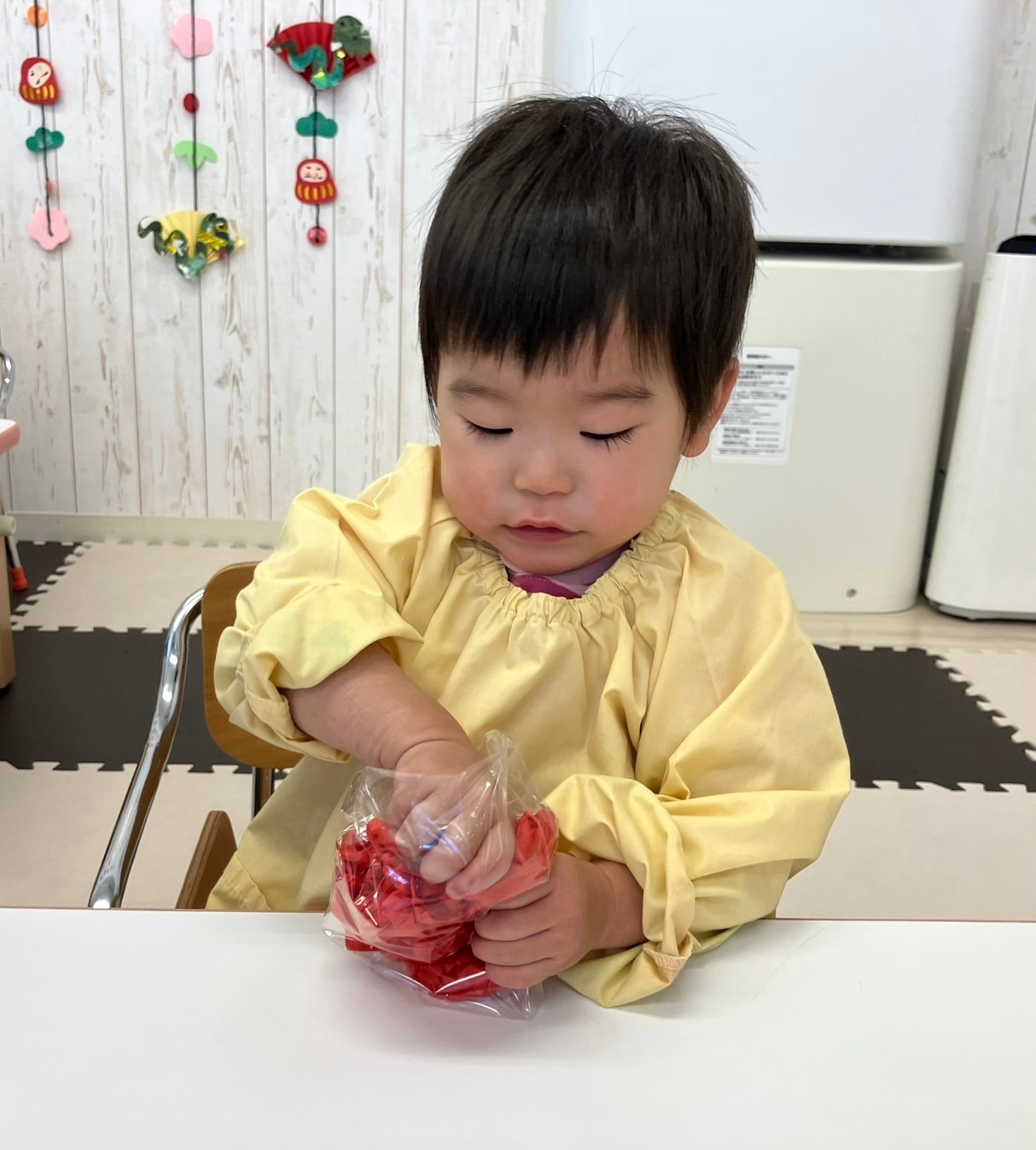 花紙をラッピング袋に入れ、完成しただるまを左右に揺らし、「だ〜る〜まさ〜んが‥」と絵本の一コマを再現しながら遊ぶ姿が見られ、とても可愛かったです。