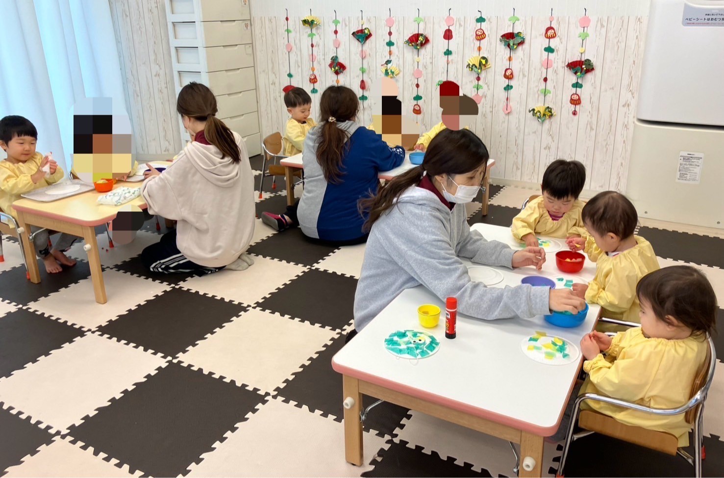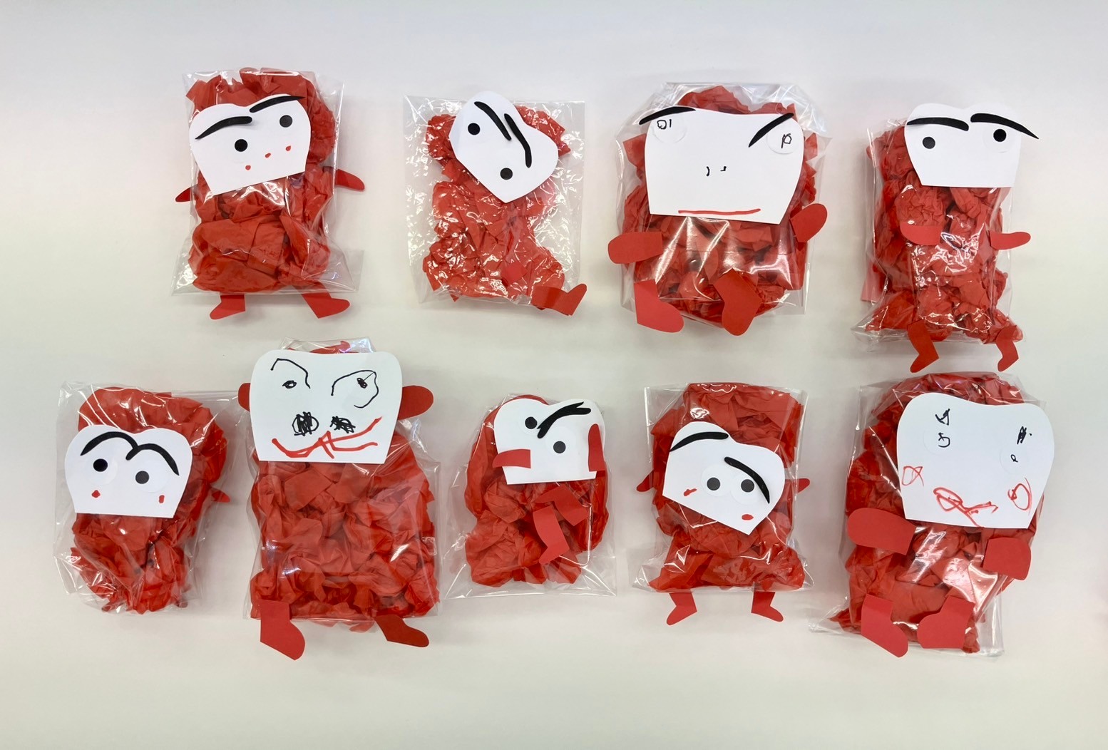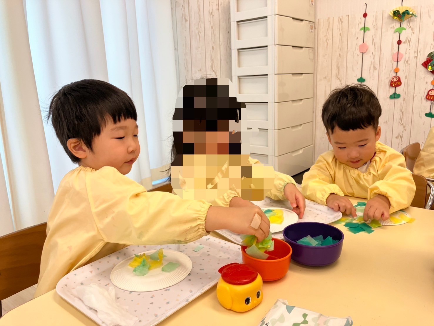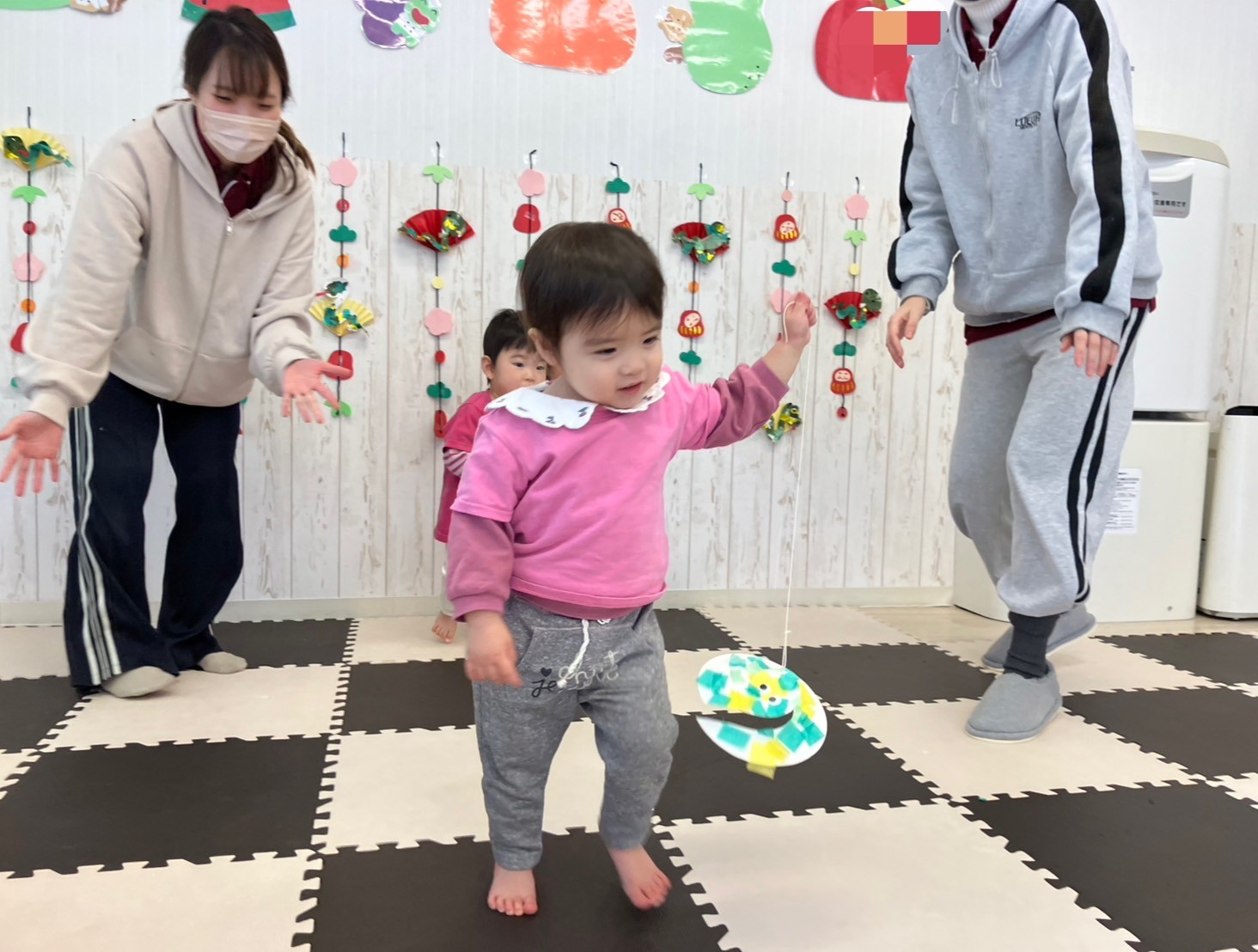 花紙をラッピング袋に入れ、完成しただるまを左右に揺らし、「だ〜る〜まさ〜んが‥」と絵本の一コマを再現しながら遊ぶ姿が見られ、とても可愛かったです。