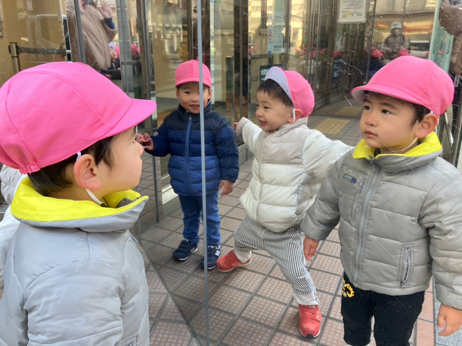 散歩道中にある、全身鏡を見て、お友だちとケタケタと笑い、仲睦まじい姿もとても可愛らしいです。