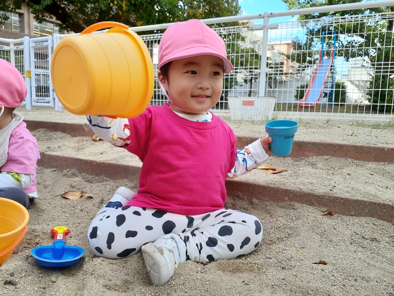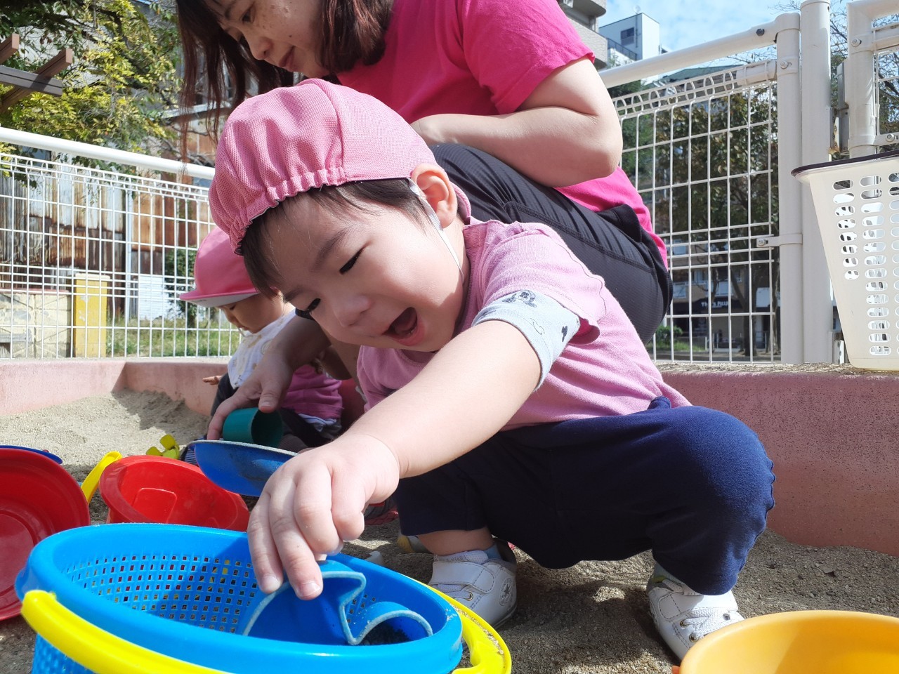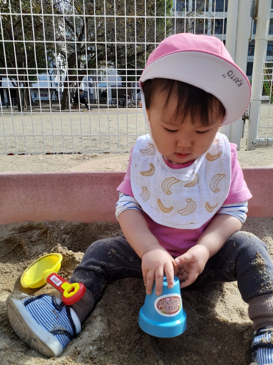 涼しい風を浴びながら砂の感触楽しんだり、自分の足で歩ける嬉しさを味わったりしていた0歳児クラスのお友だち。