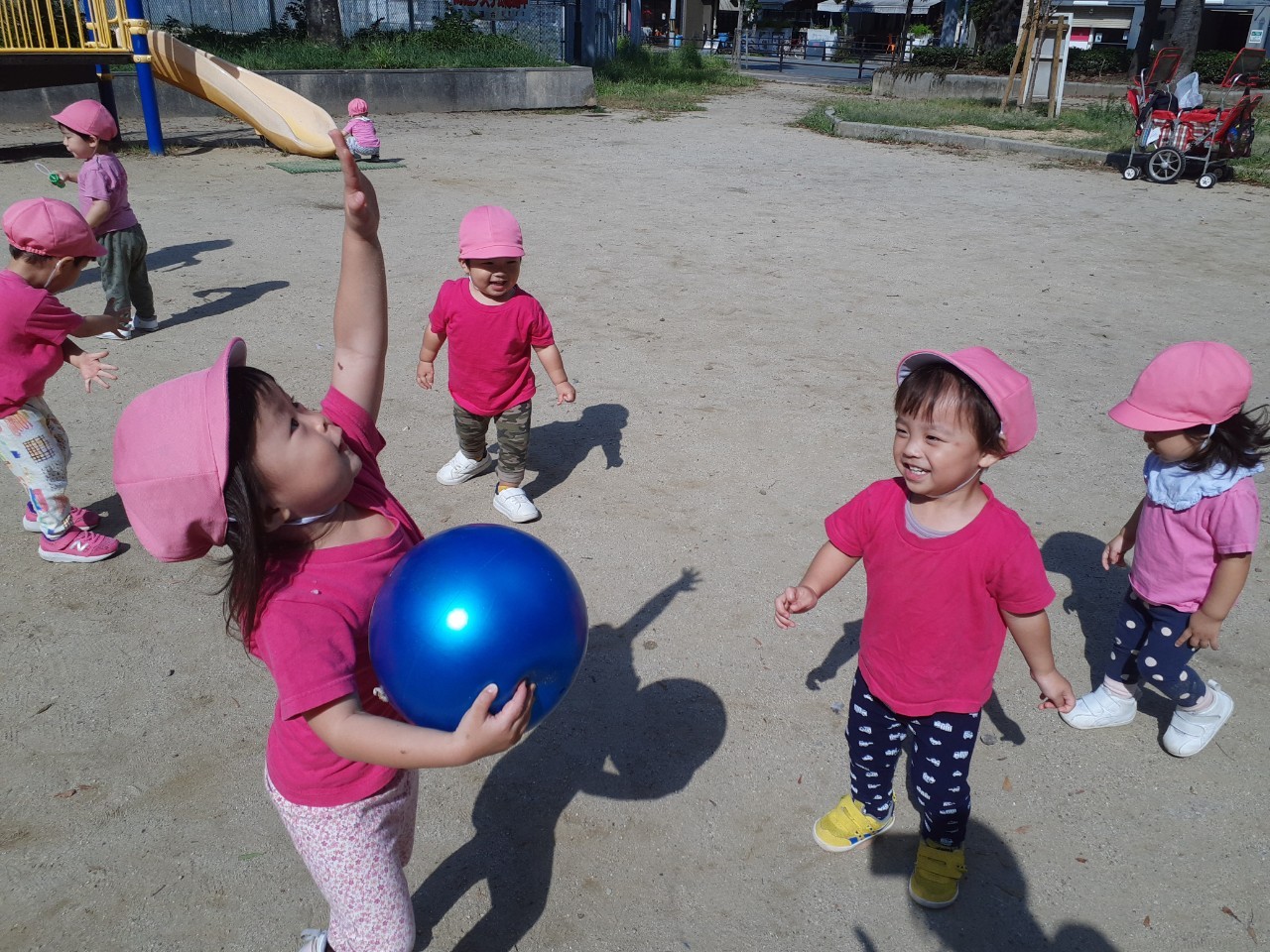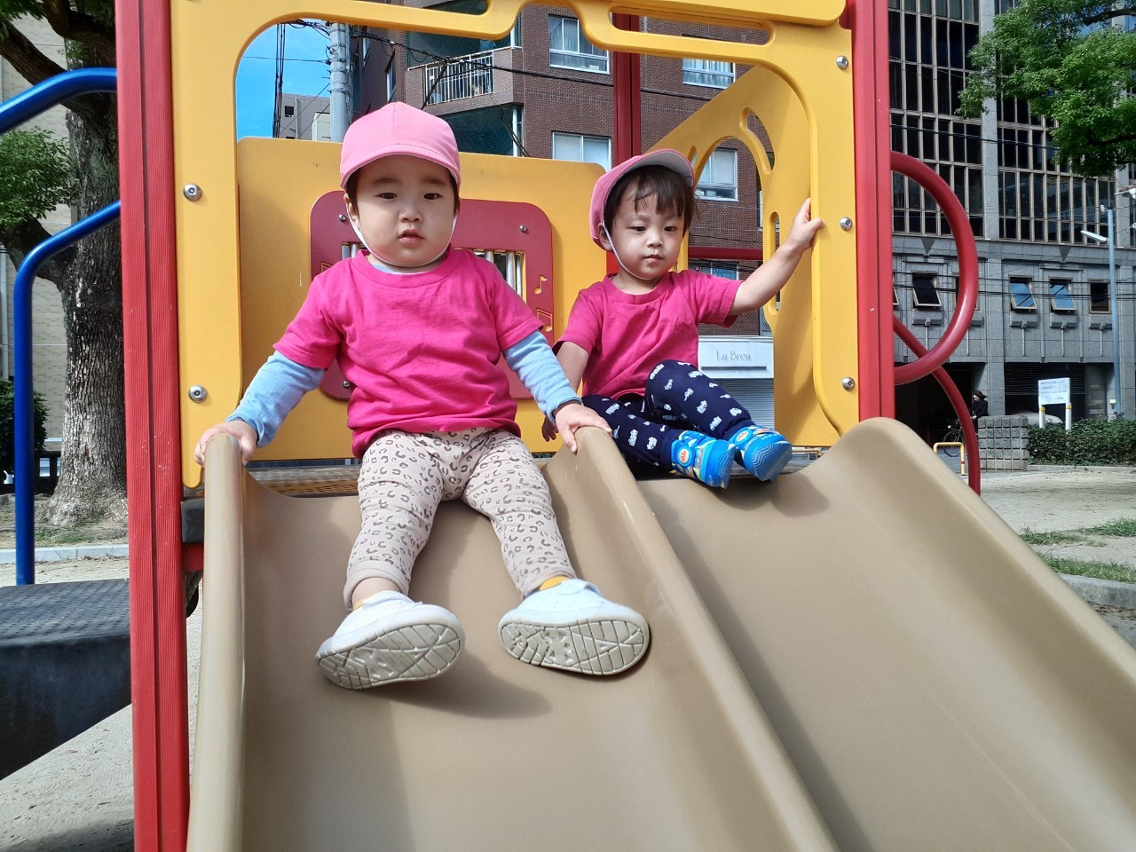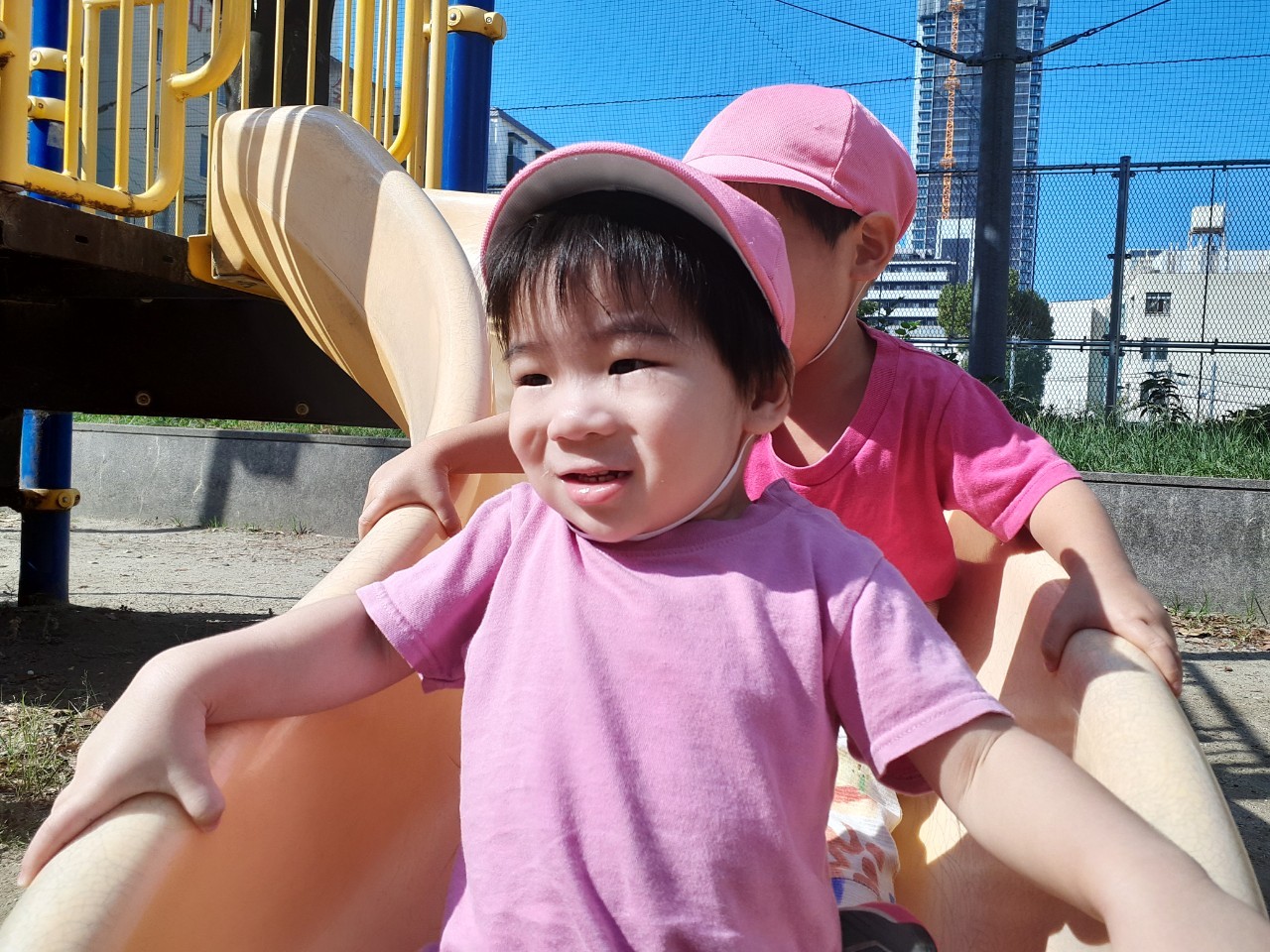 公園では、好きな遊具を満喫したり保育者の動きを真似てダンスをしたり、模範あそびが上手になってきました。