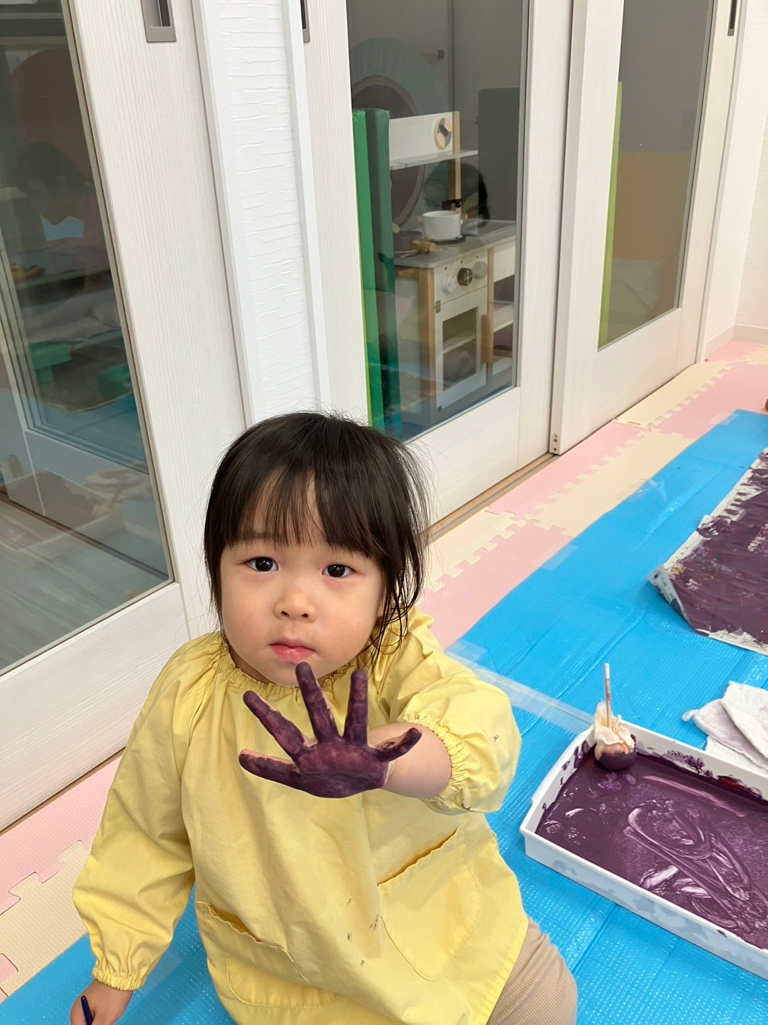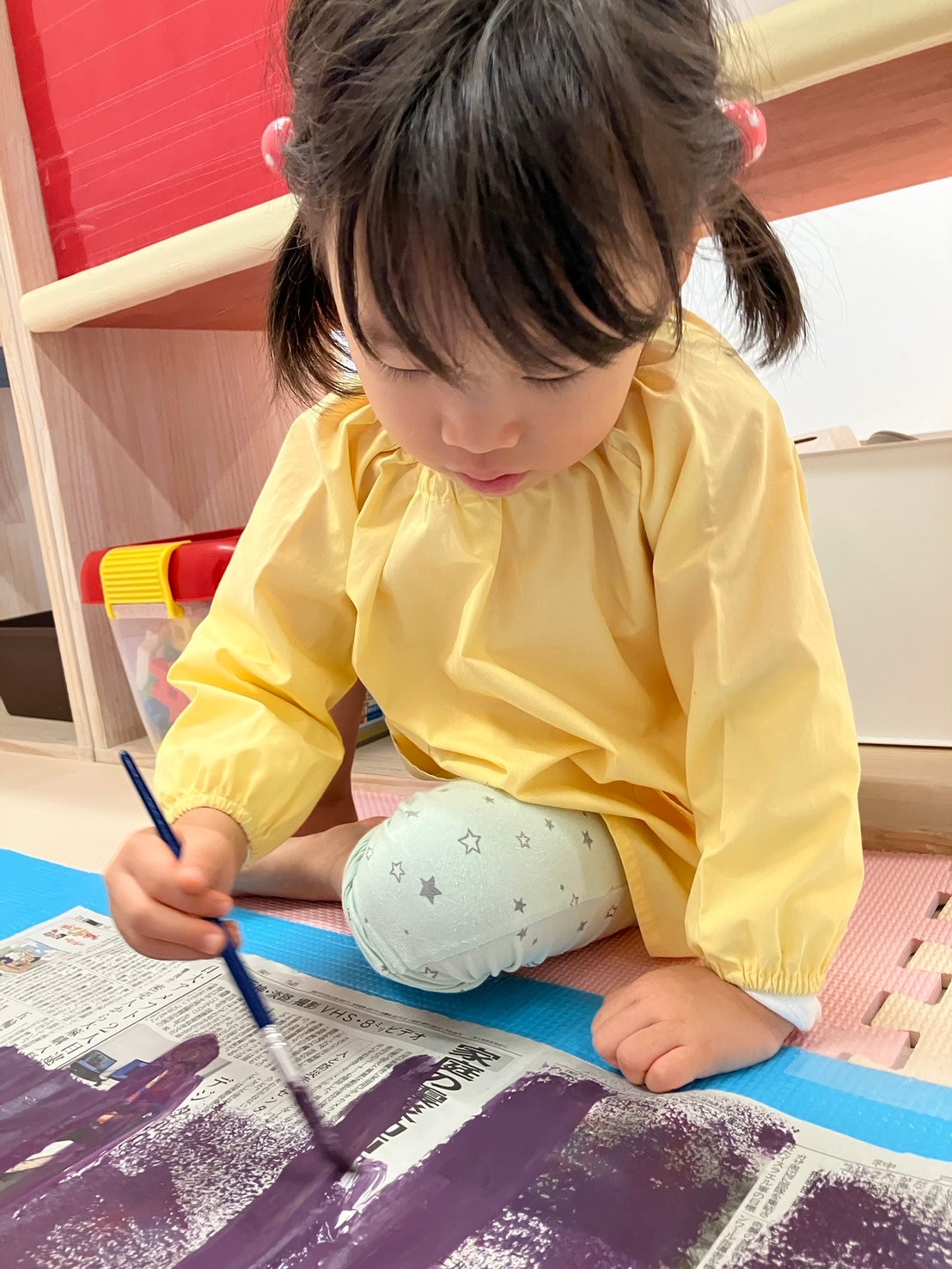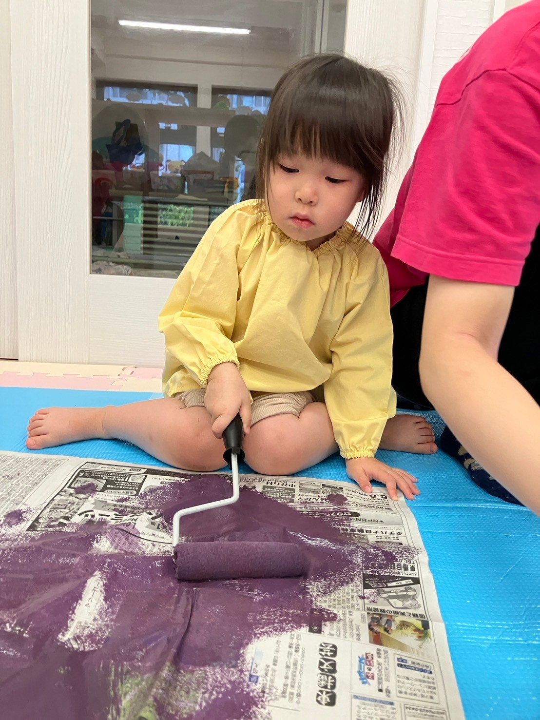 秋といえばさつまいも!新聞紙の一面を筆やローラーで紫色に塗り、さつまいも作りをしました。