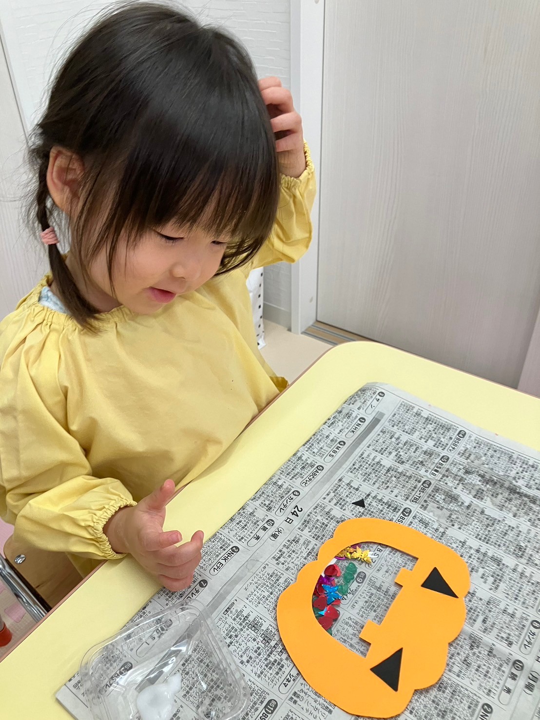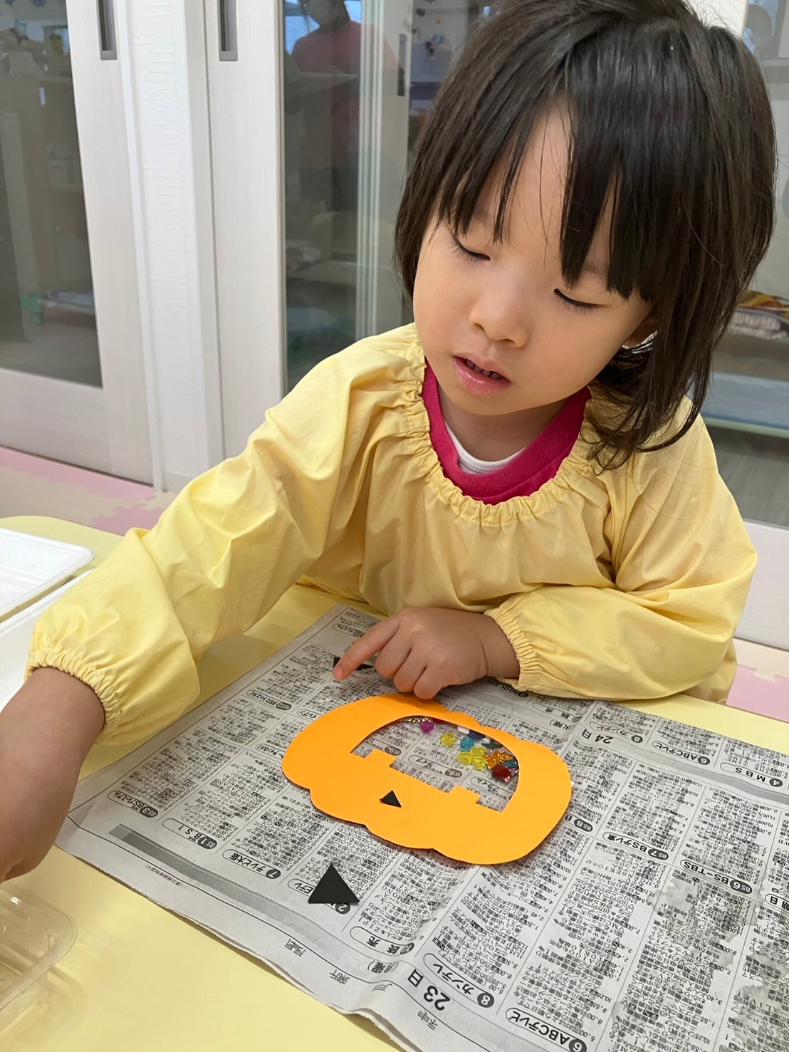 それぞれ好きなビーズやスパンコールを選んで袋の中に入れ、ジャックオランタンの目の鼻を糊でつけましたよ。