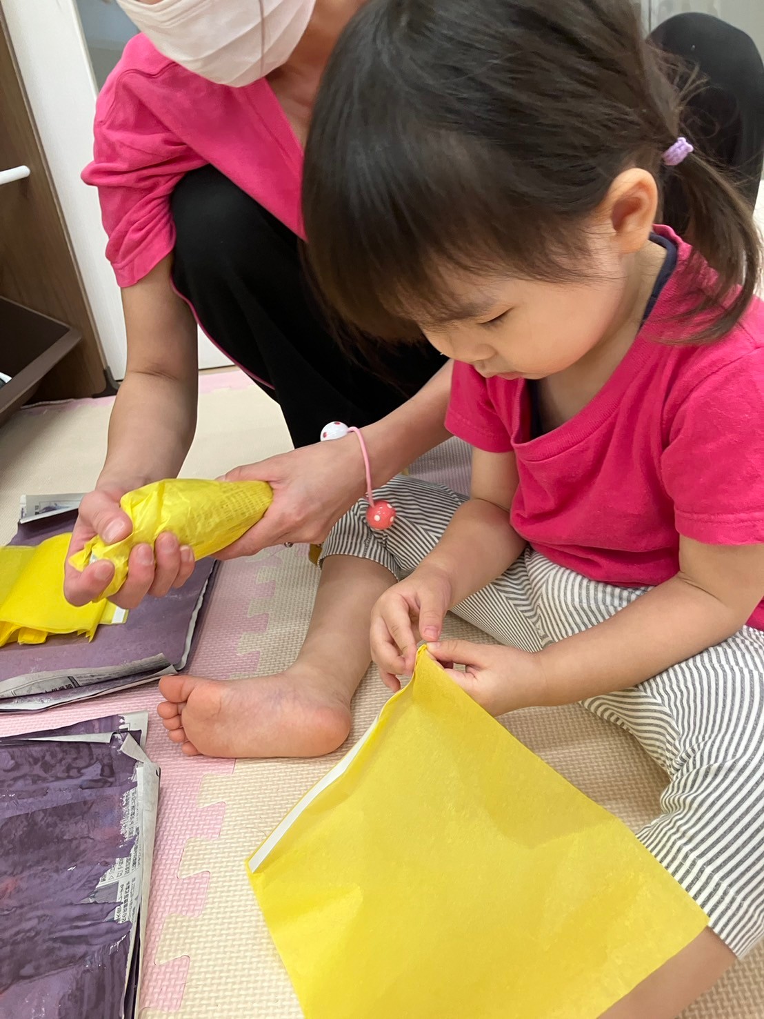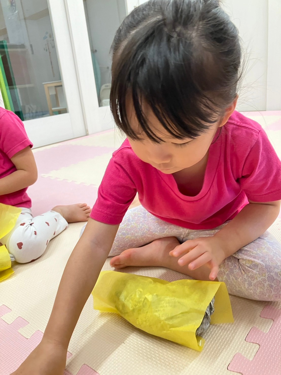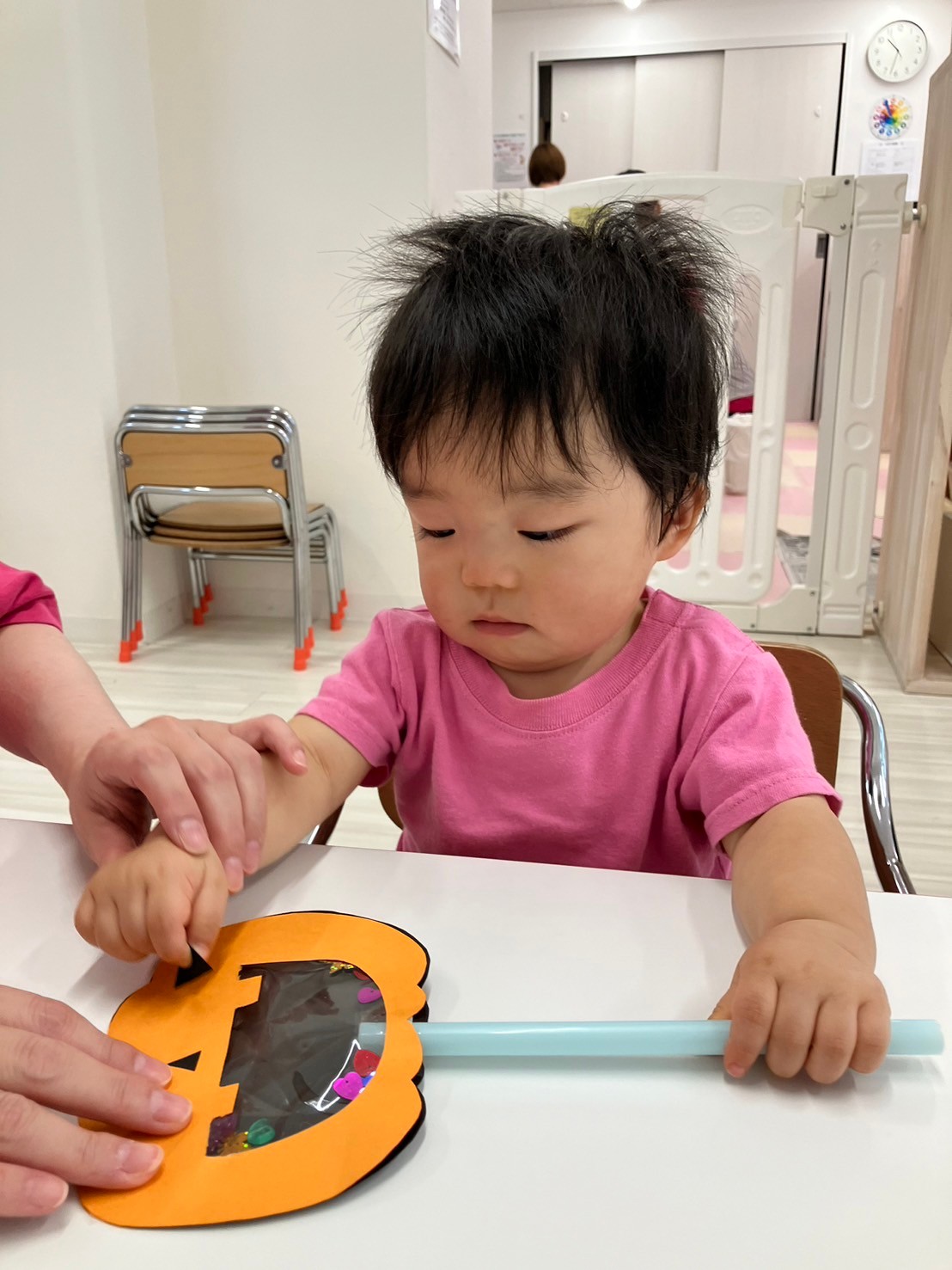 完成するとステッキの棒を持って振り、入れたビーズがシャカシャカなる音を楽しんでいました。