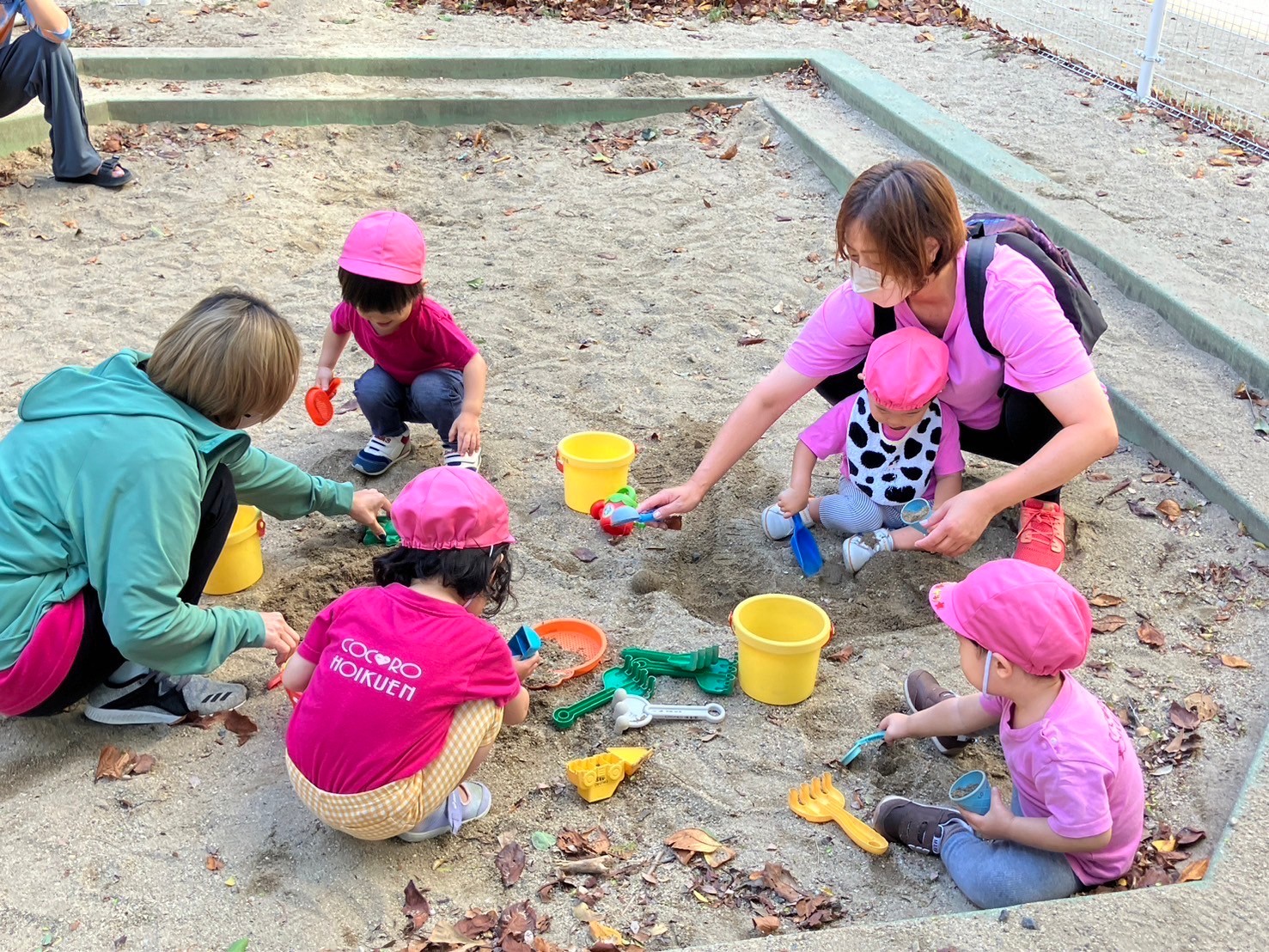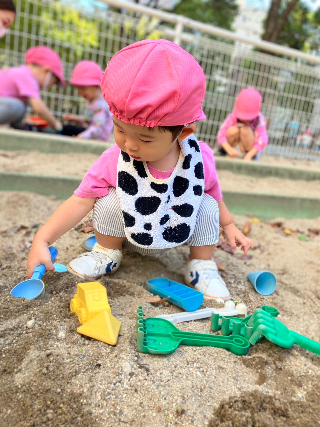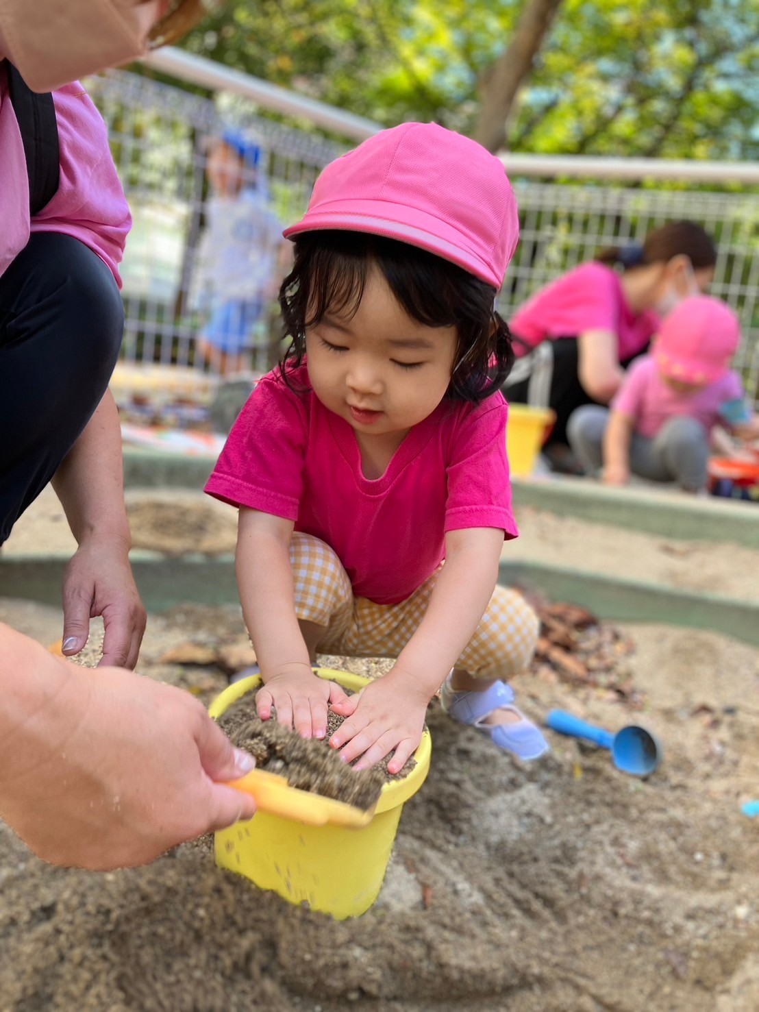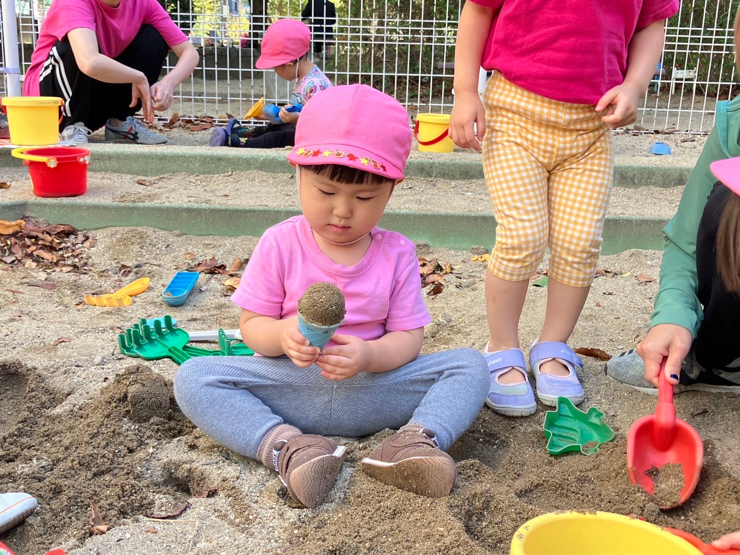 砂場遊びでは、黙々とそれぞれ好きな場所でスコップやバケツを持って遊んでくれていました。