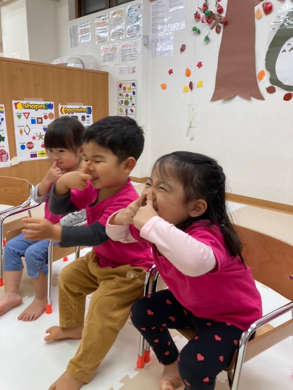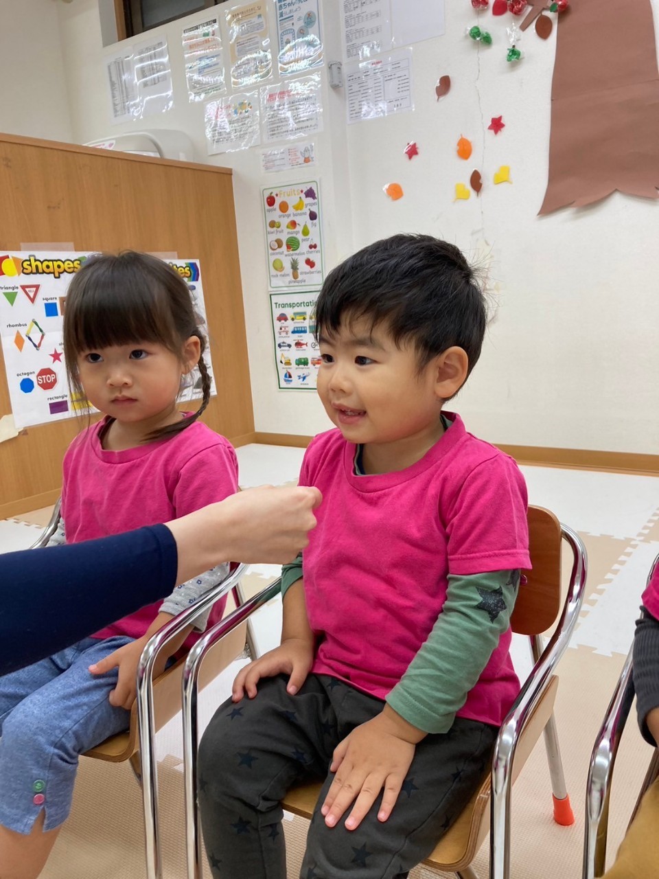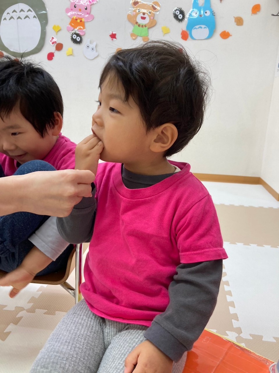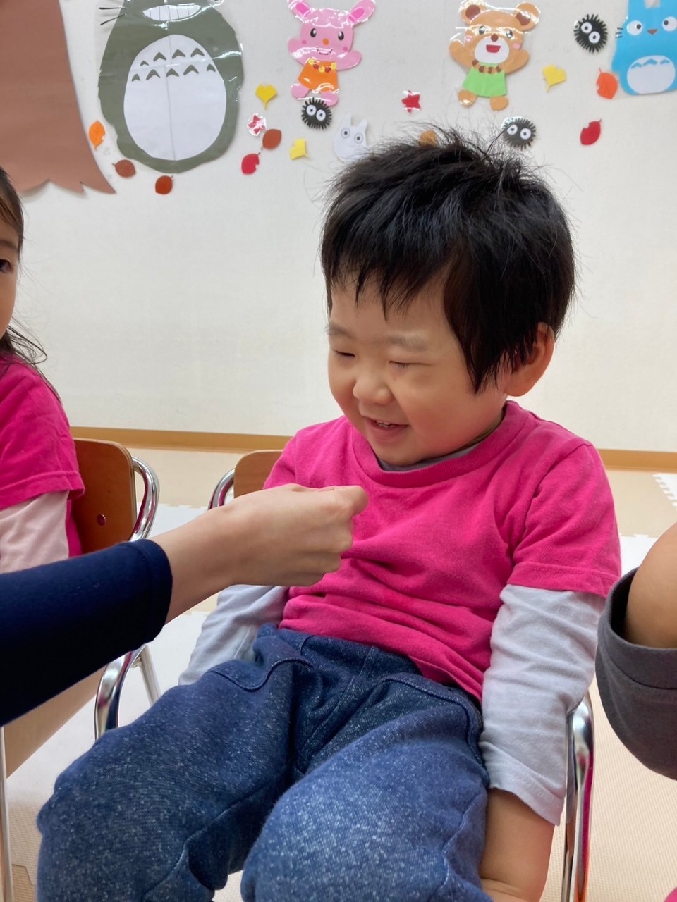 保育者が「お名前は?」と聞くと「〇〇です!」と少し恥ずかしそうにしながらも答えてくれます。