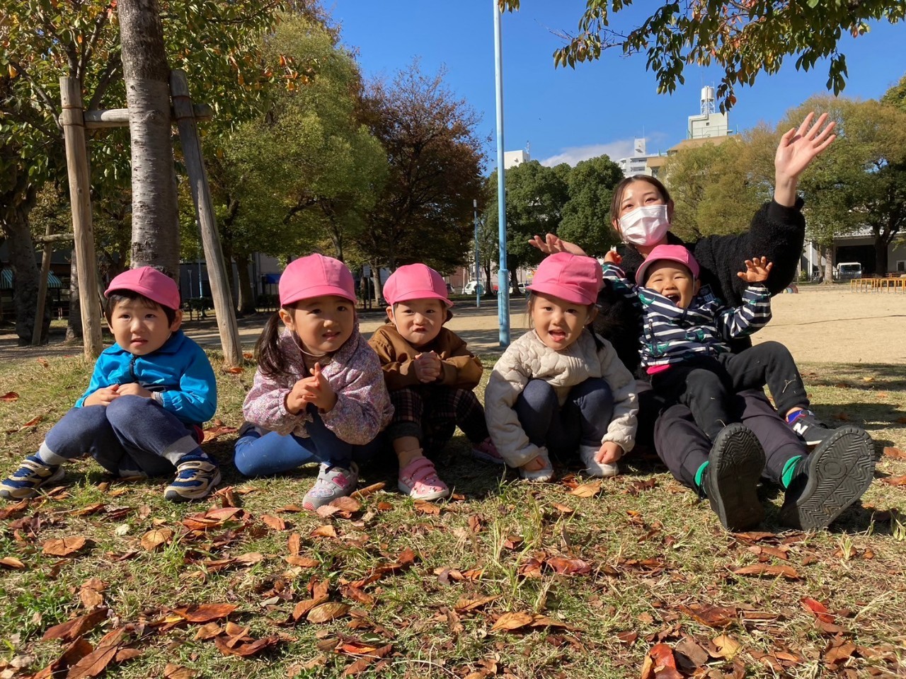 落ち葉を集めて保育者やお友だちの上からパラパラと落としてしてやったり♪