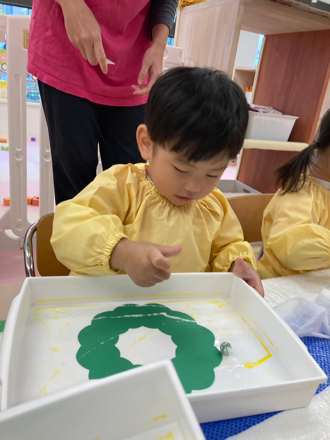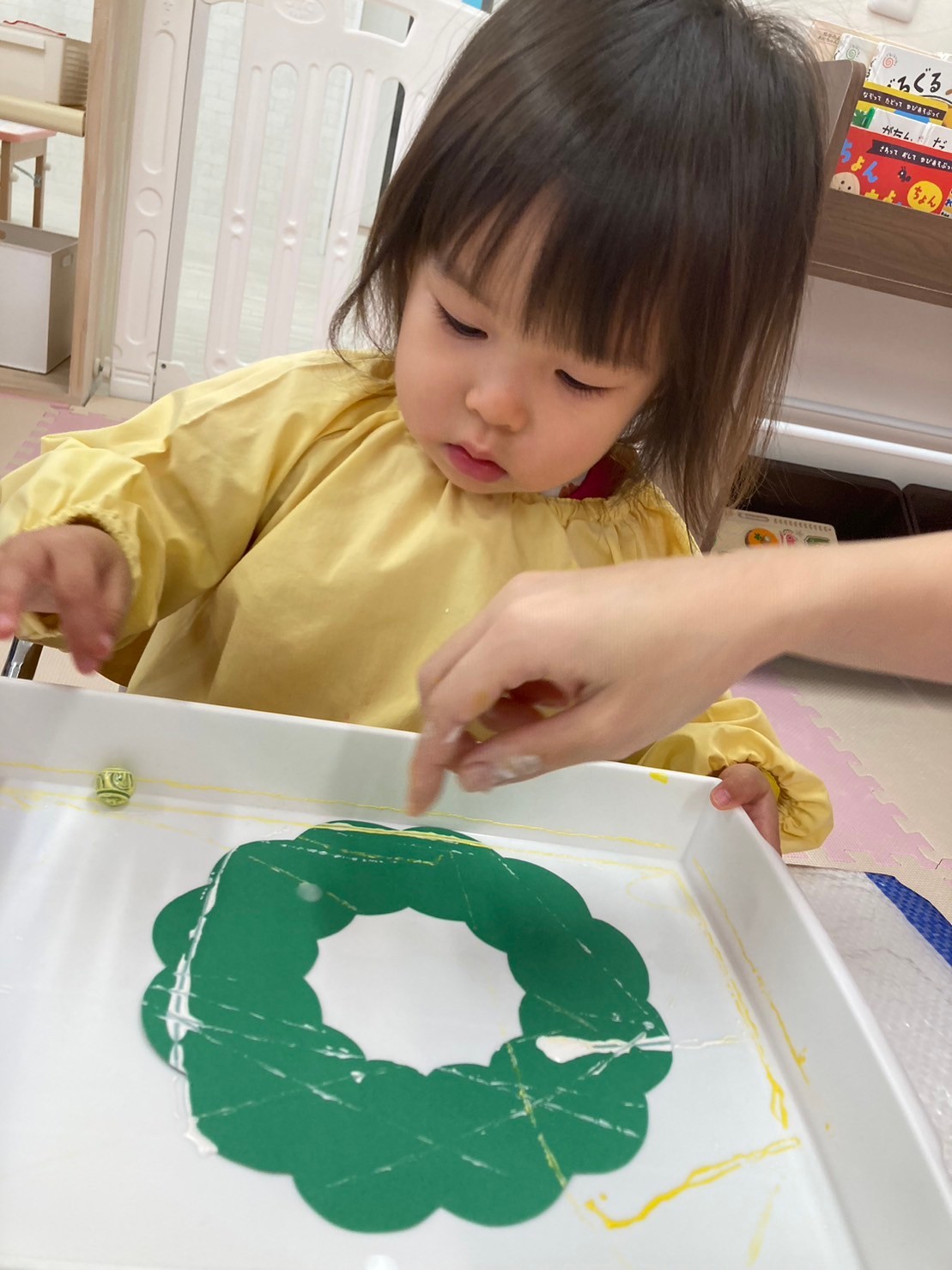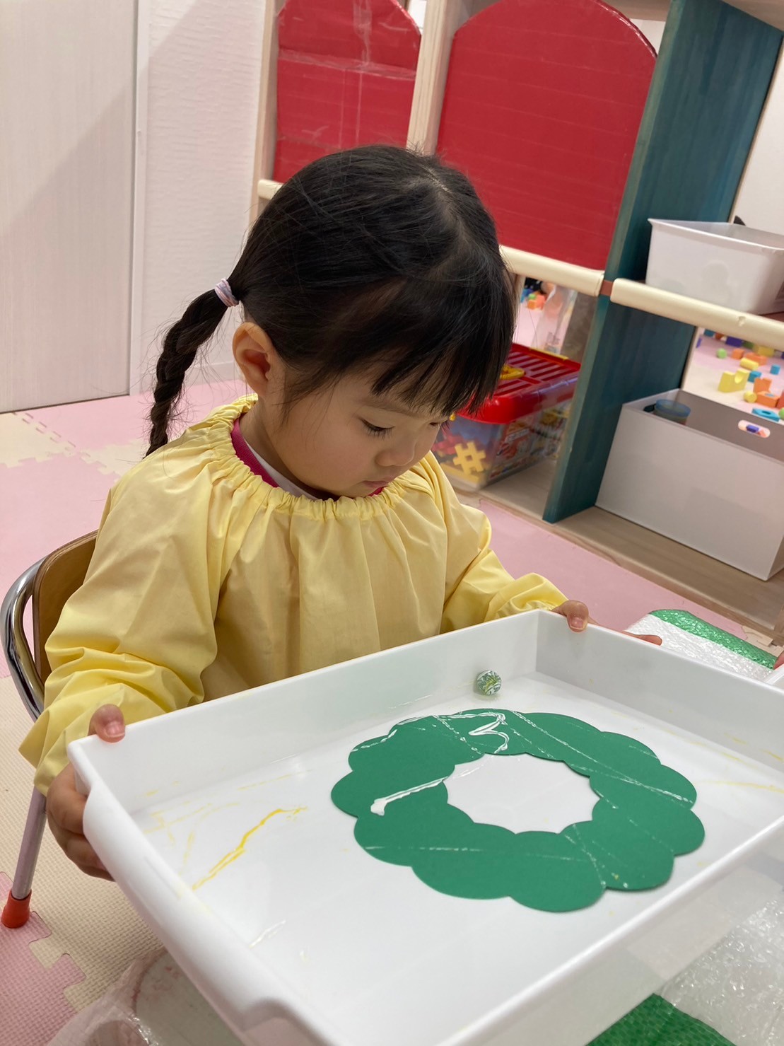 ビー玉に絵の具をつけて転がし、クリスマスのリースに模様をつけました。